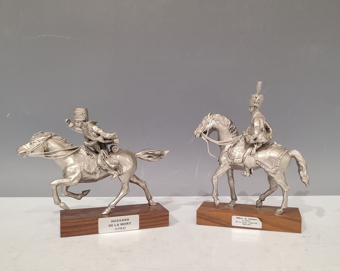 2 pewter subjects: death hussar and mounted chasseur officer. Height 12 and 16 cm. Boxes