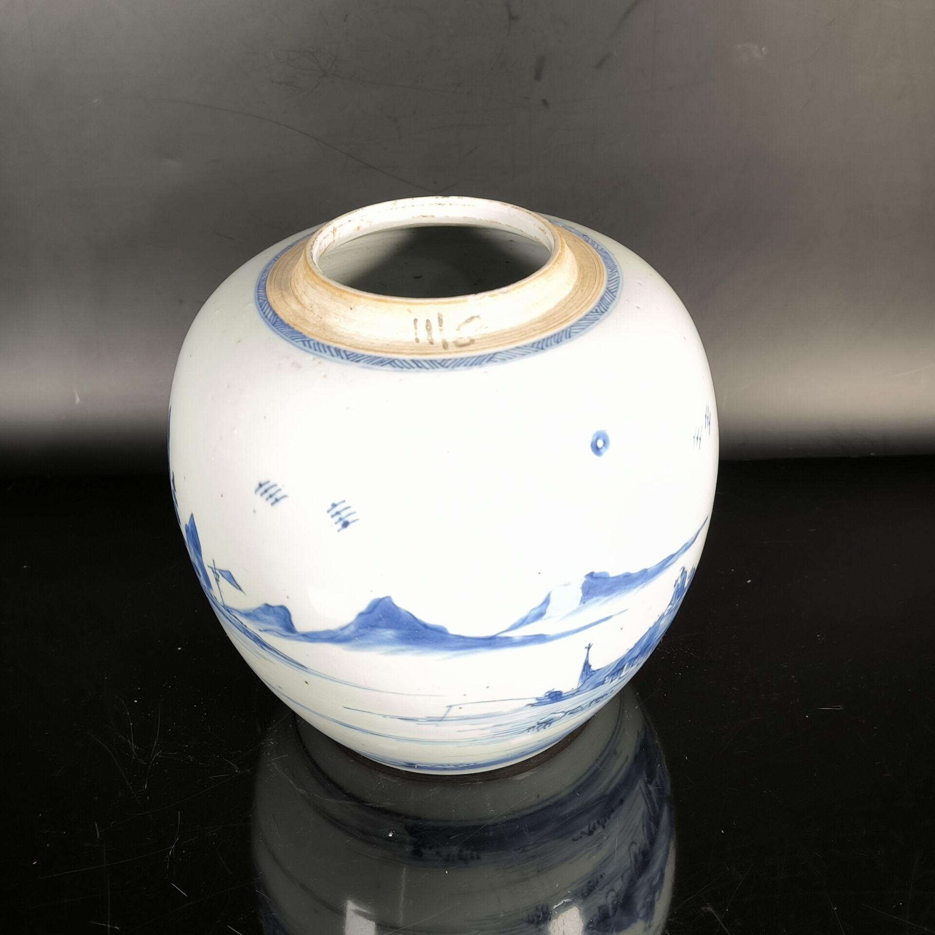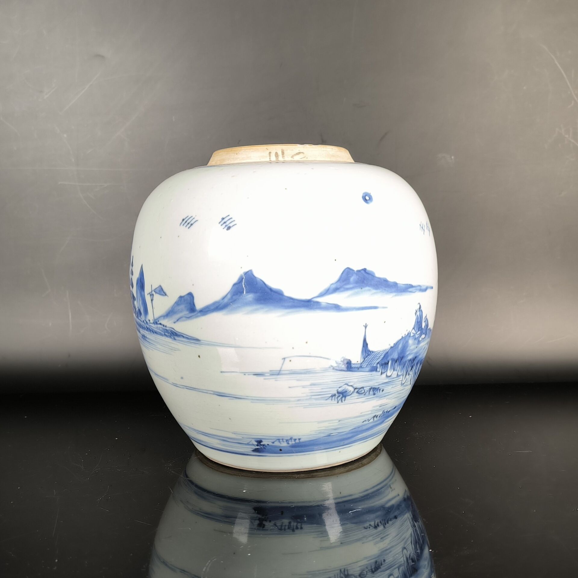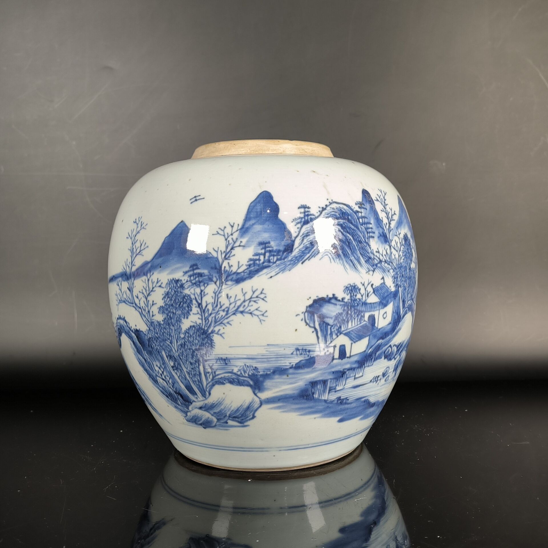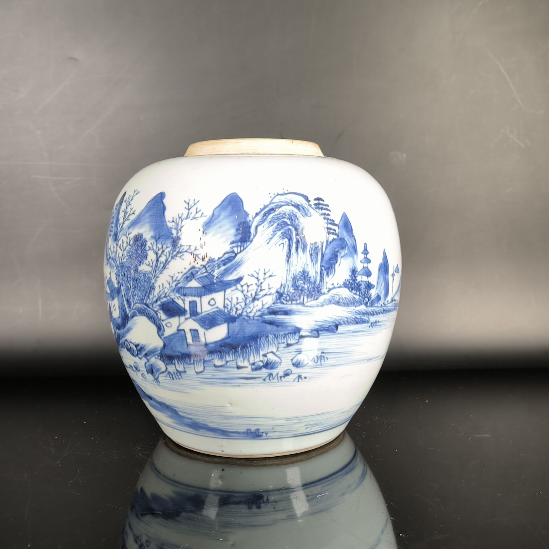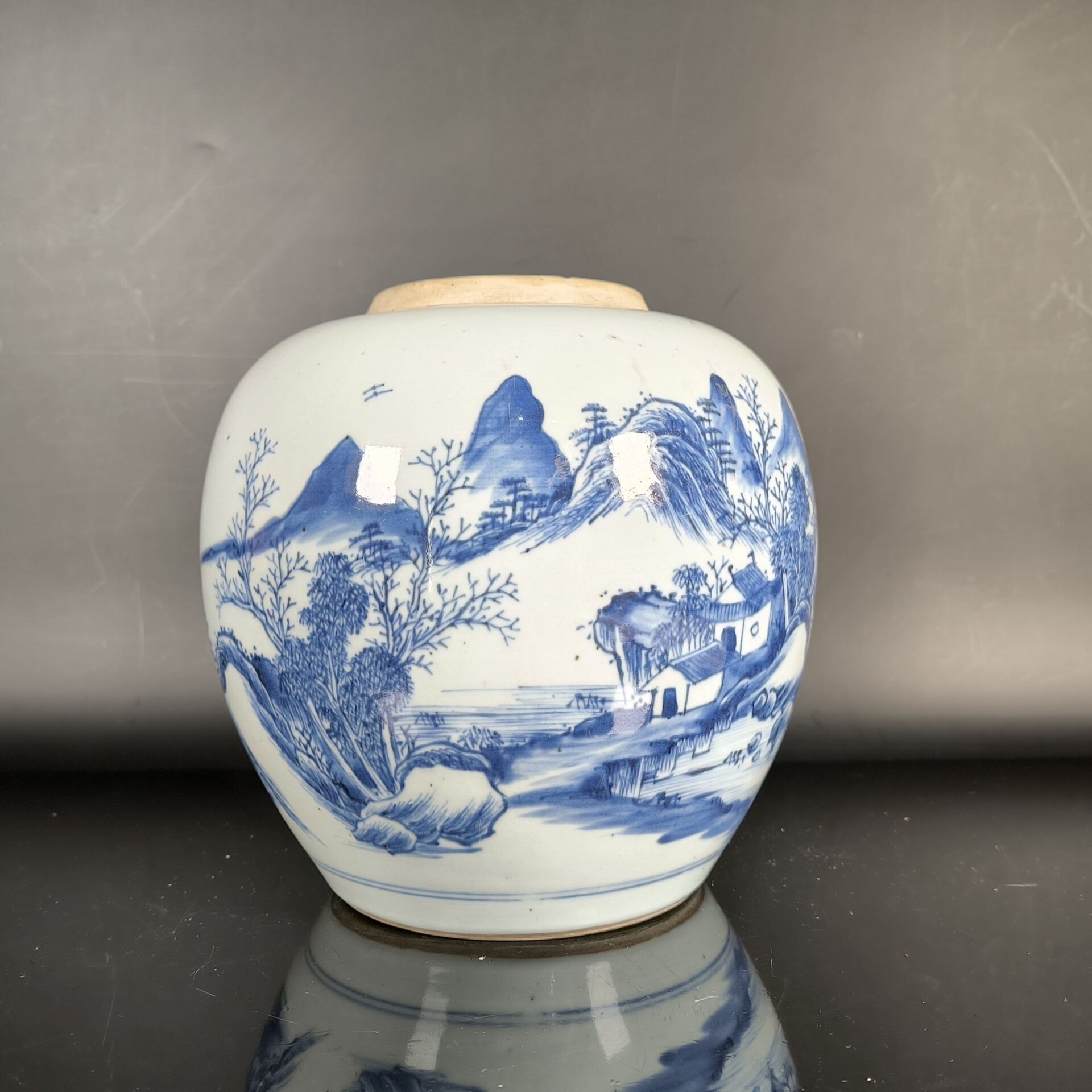 Porcelain ginger pot decorated in blue underglaze with a landscape of thatched cottages by a lake and mountains (lid missing). Height 21 cm