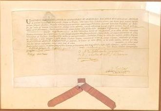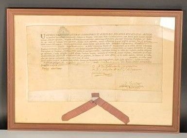 Diploma from the University of Angers, 1766, in the name of Antoine François BARBOT, maître es arts. Printed and handwritten parchment. 23 x 33 cm. Framed