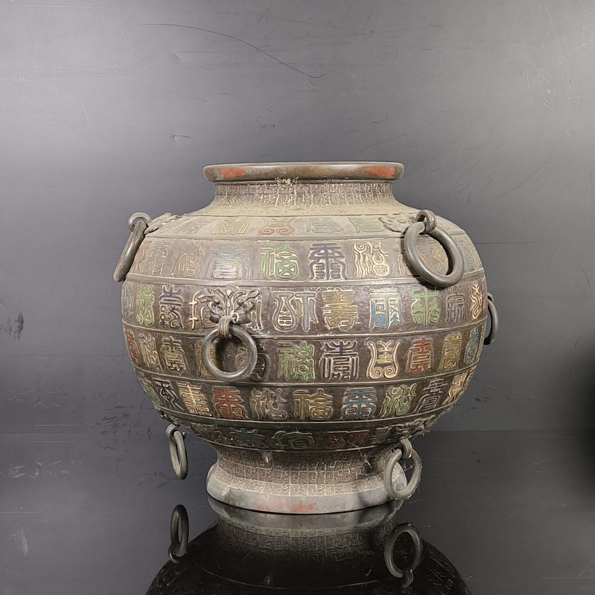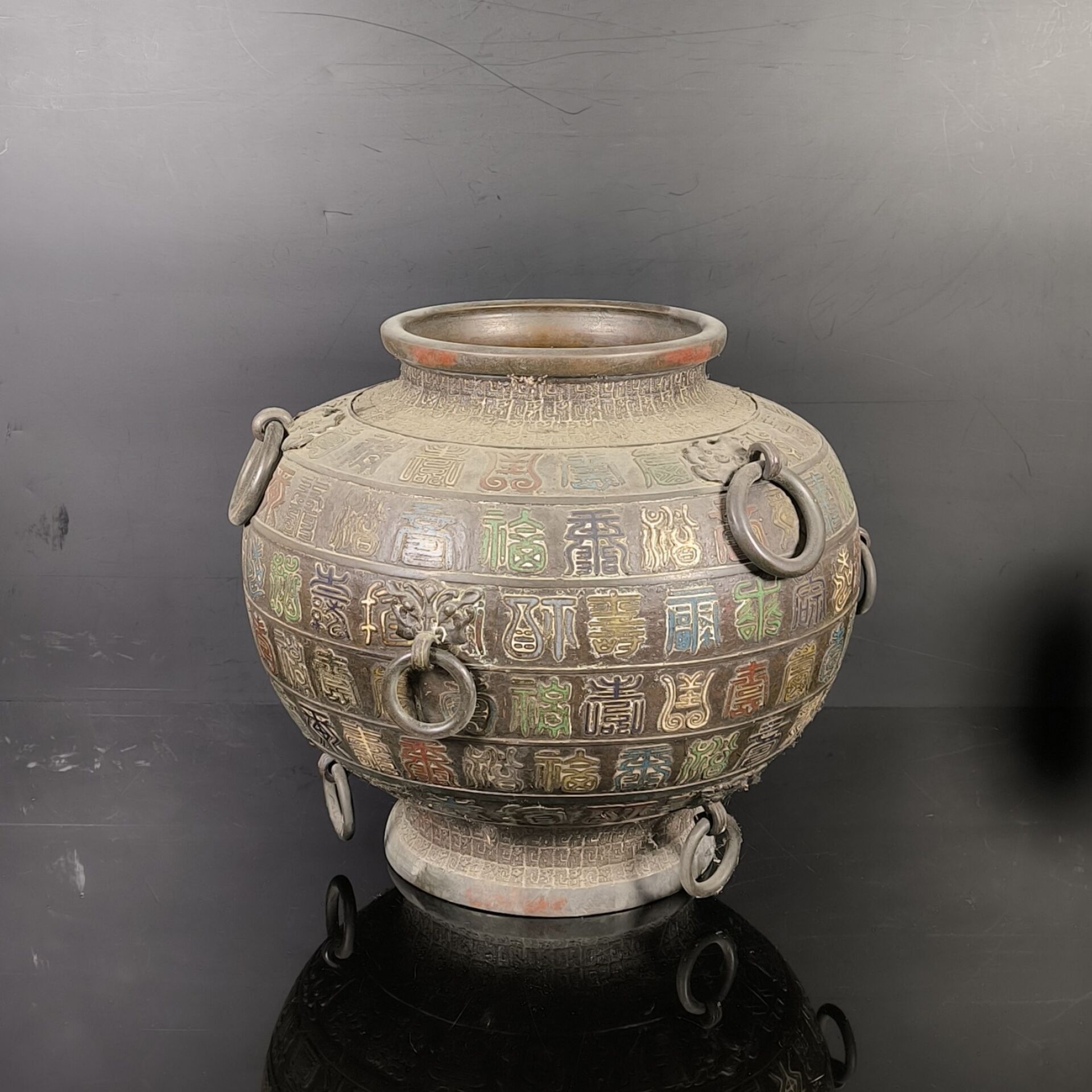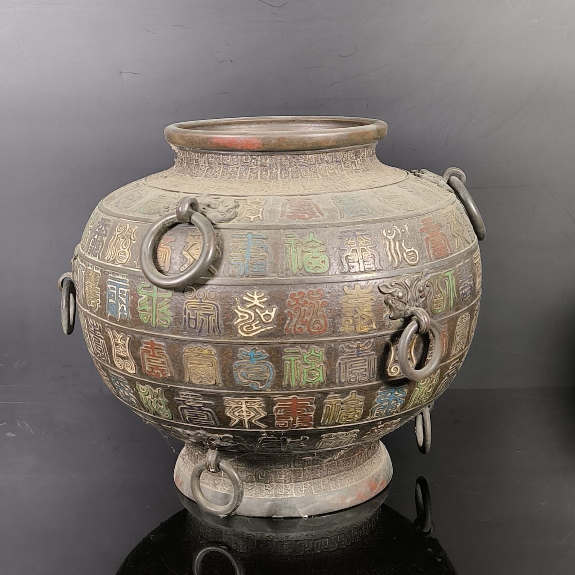 CHINA late 19th century. Enamelled bronze vase with 9 rings. Marked. Height 30, diameter 35 cm