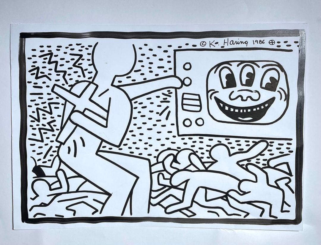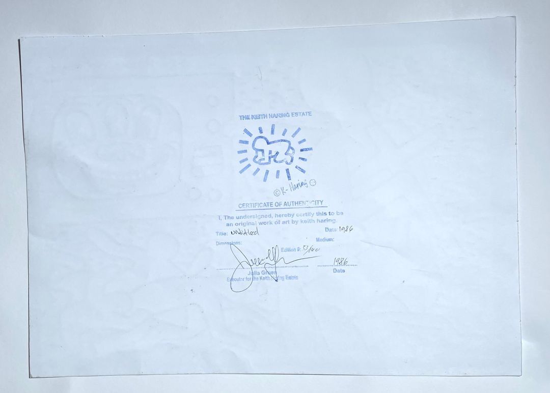 Felt pen signature lower right and stamped on the back "The Keith Haring Estate" with signature, date and annotations.