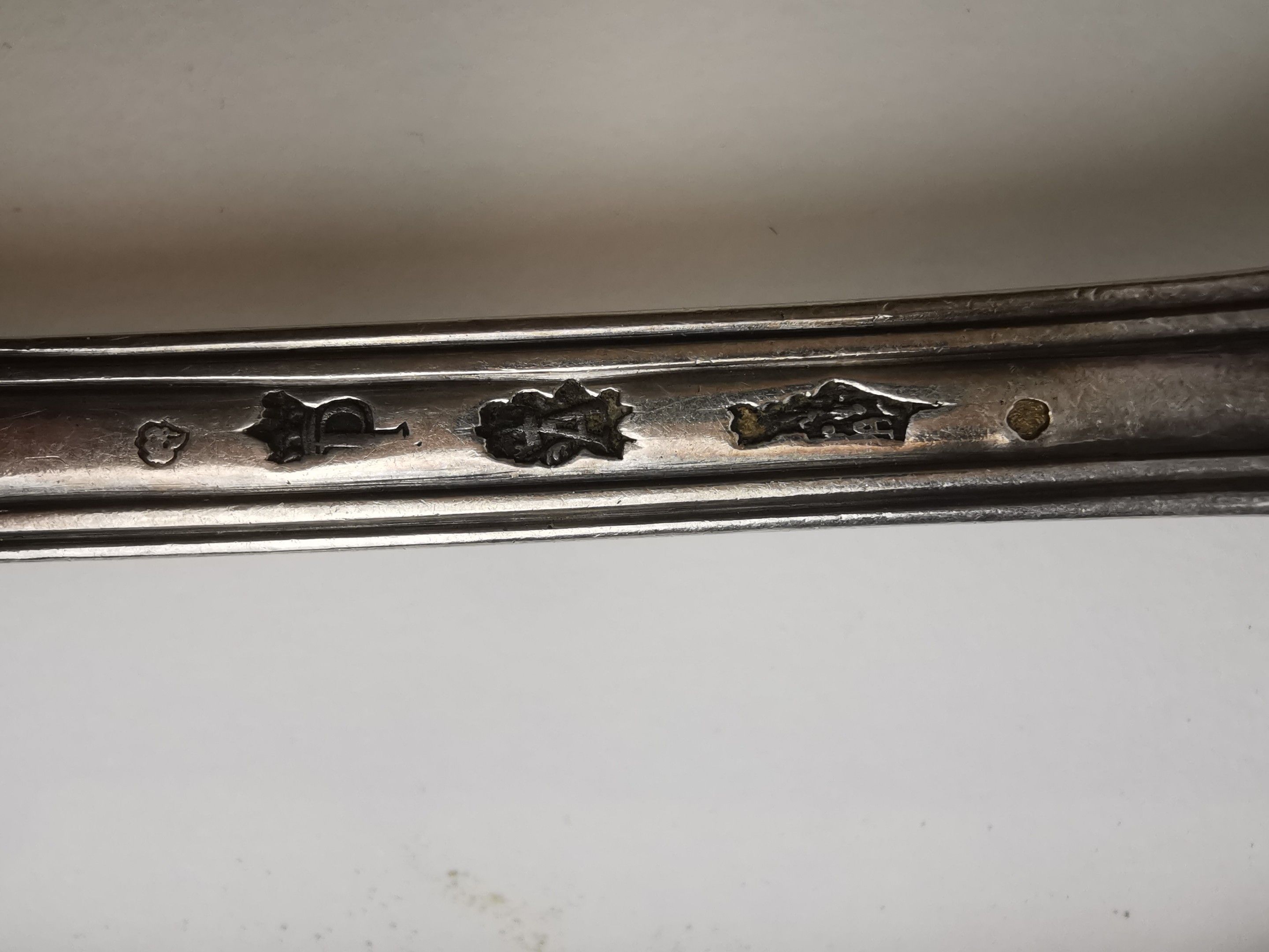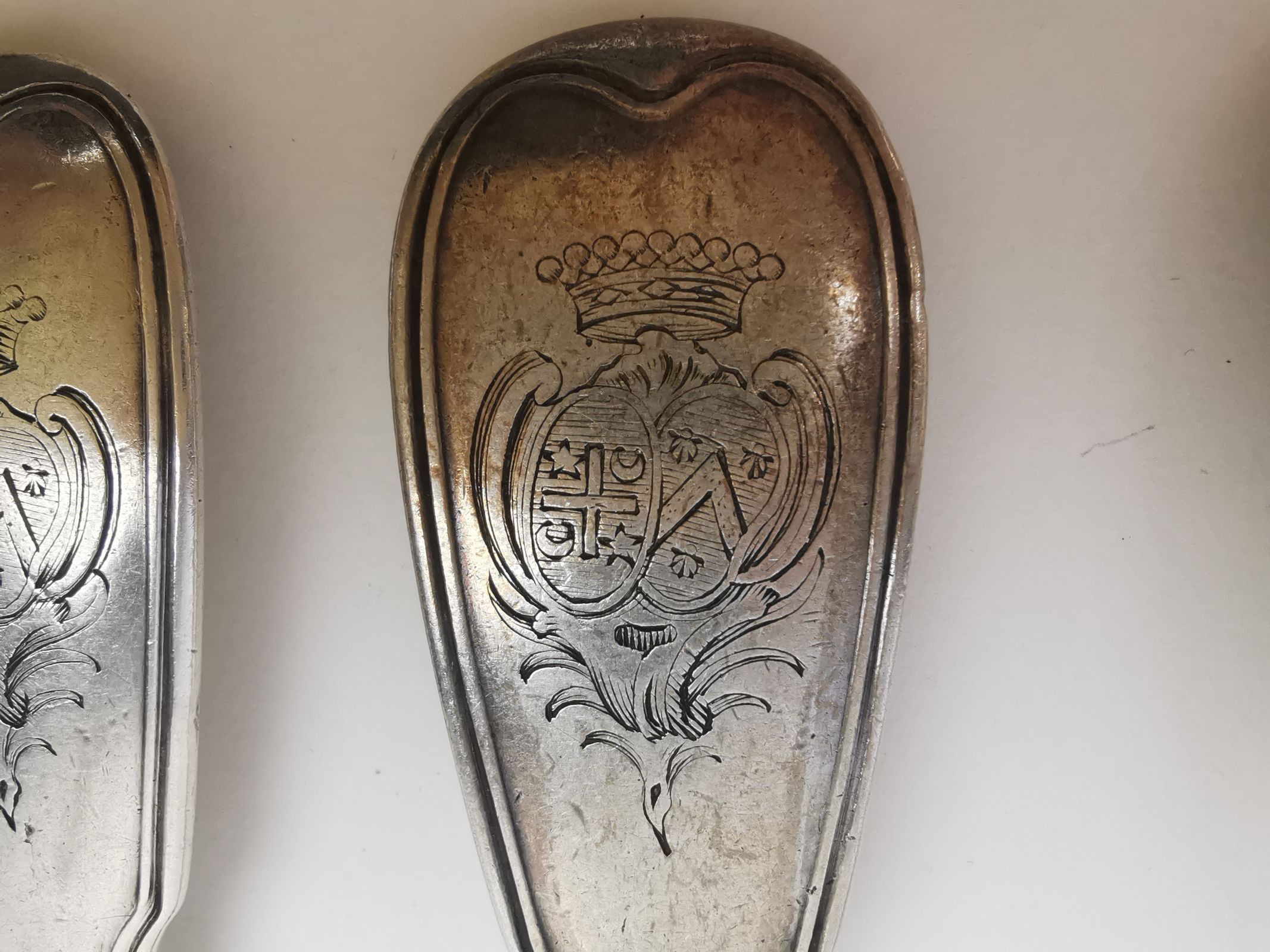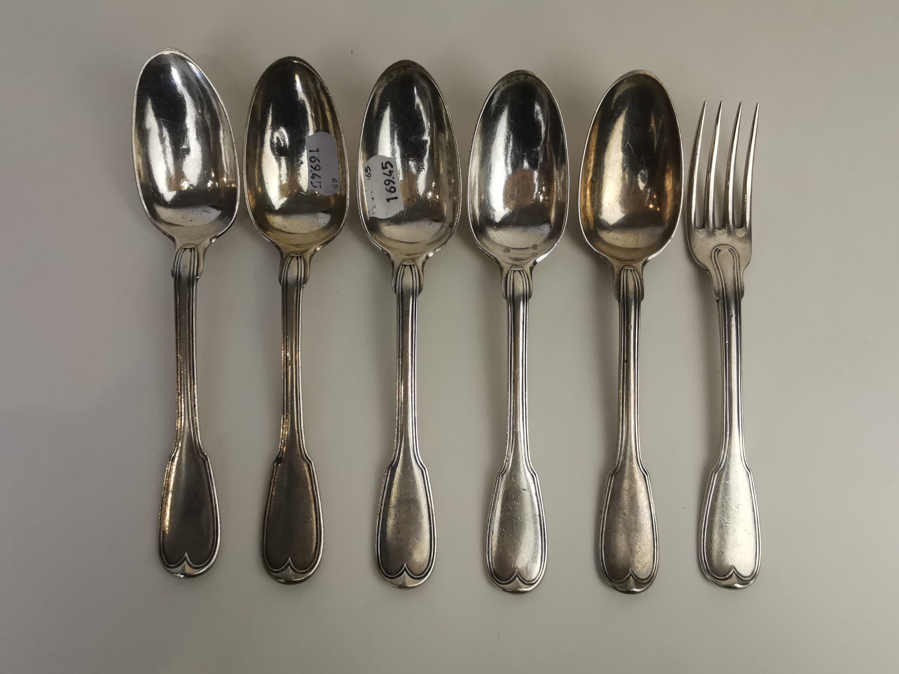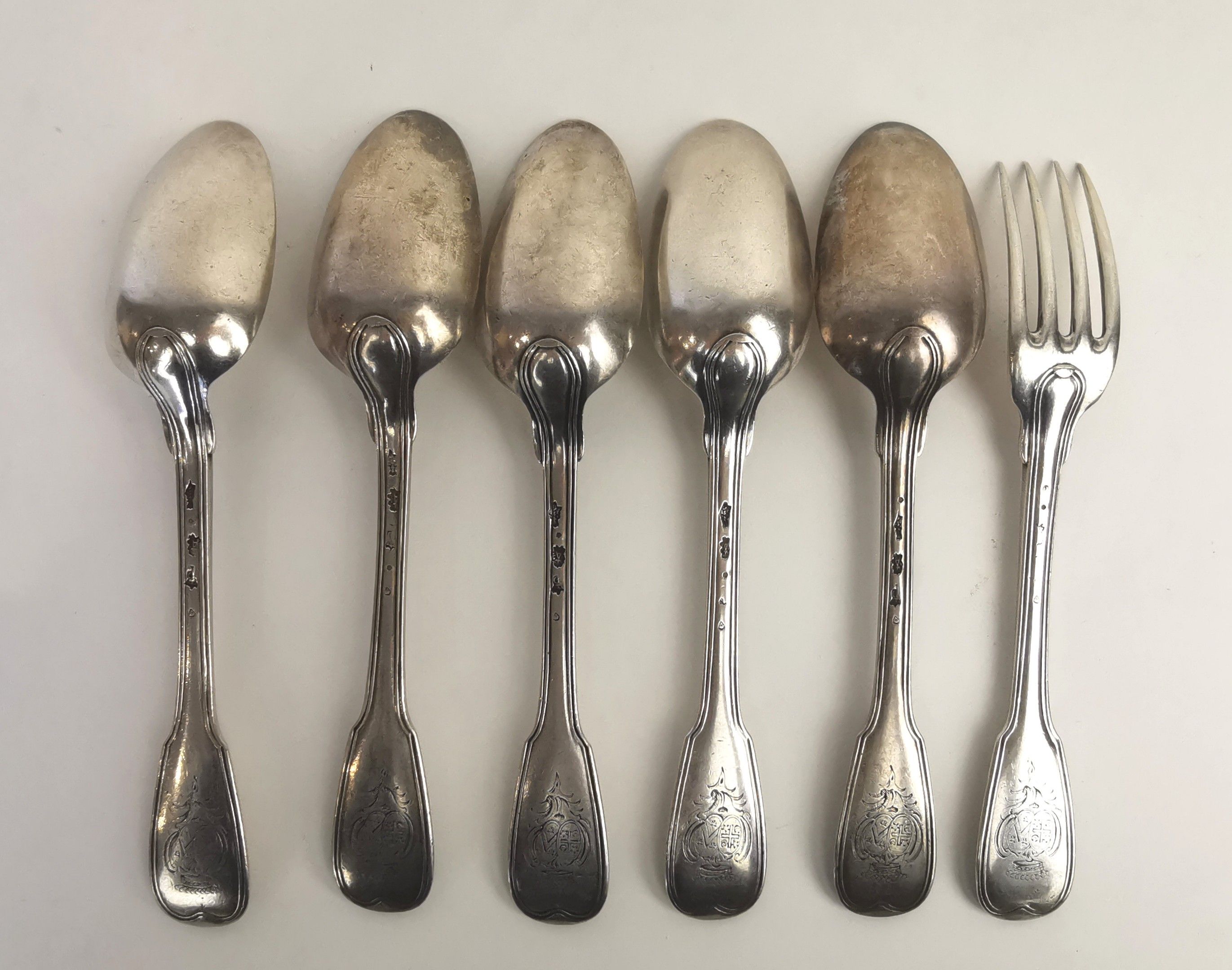 SERIES OF FIVE Soup spoons and a table fork in silver. PARIS, attributed to Antoine-François GROUVELLE (?), 1750-1756 (letter-date P). The spatula is engraved with a coat of arms stamped with a count's crown. Wear and cut sleeve. Weight 550g.
