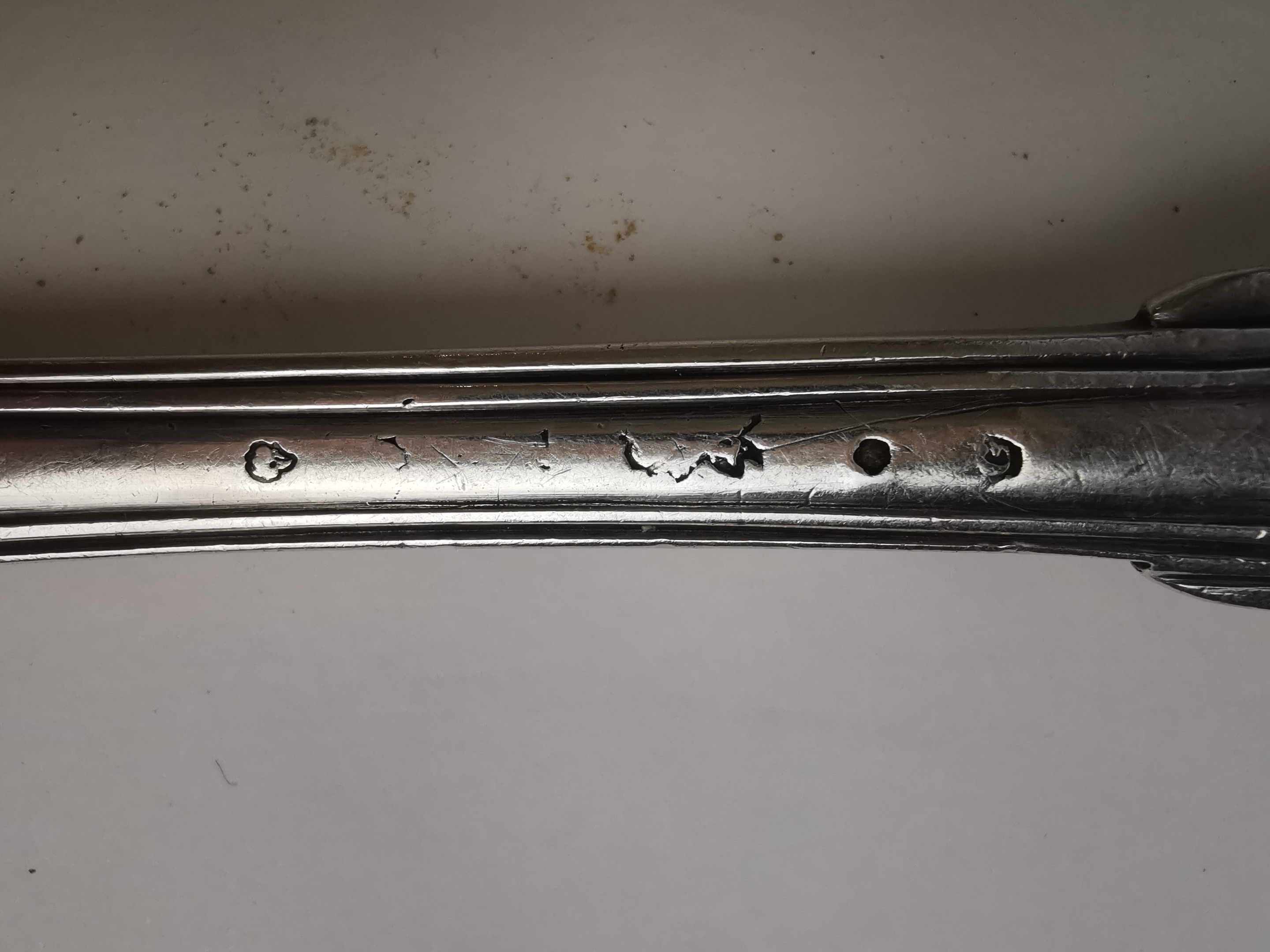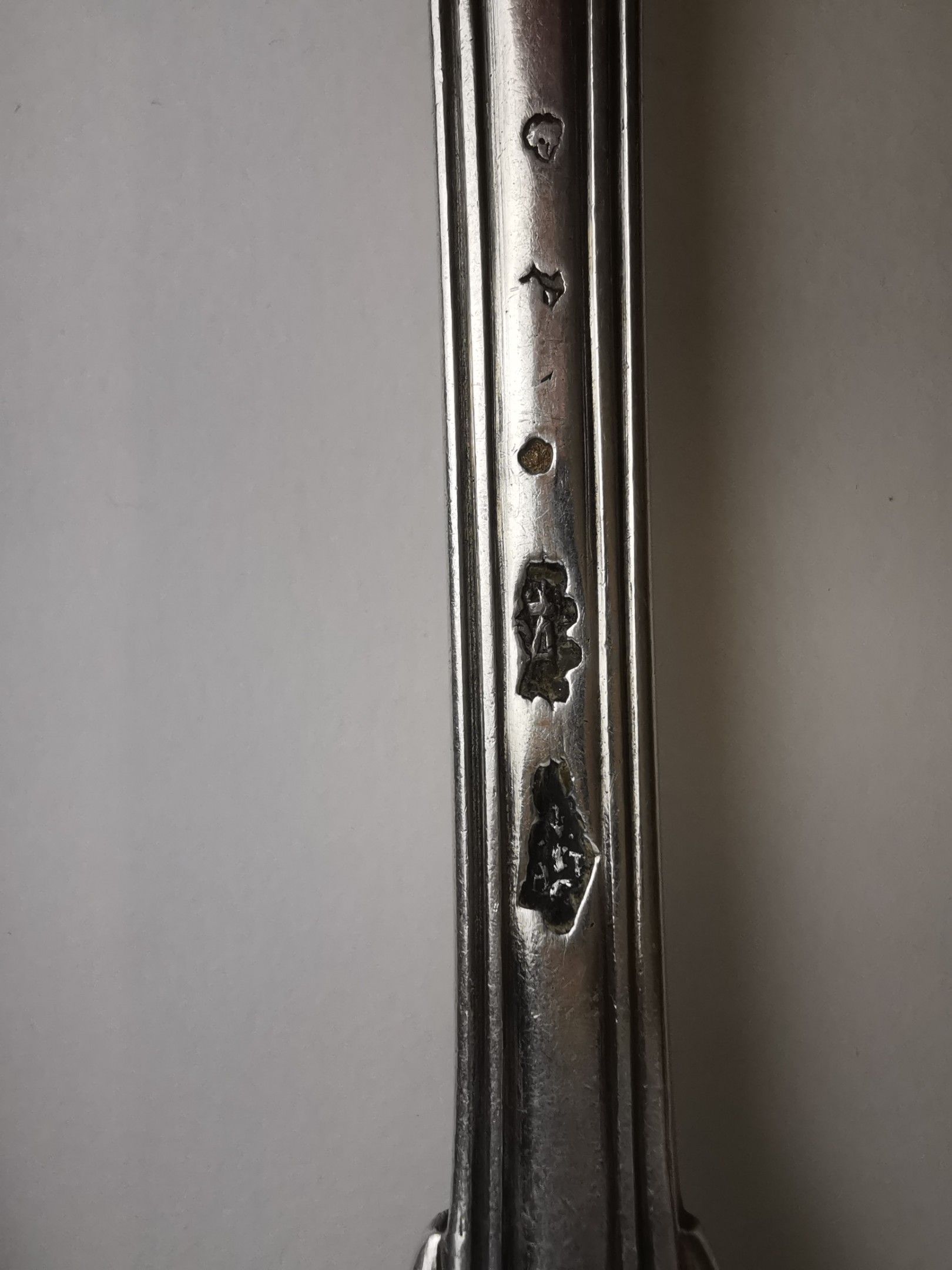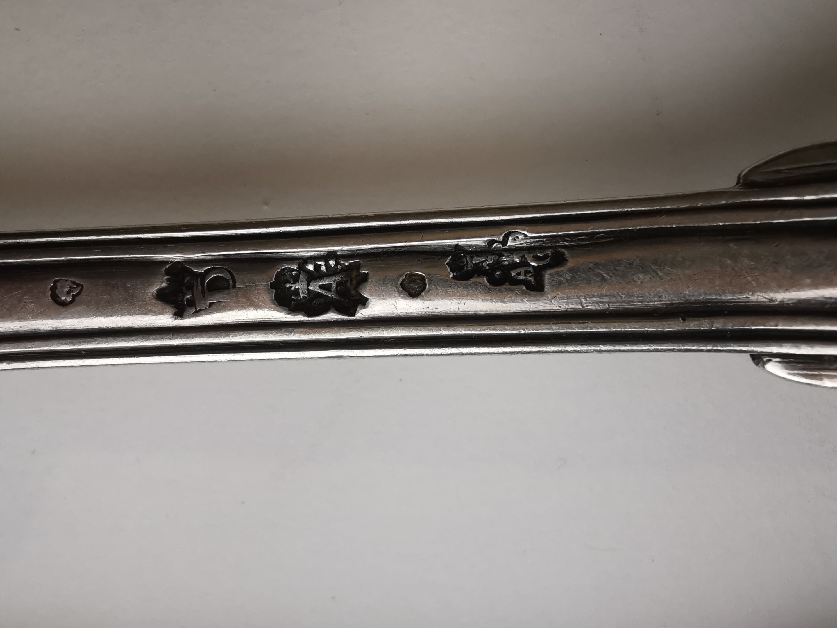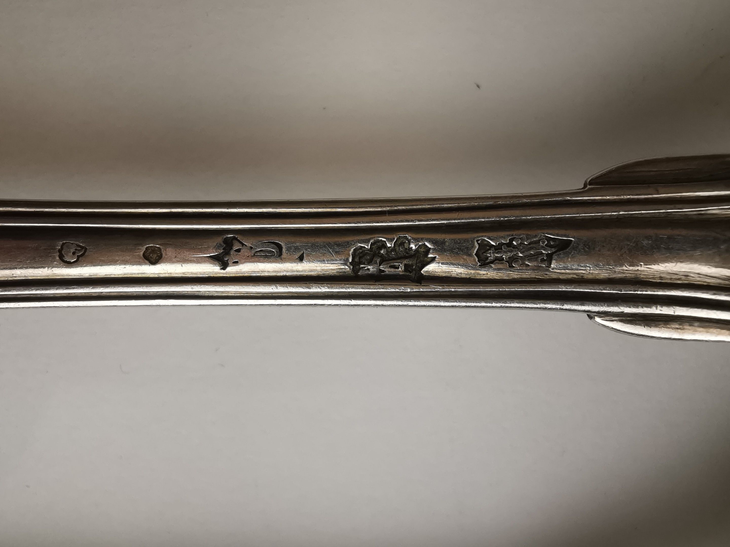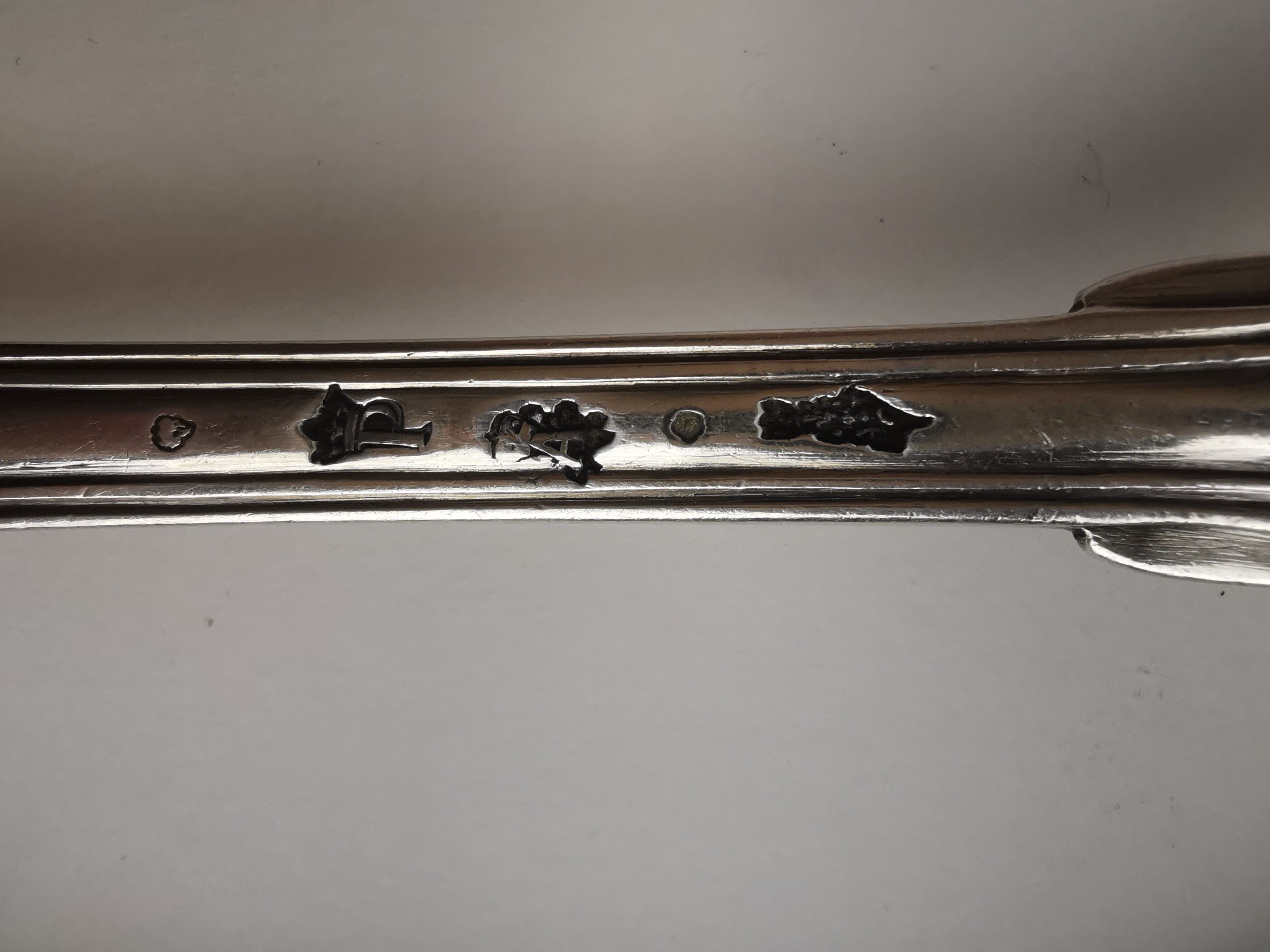 SERIES OF FIVE Soup spoons and a table fork in silver. PARIS, attributed to Antoine-François GROUVELLE (?), 1750-1756 (letter-date P). The spatula is engraved with a coat of arms stamped with a count's crown. Wear and cut sleeve. Weight 550g.