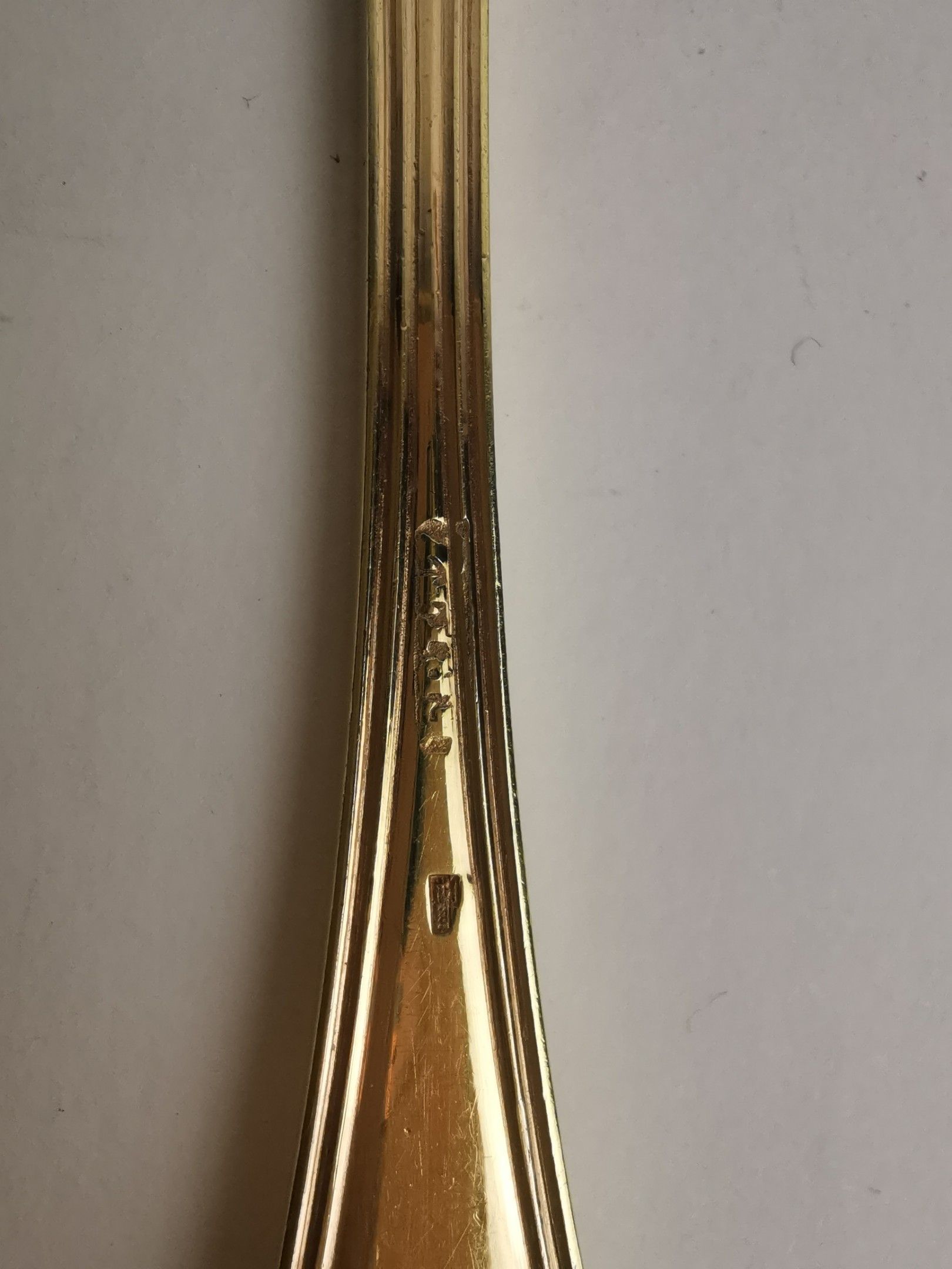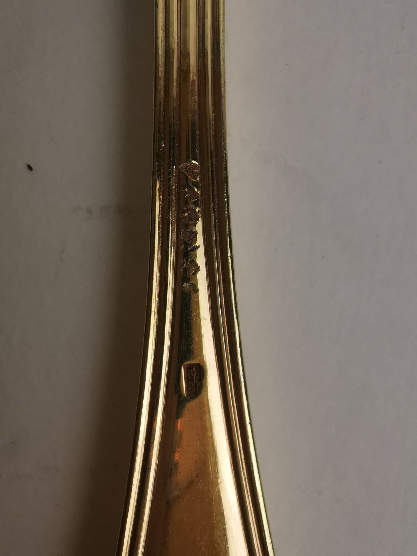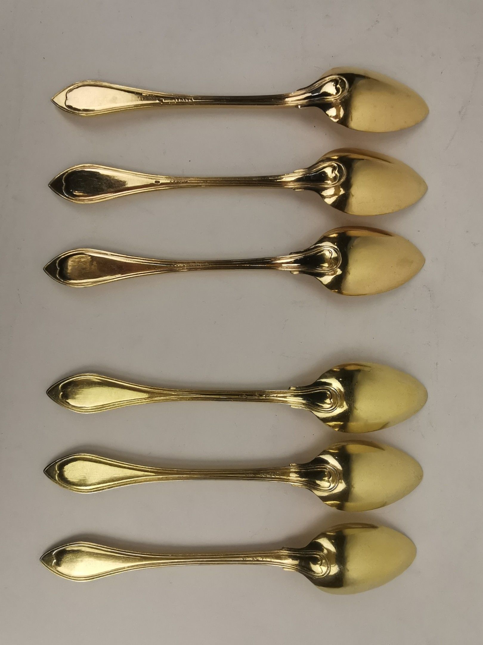 - six tea spoons, filleted model with pointed spatula: mark "FRITZ (?)" and mint mark 1798-1809 (lictor beam) (for 3 spoons), illegible marks (for 3 spoons). Two different gildings.