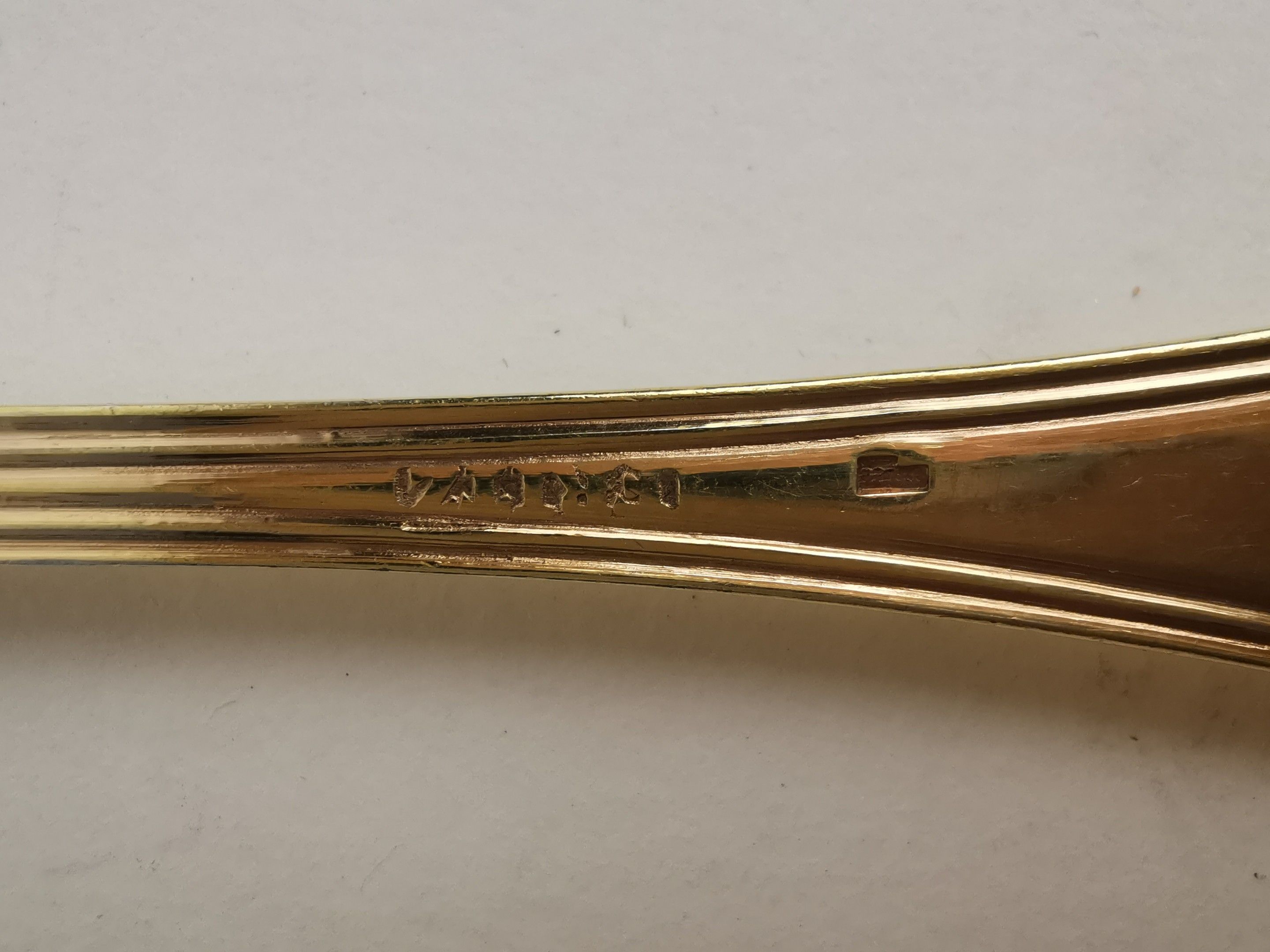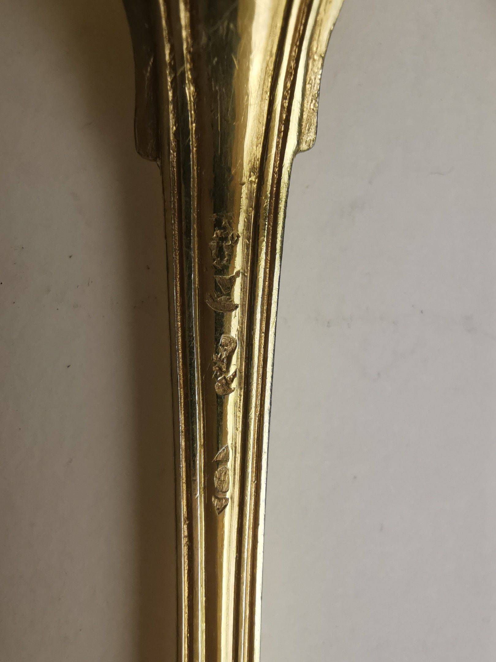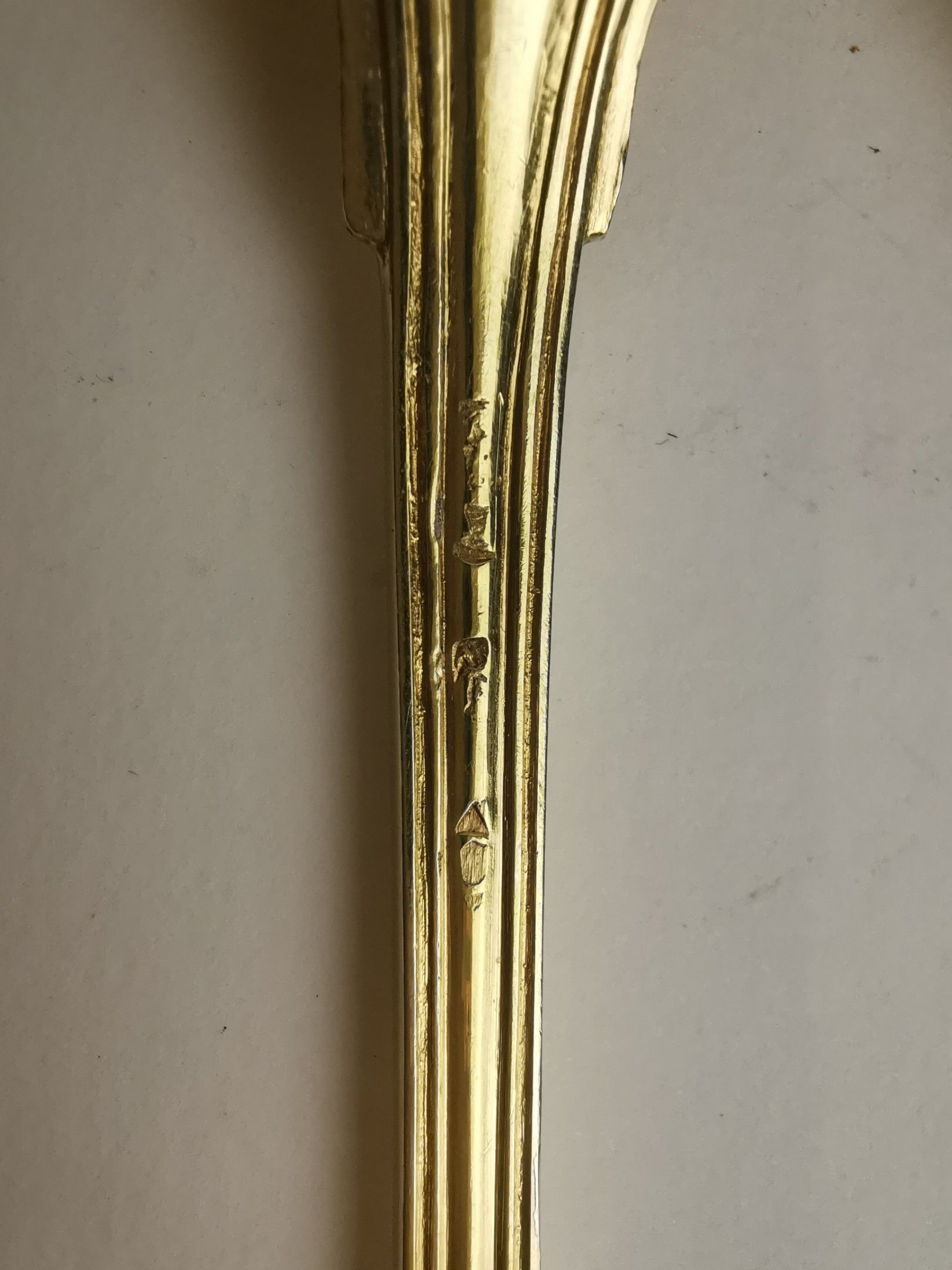 - six tea spoons, filleted model with pointed spatula: mark "FRITZ (?)" and mint mark 1798-1809 (lictor beam) (for 3 spoons), illegible marks (for 3 spoons). Two different gildings.