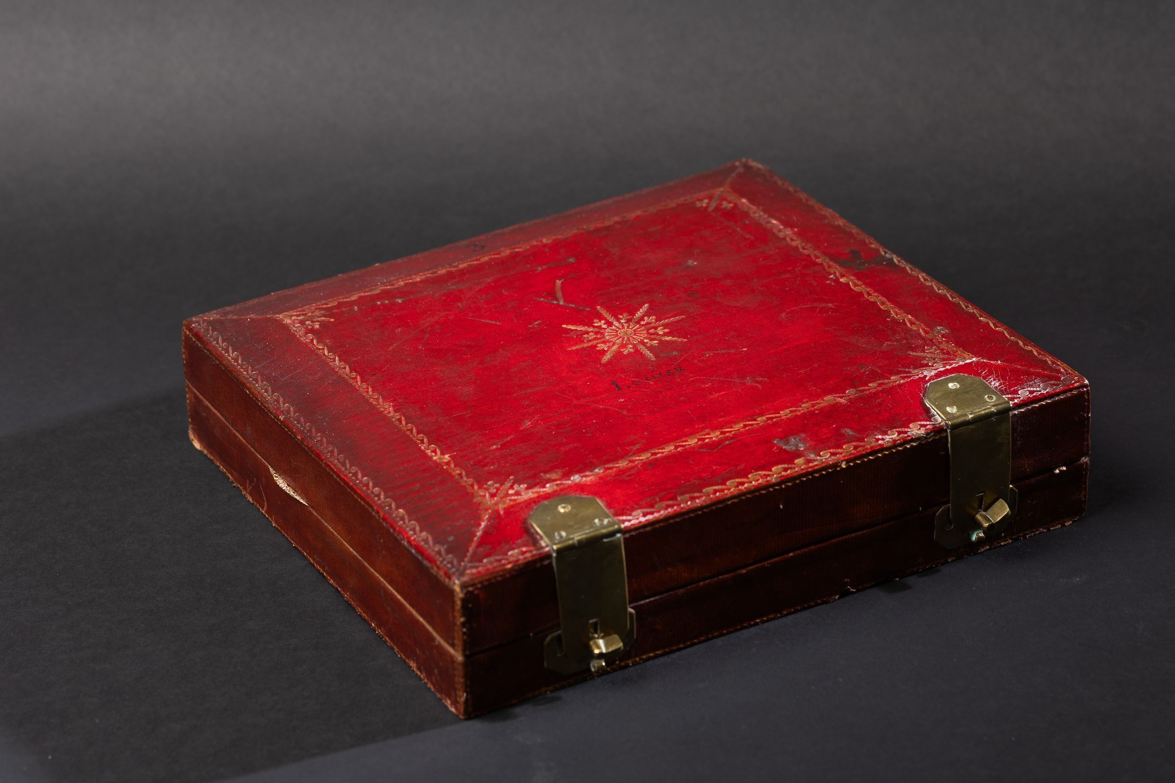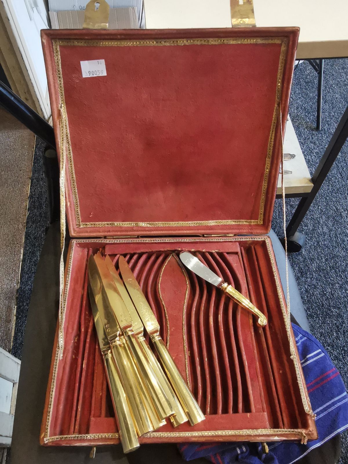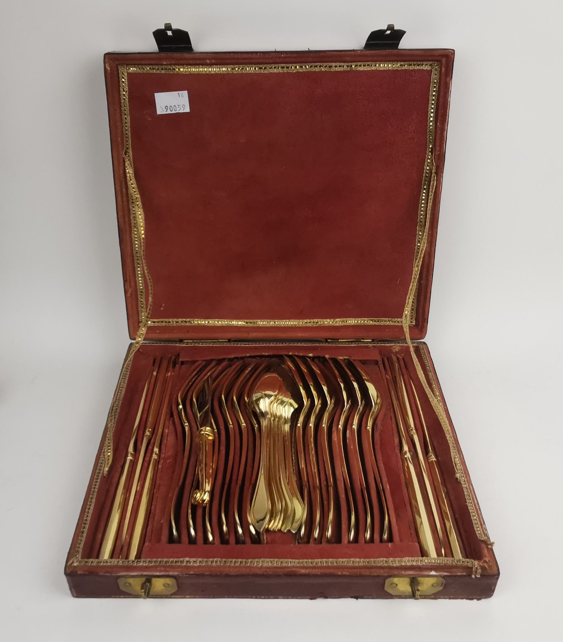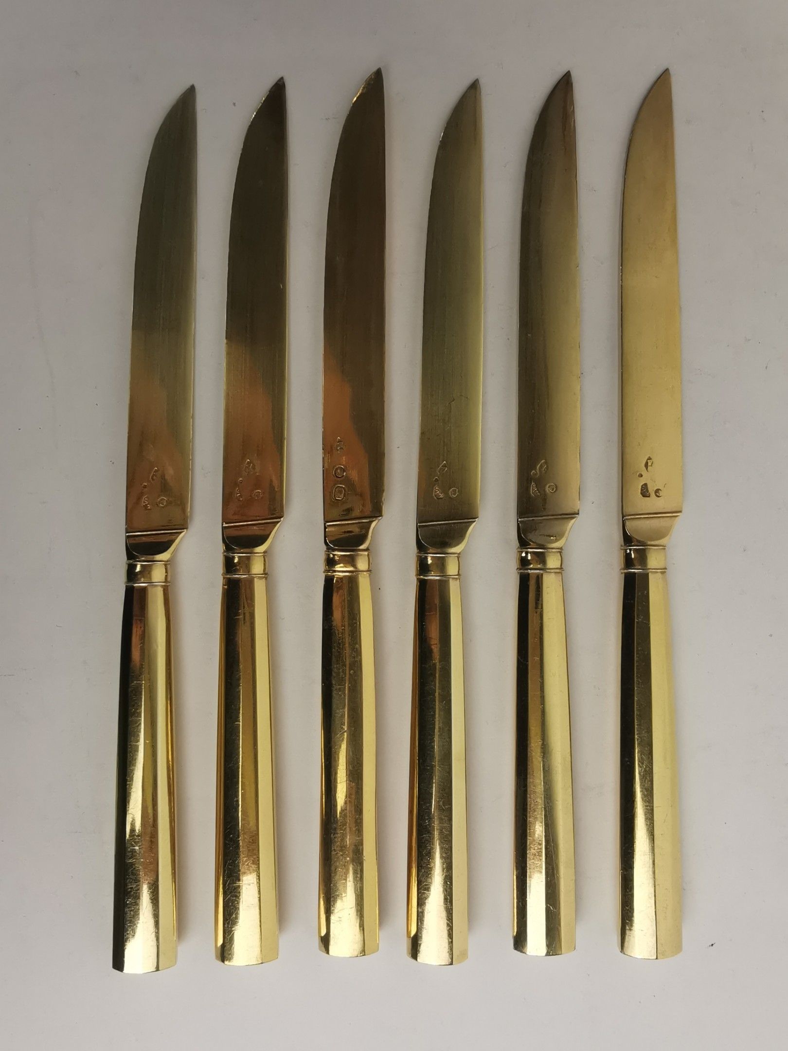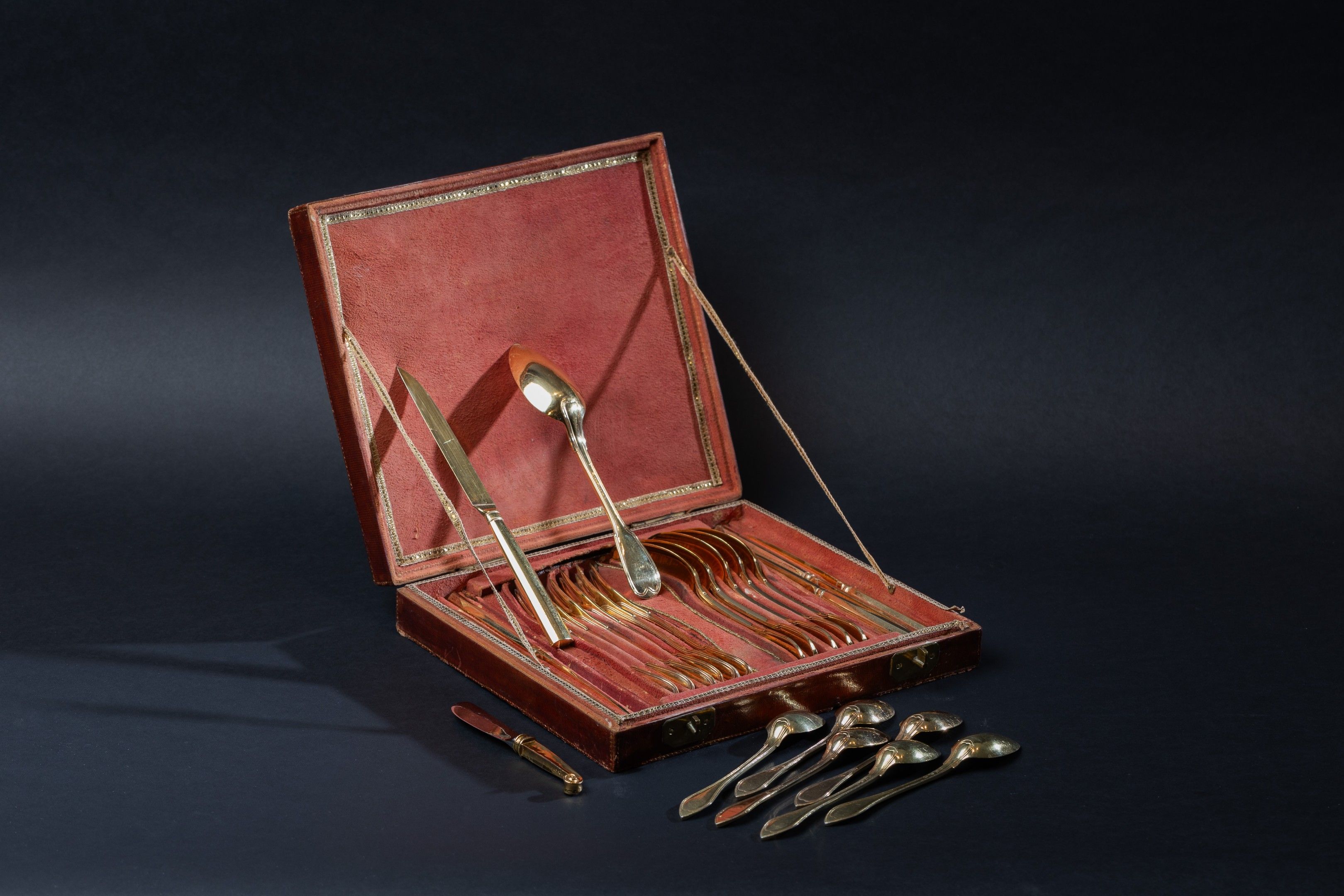 TABLE SET in silver gilt (800 and 925) (24 pieces, 3 models). STRASBOURG, Jean-Geoffroy FRITZ, 1798-1819. It includes six table settings, six tea spoons, six knives. The pieces are presented in a square box with compartments (except for the small spoons), covered with red leather, decorated with gilded iron friezes and a central rosette with the first name Louise and the number 3 in black ink, brass fittings, gilded lamé braid inside.