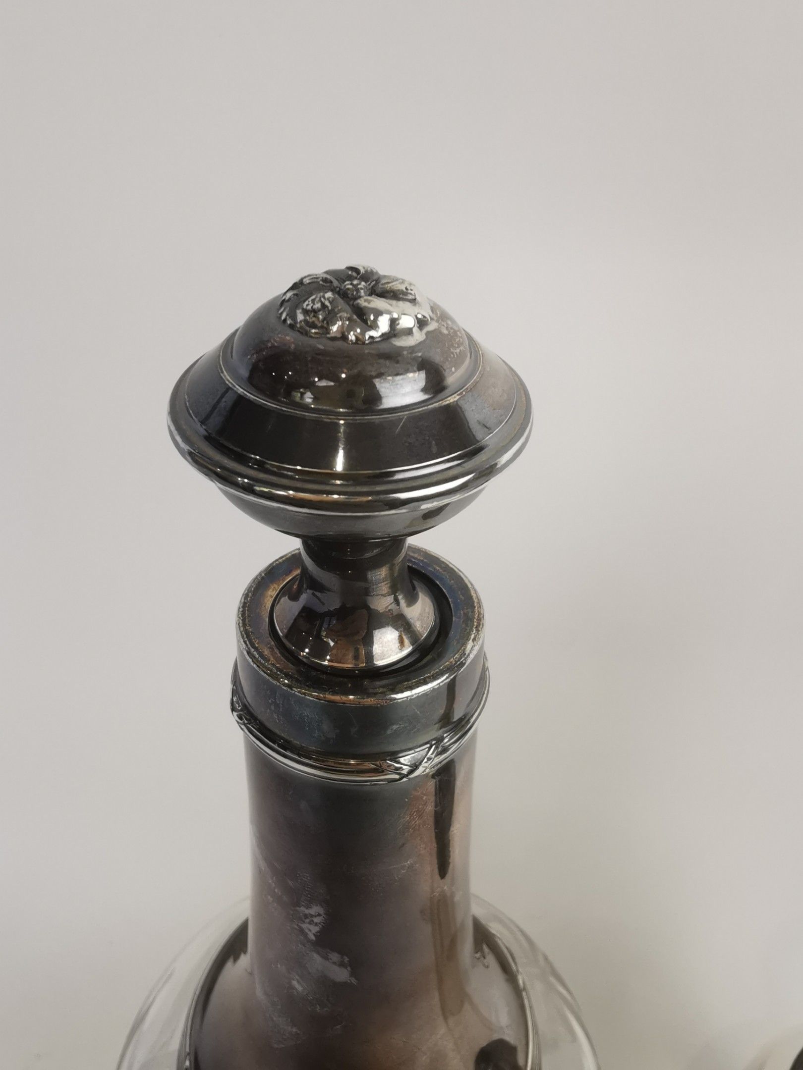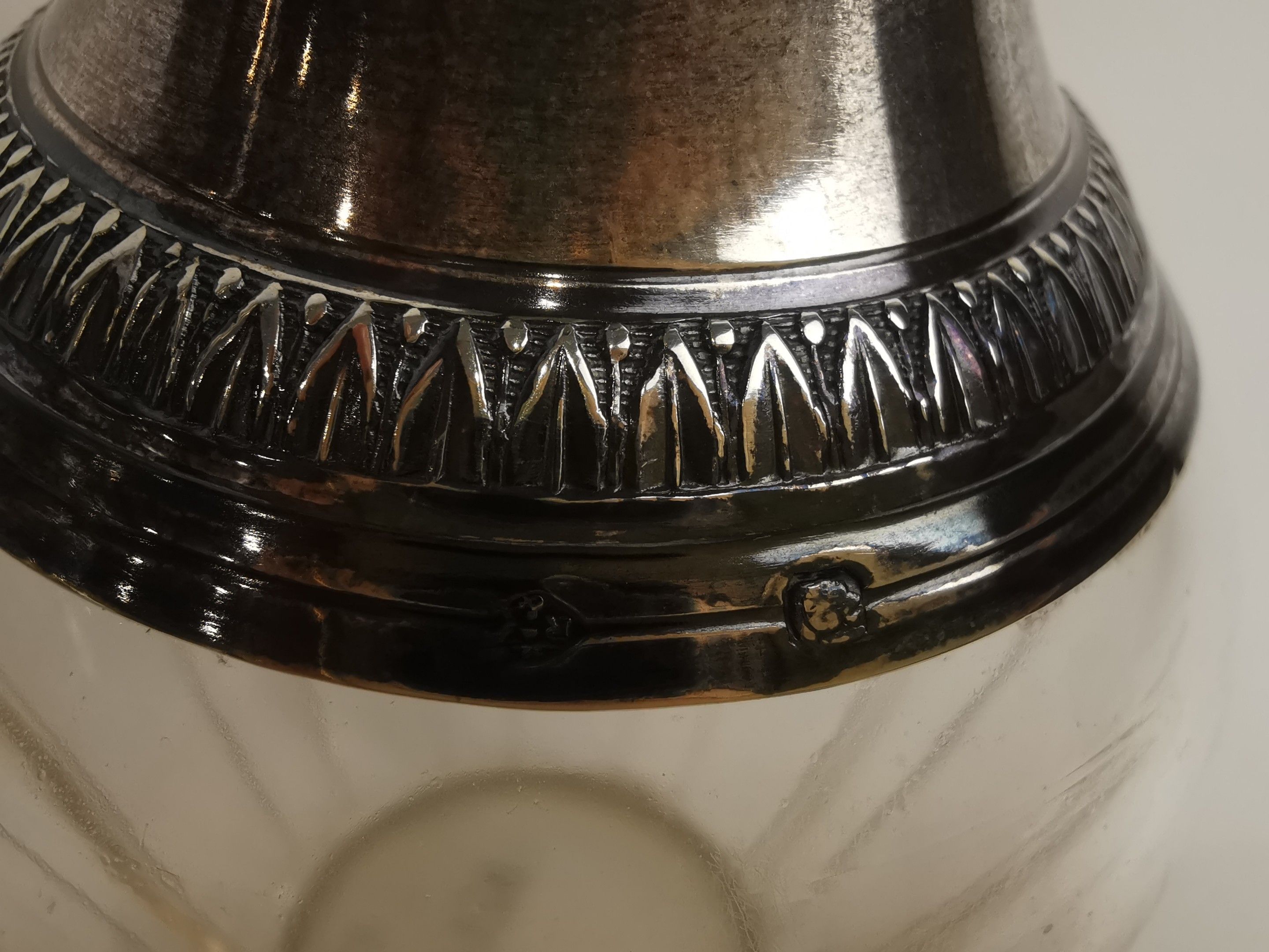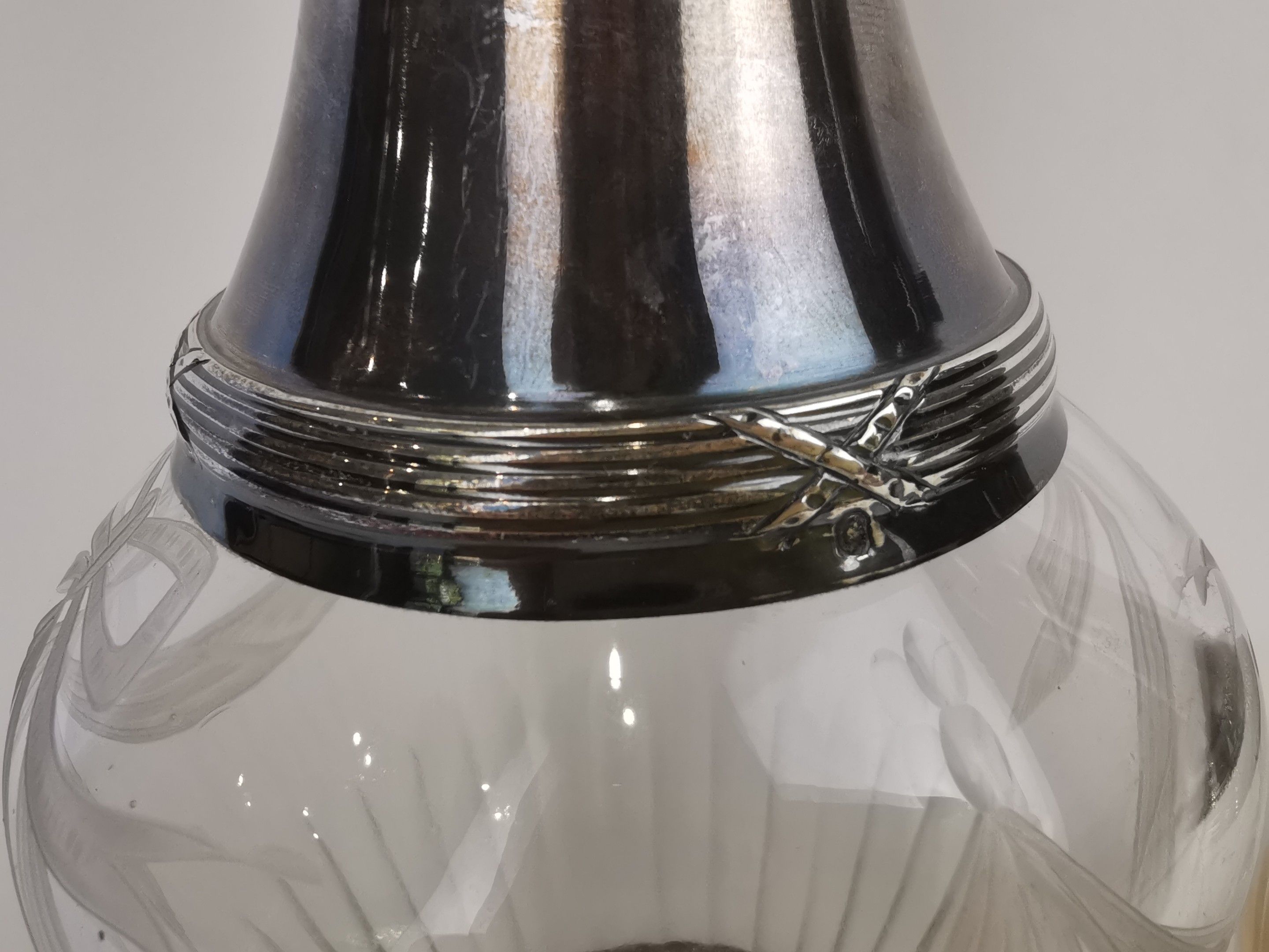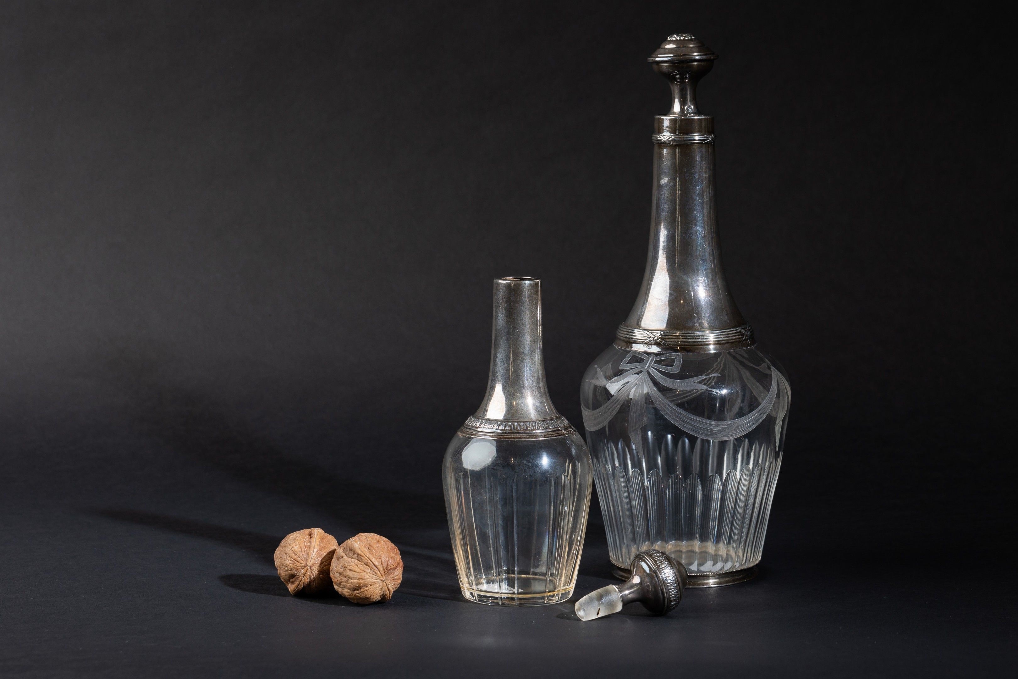 - Large decanter: PARIS, LAGRIFFOUL ET LAVAL, 1899-1972 (Minerve). Silver-rimmed base, crystal body with fluted base engraved with ribbon bows and draperies, the neck trimmed in silver with crossed ribbon fillet mouldings, the stopper moulded and topped with a flowered rosette. Minor damage to the base on the rim. Height 29 cm; Gross weight 645 g.