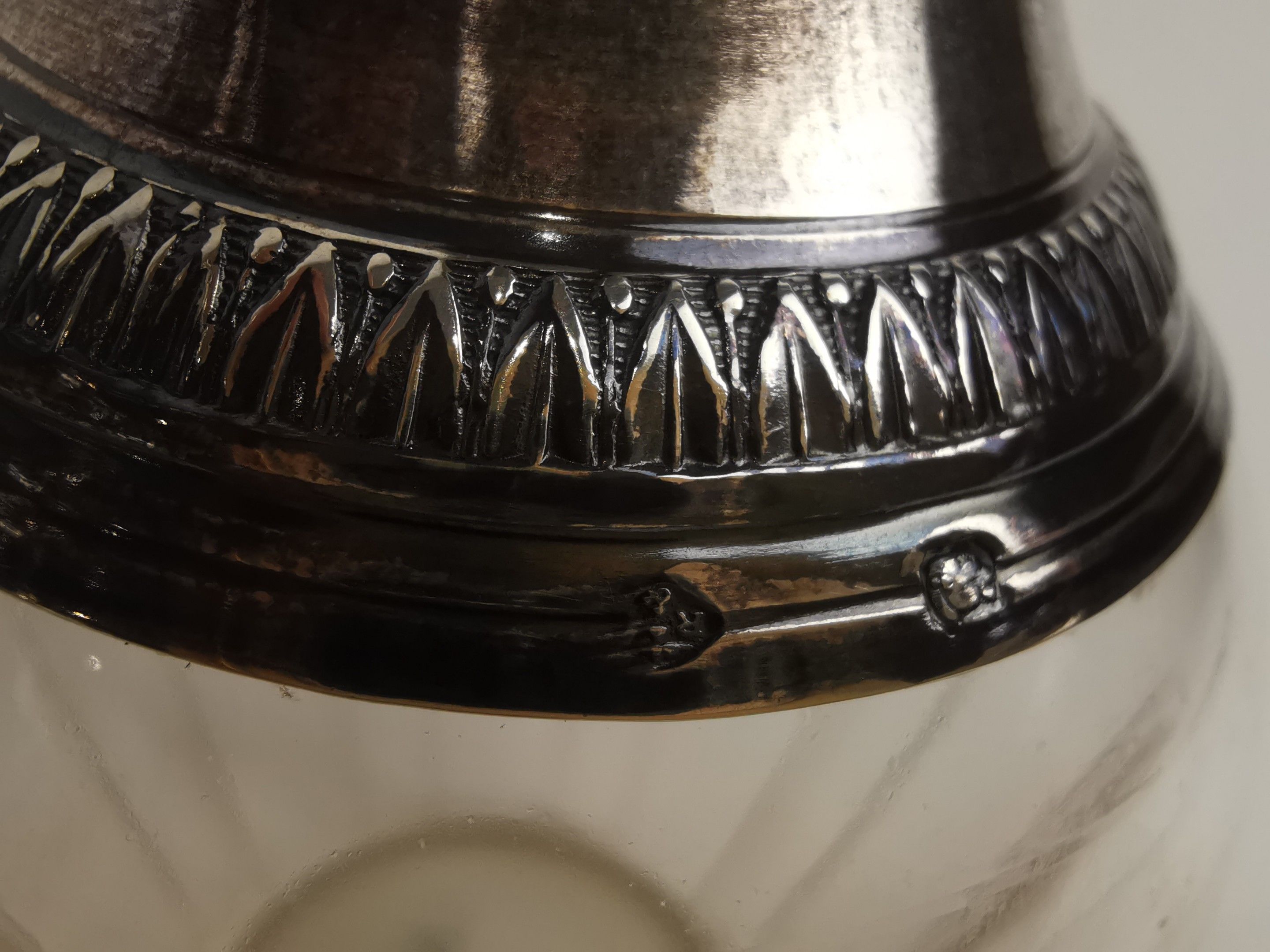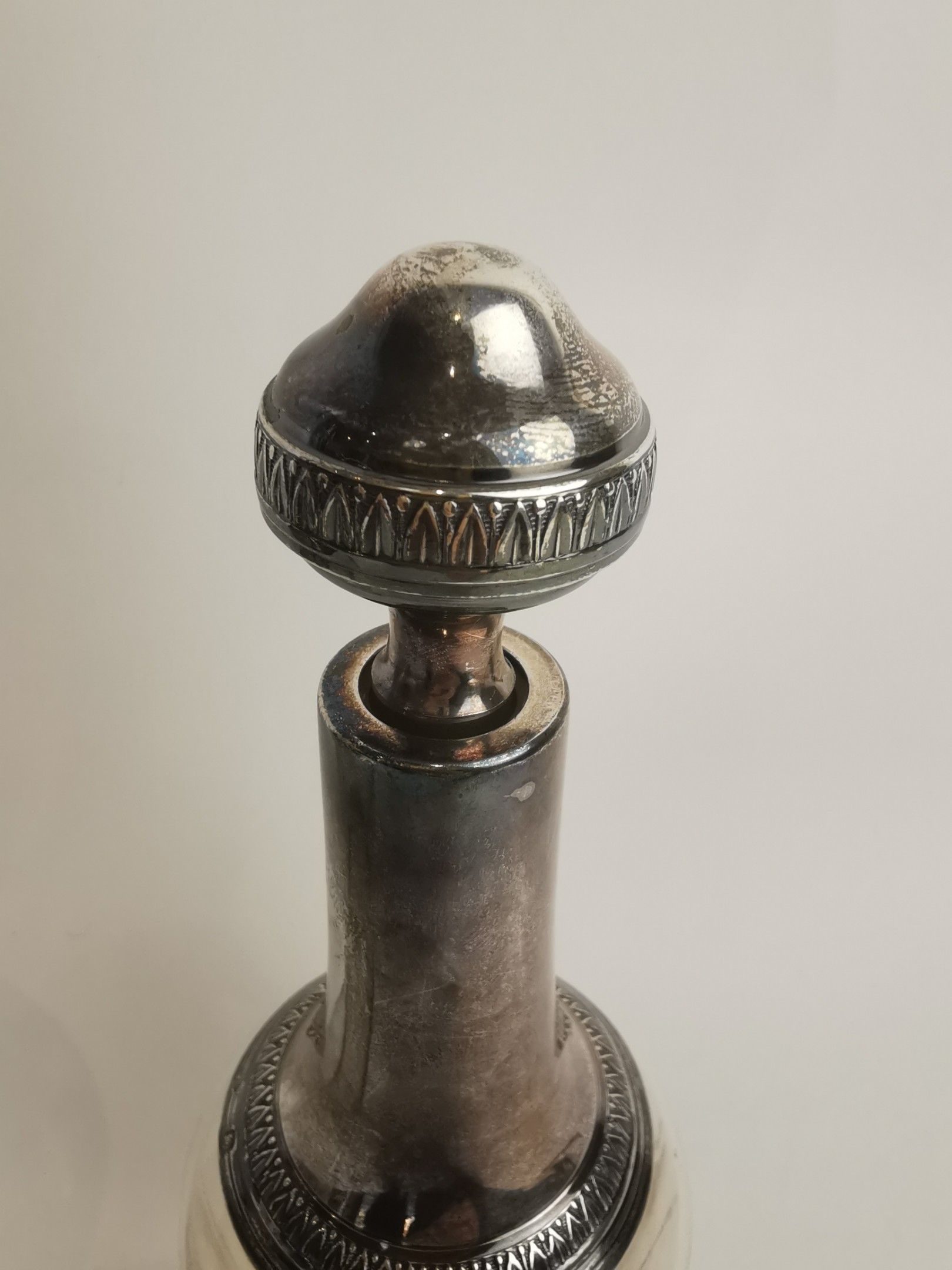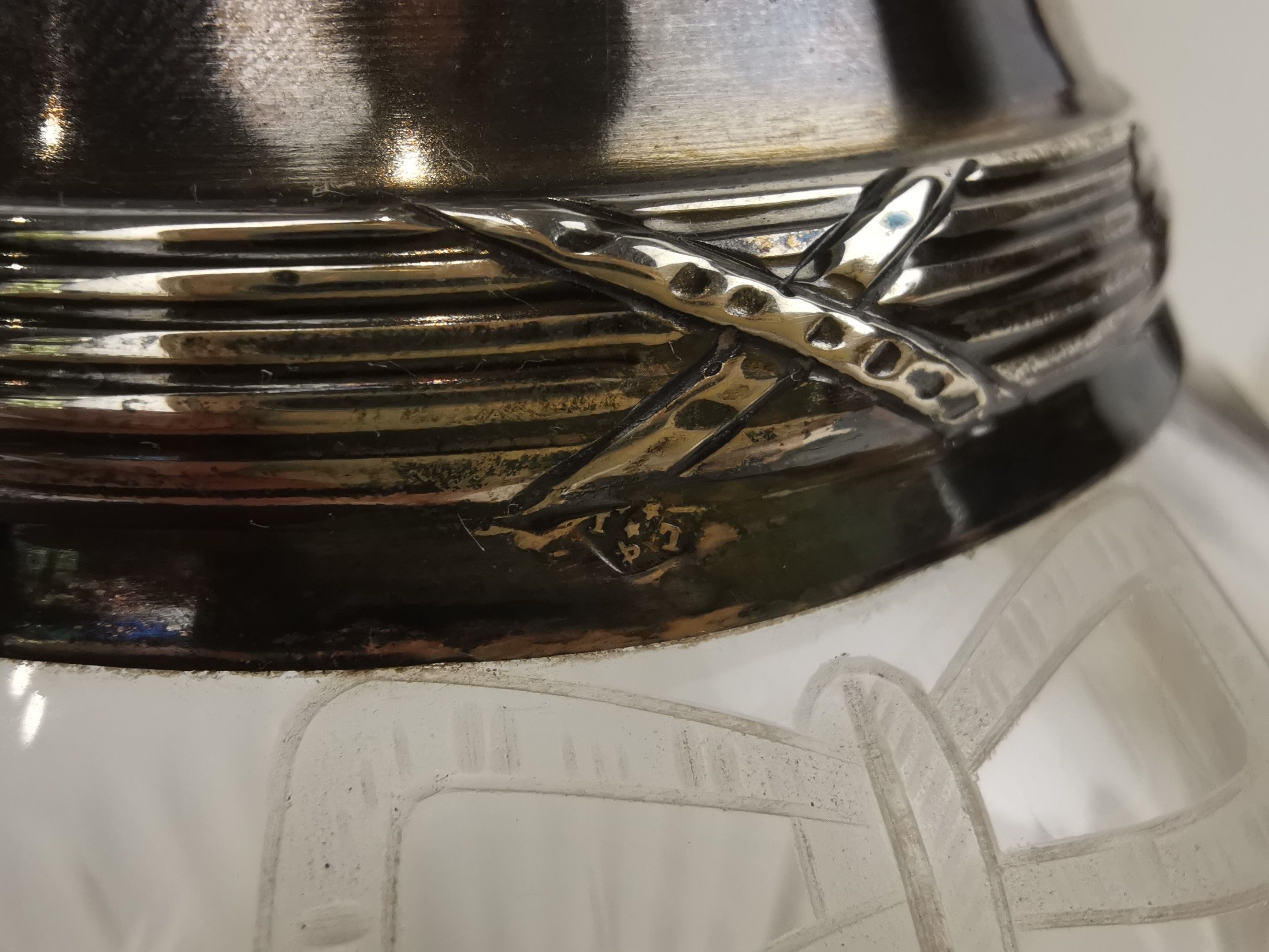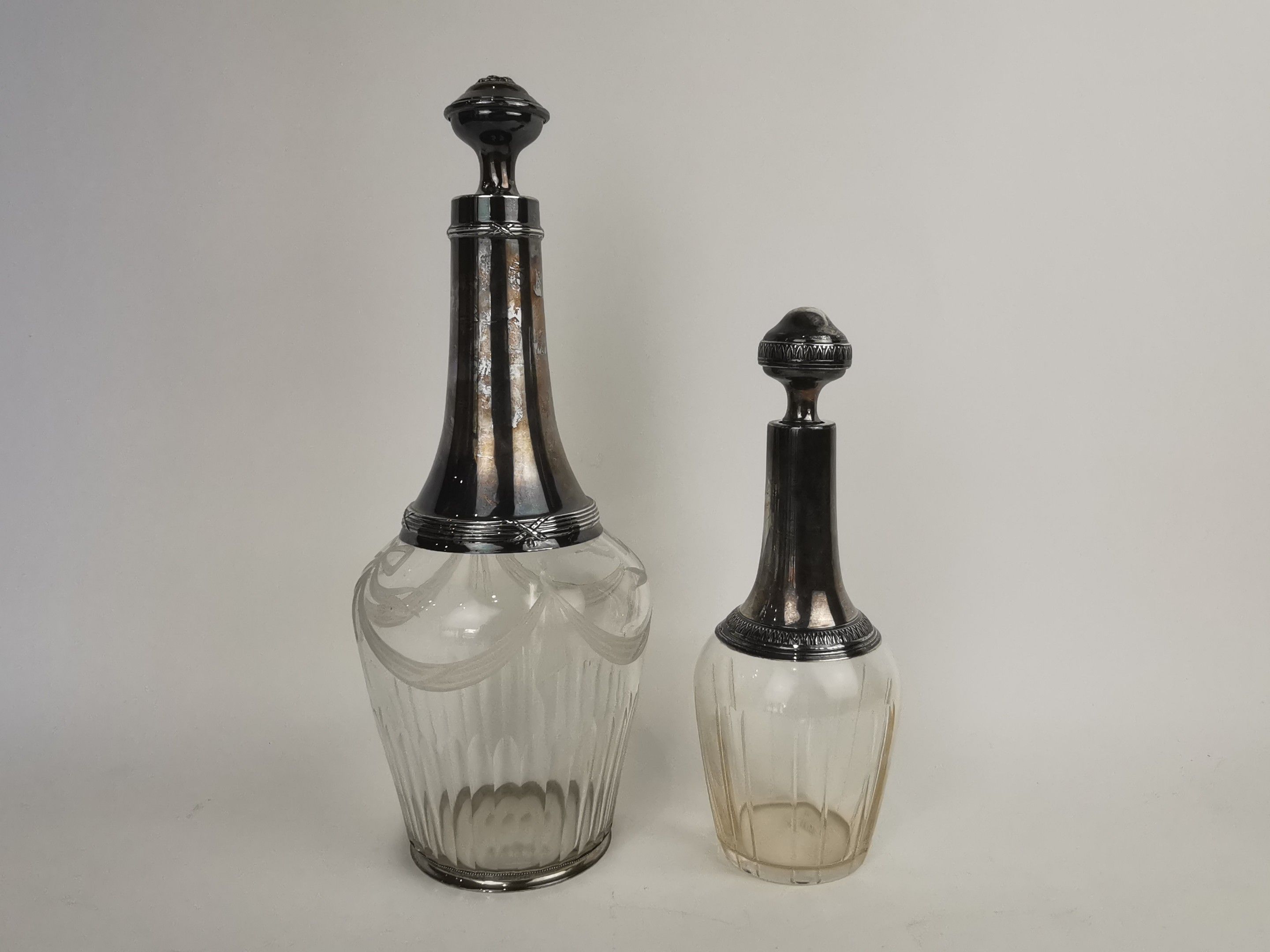 - Large decanter: PARIS, LAGRIFFOUL ET LAVAL, 1899-1972 (Minerve). Silver-rimmed base, crystal body with fluted base engraved with ribbon bows and draperies, the neck trimmed in silver with crossed ribbon fillet mouldings, the stopper moulded and topped with a flowered rosette. Minor damage to the base on the rim. Height 29 cm; Gross weight 645 g.