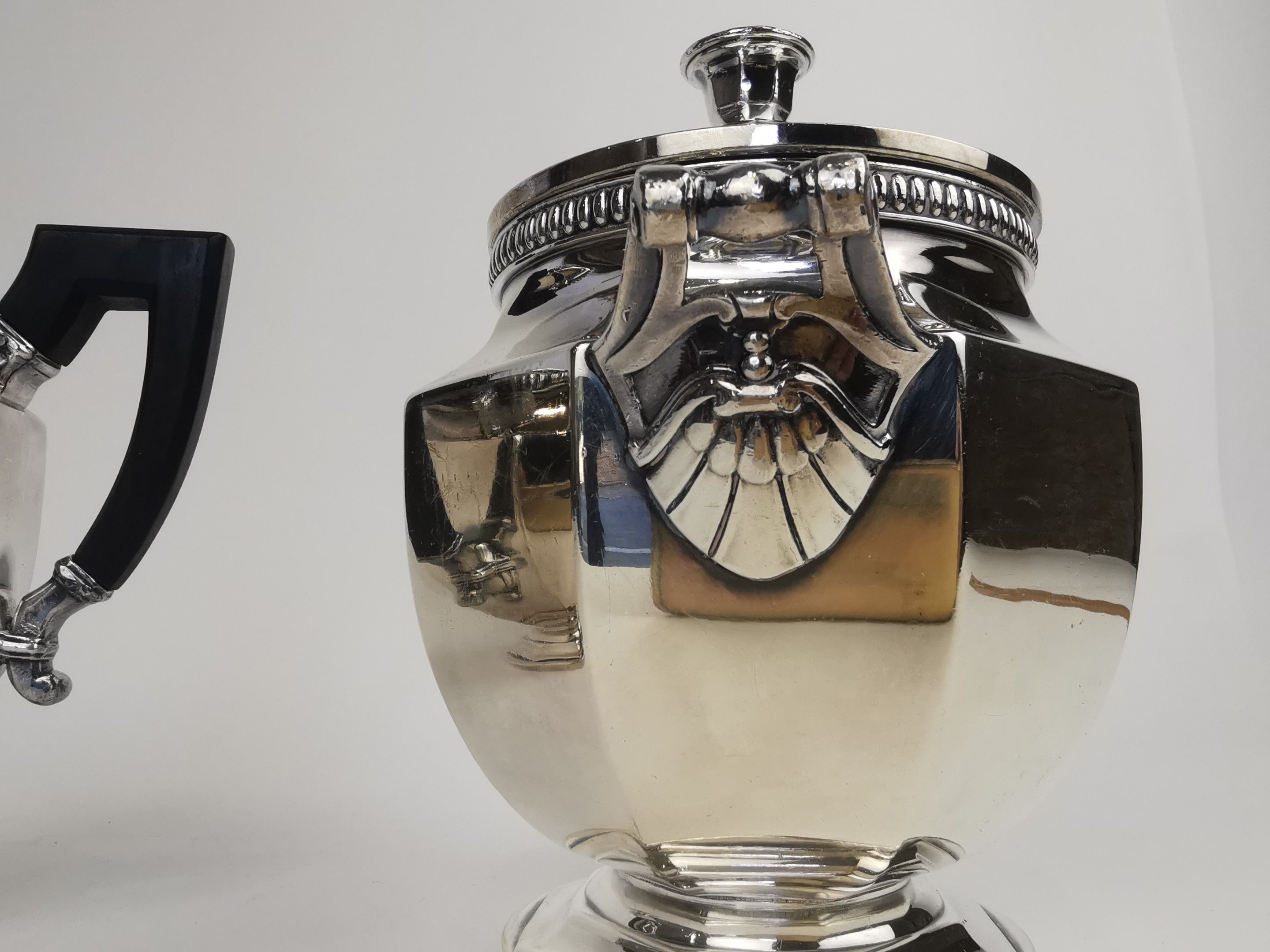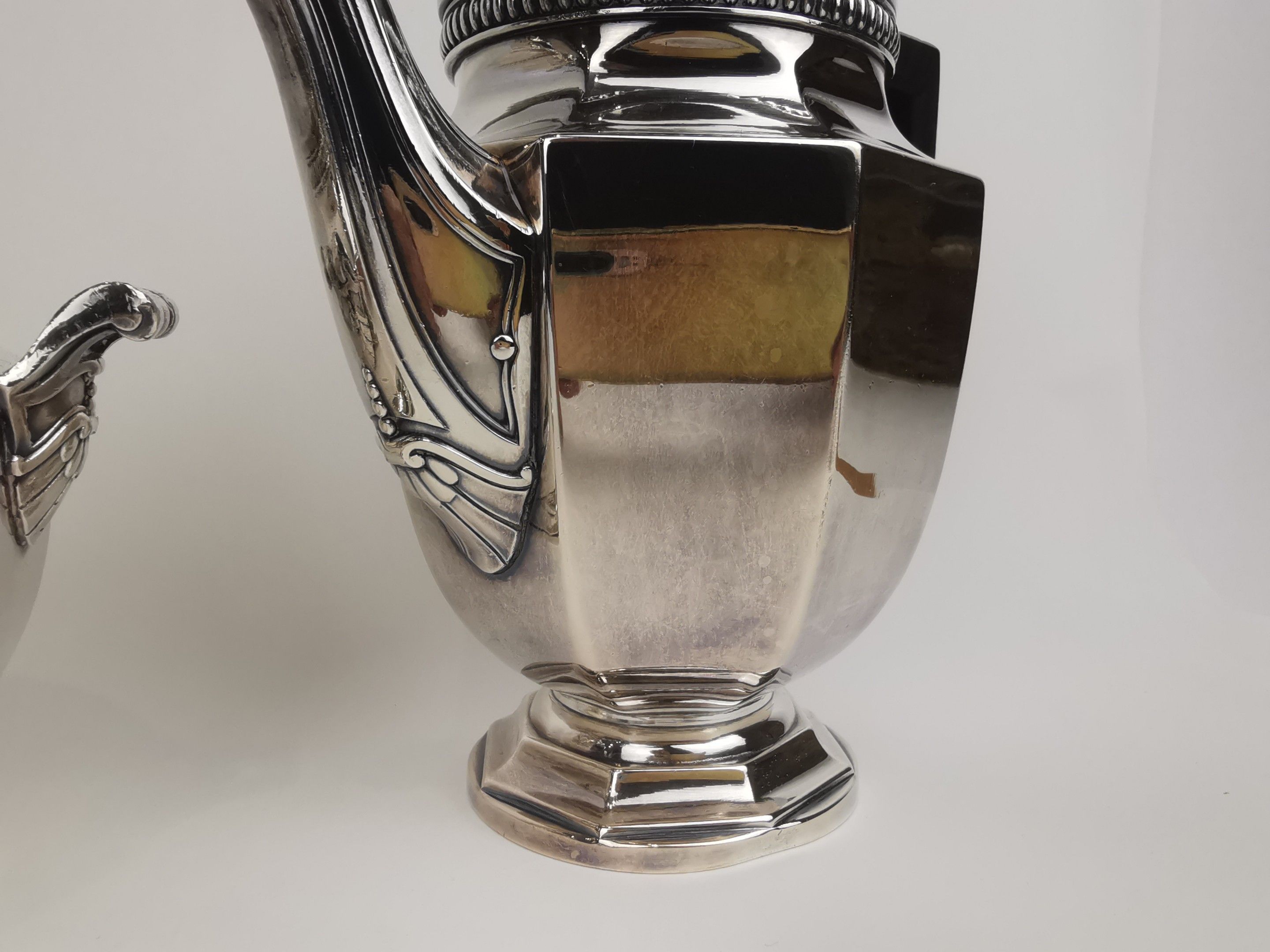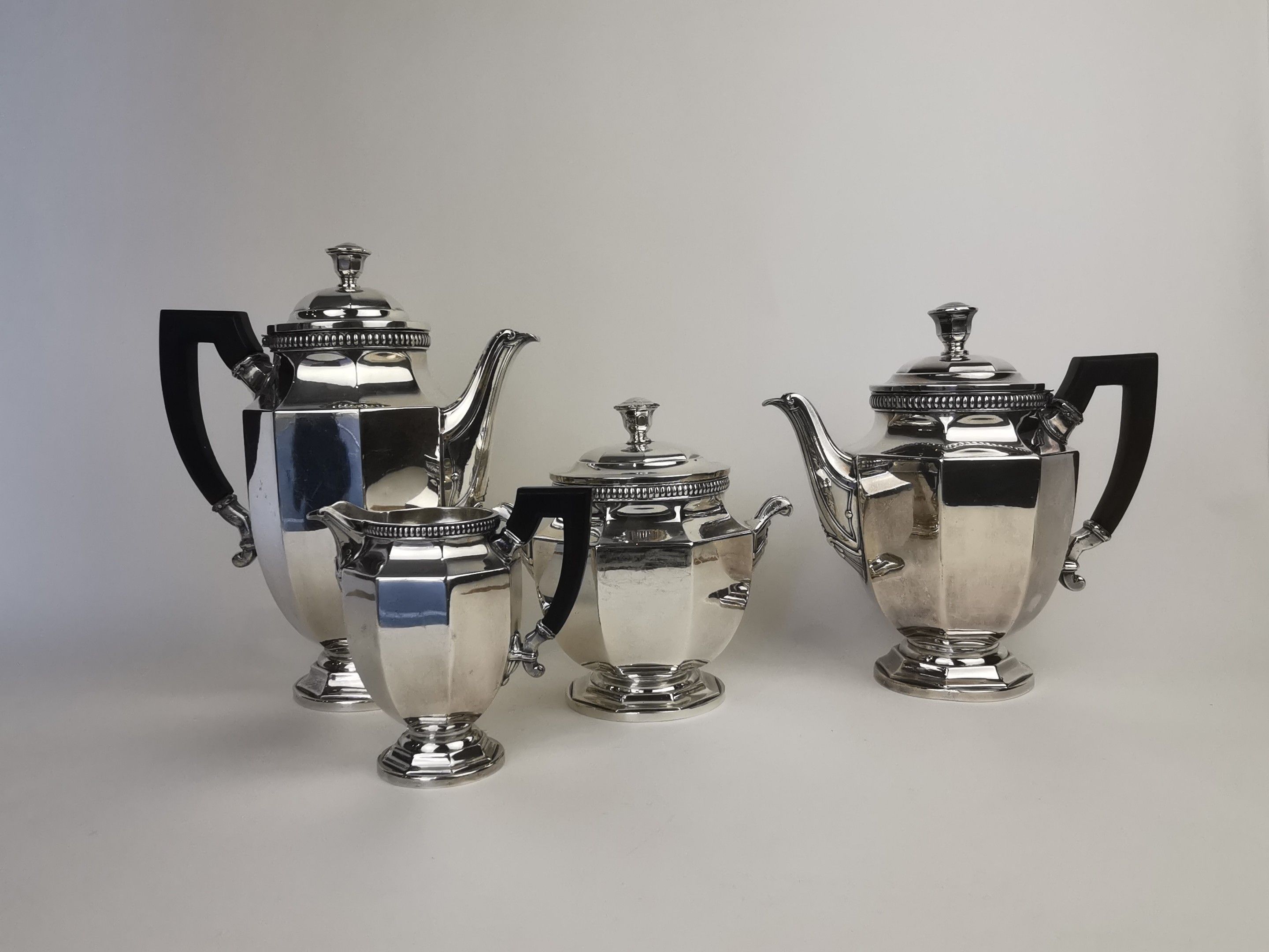 silver plated tea/coffee set. GALLIA / Christofle silverware, 20th century. It consists of a coffee pot, a teapot, a sugar pot and a milk pot. Art Deco style. The body is set on a circular base, with a domed lid topped by a domed knob, and a spout decorated with a stylised shell and a string of pearls. The neck is edged with a frieze of ovals. Wooden handles. Numbered 5834 under the body. The knob on the sugar pot is damaged. Height (coffee pot) 23.5 cm