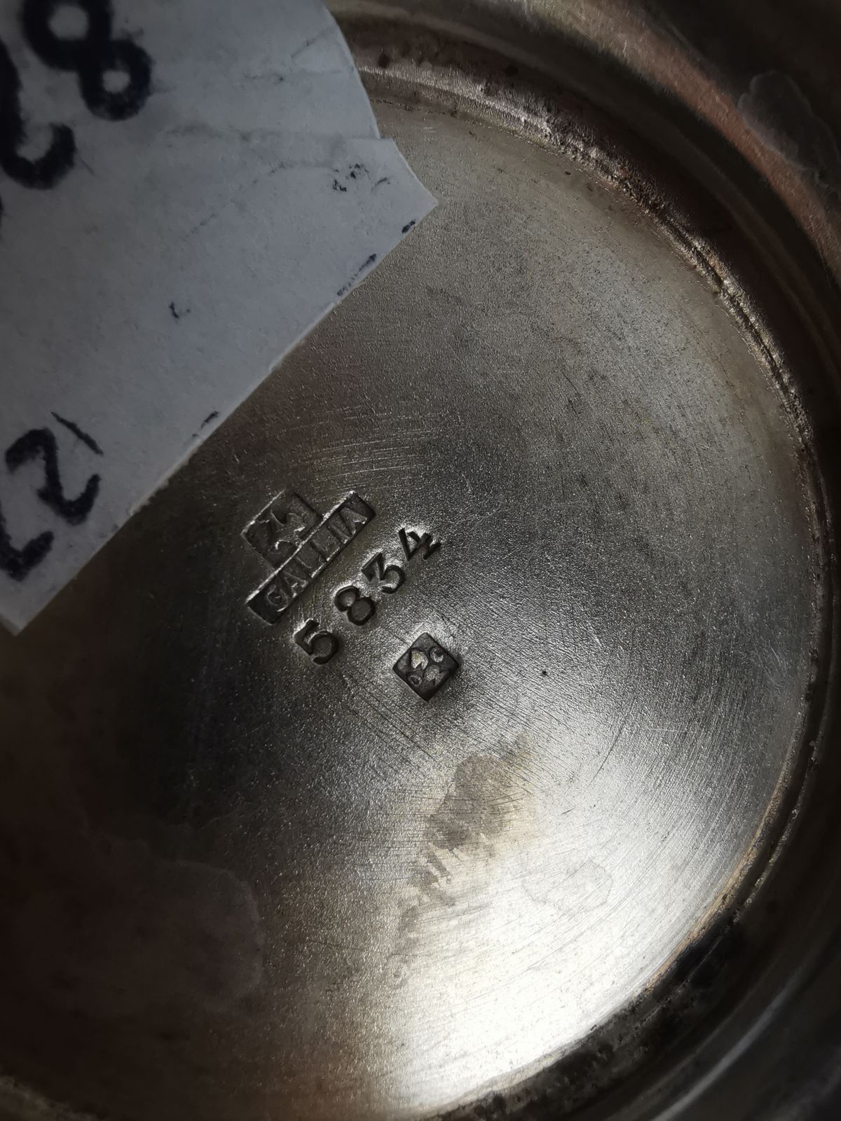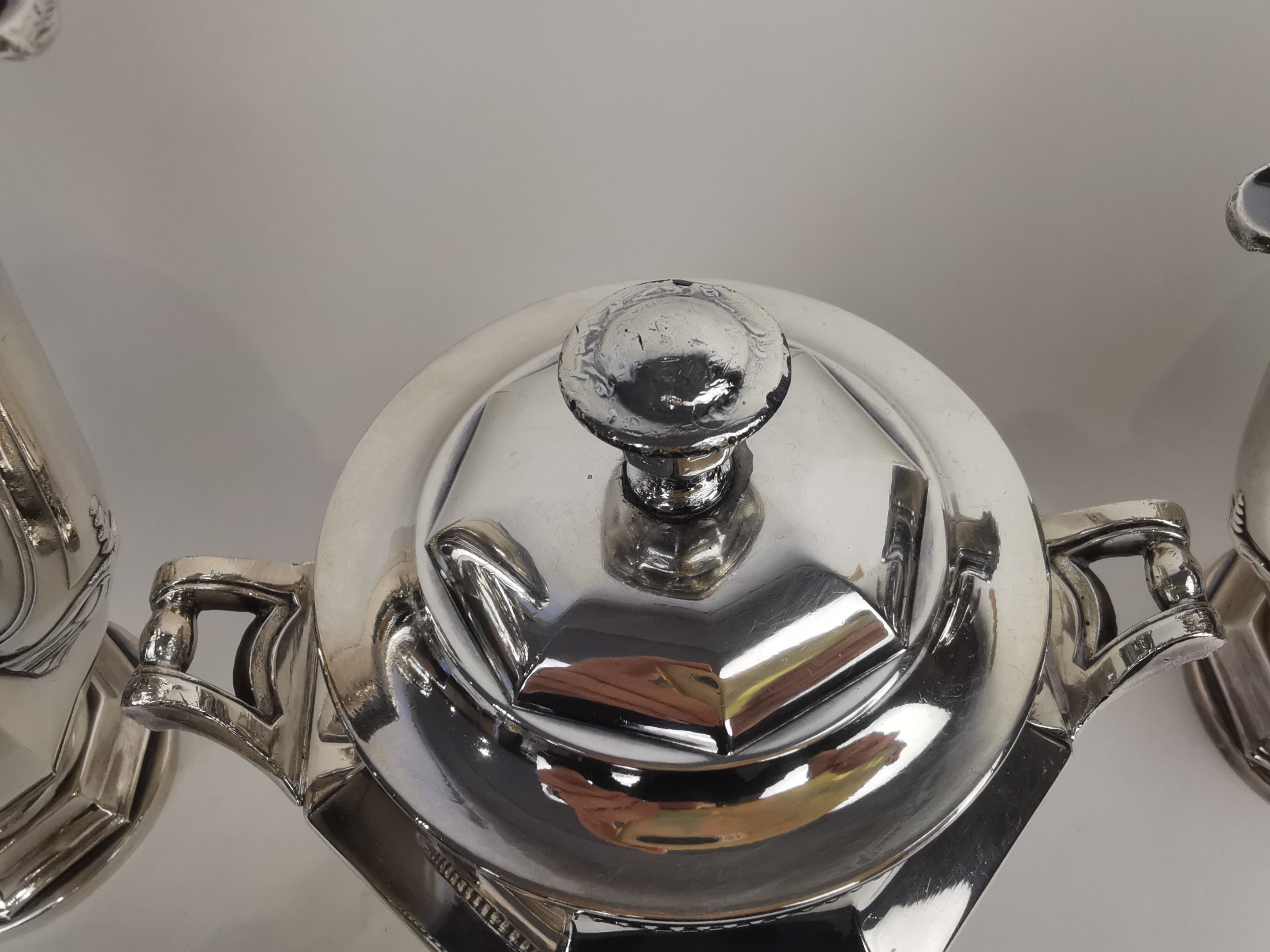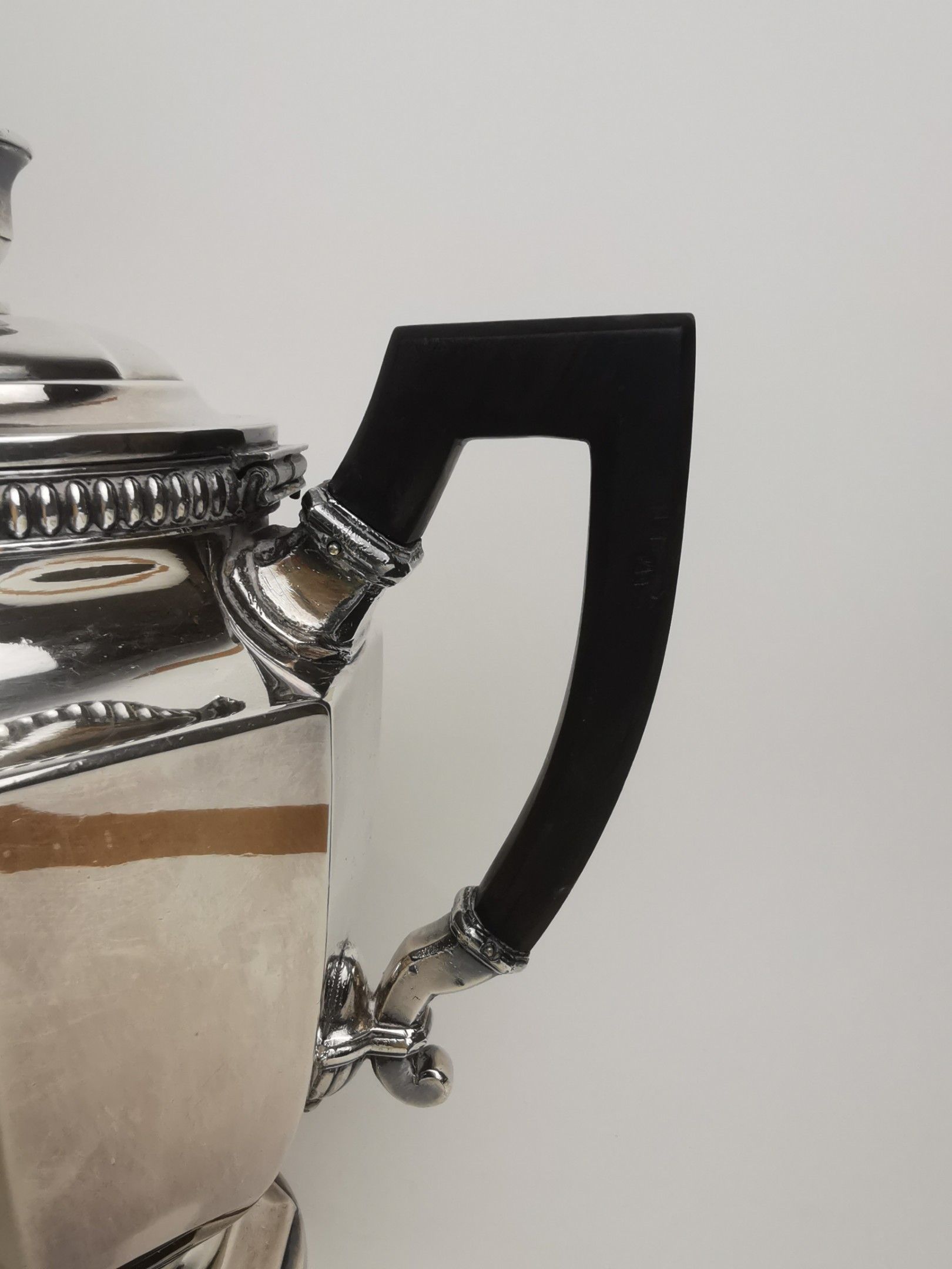 silver plated tea/coffee set. GALLIA / Christofle silverware, 20th century. It consists of a coffee pot, a teapot, a sugar pot and a milk pot. Art Deco style. The body is set on a circular base, with a domed lid topped by a domed knob, and a spout decorated with a stylised shell and a string of pearls. The neck is edged with a frieze of ovals. Wooden handles. Numbered 5834 under the body. The knob on the sugar pot is damaged. Height (coffee pot) 23.5 cm