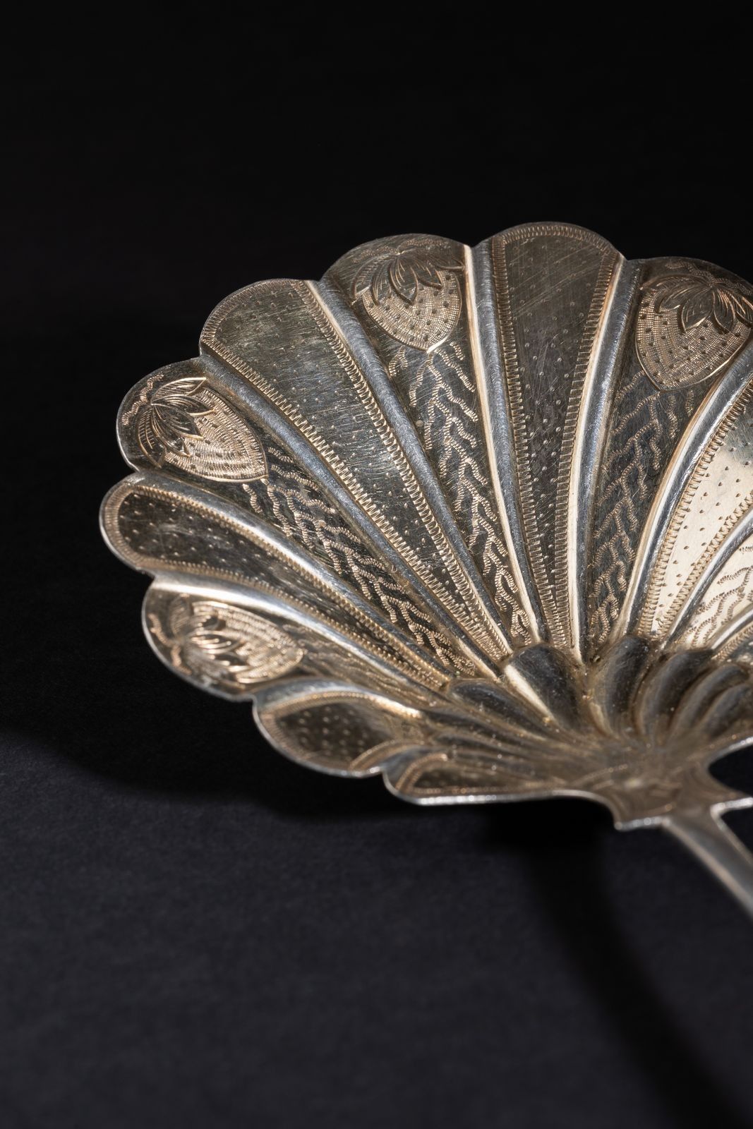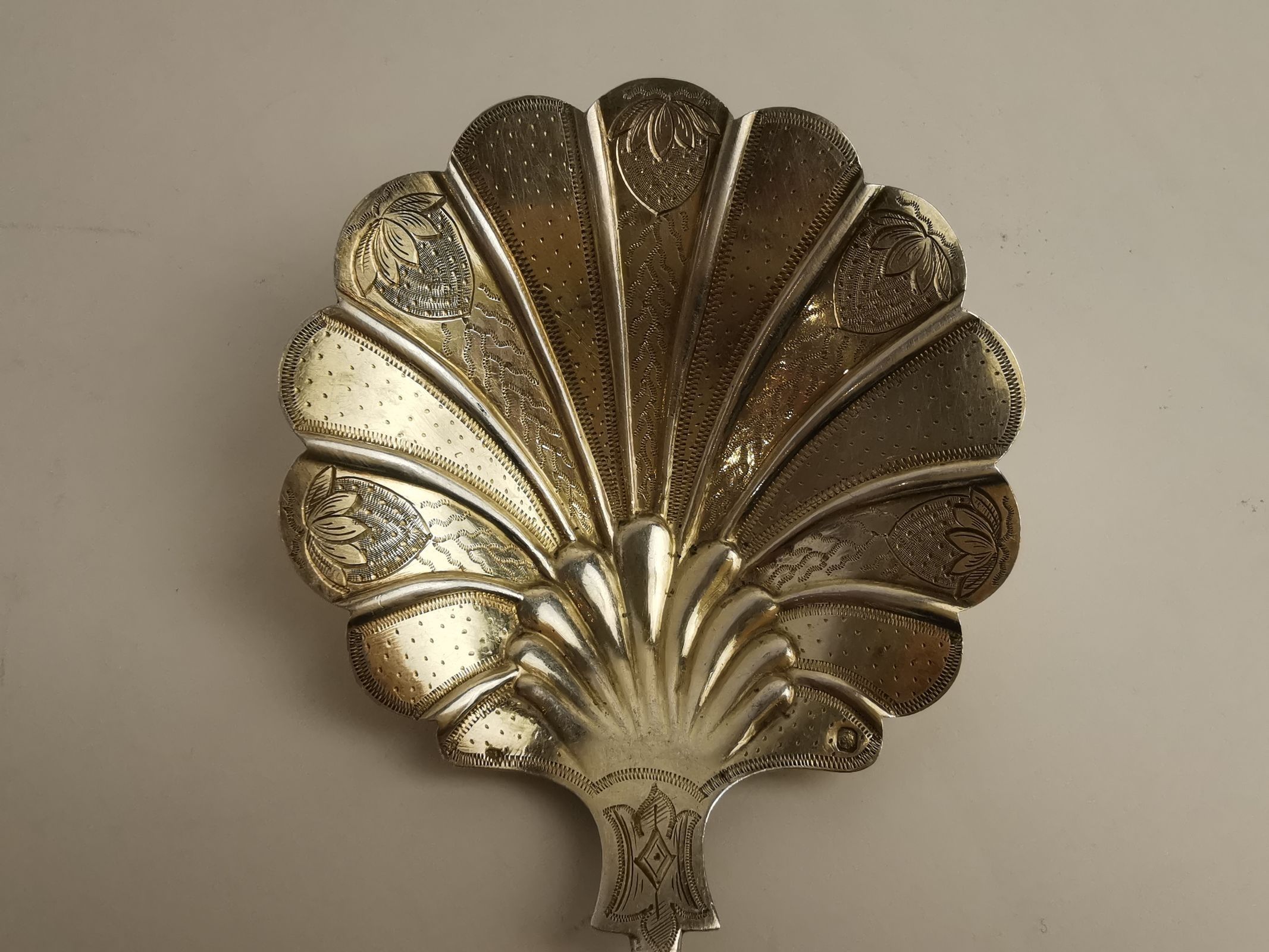 - Shovel n°2 : PARIS, Henri SOUFFLOT, 1884-1910 (Minerve). The gilded spoon in the shape of a shell au naturel. Monogram VP engraved on the spatula decorated with flowers.