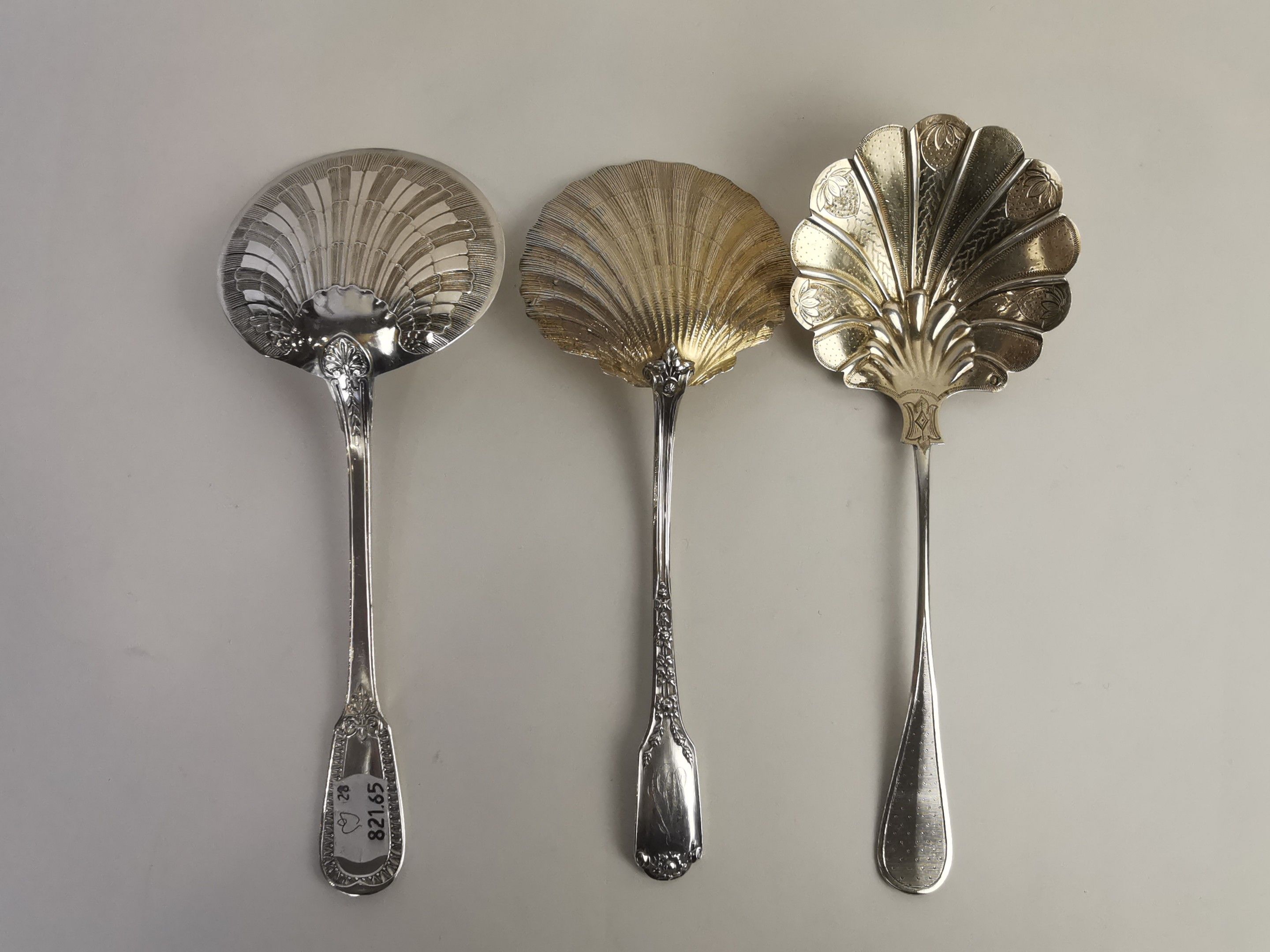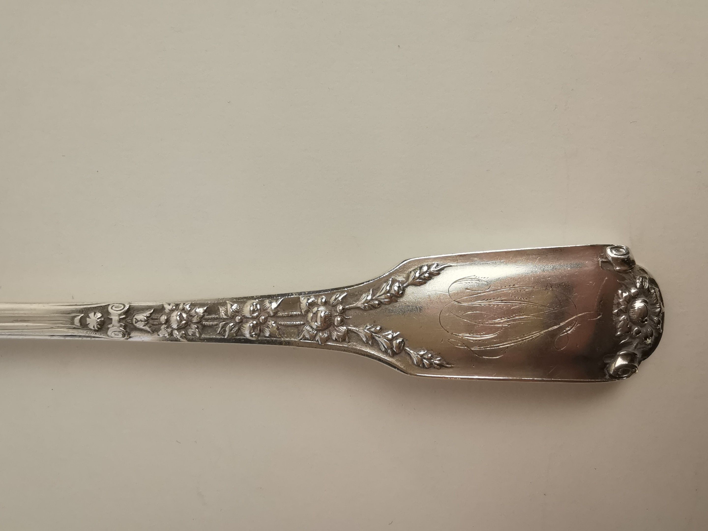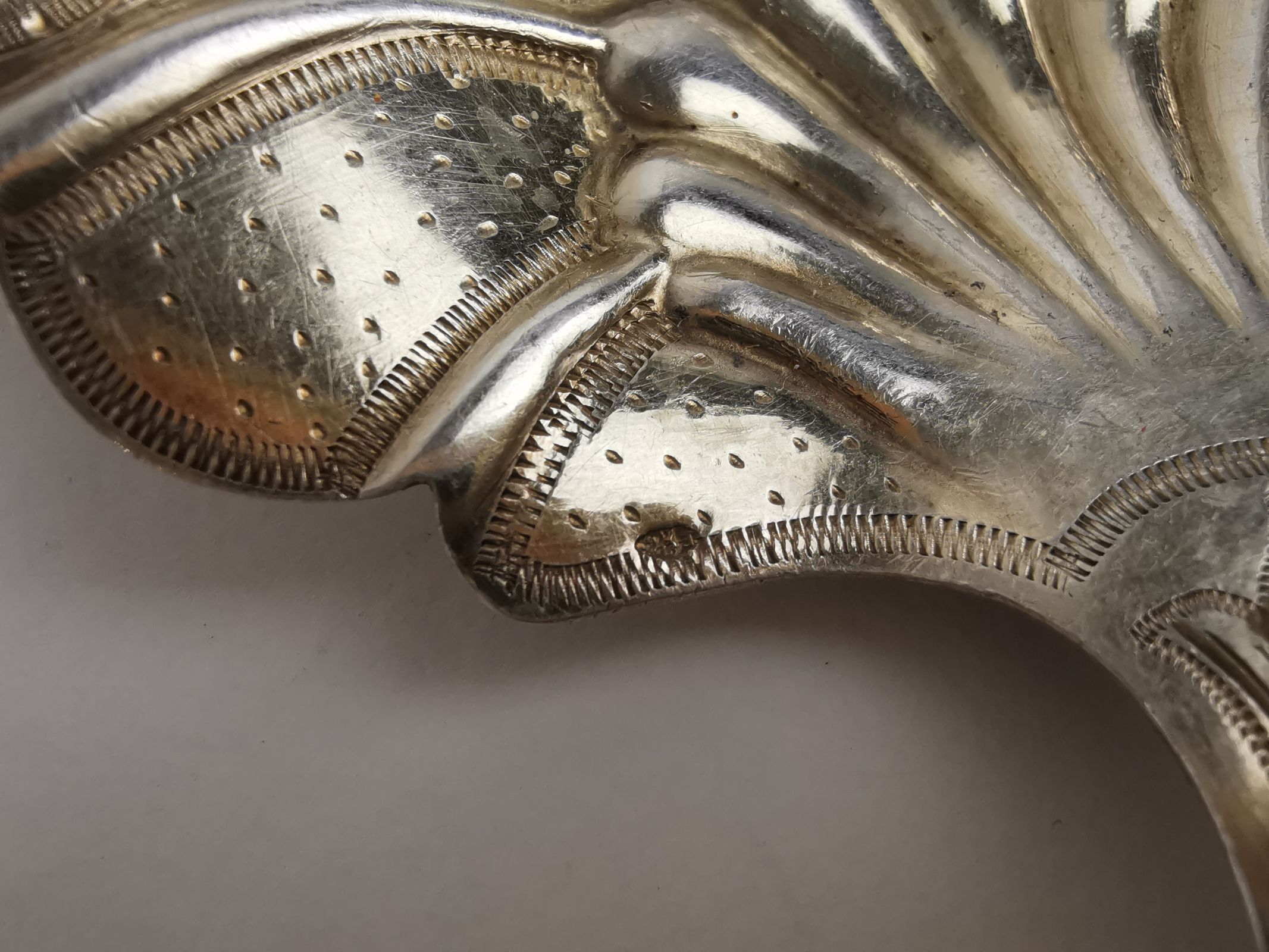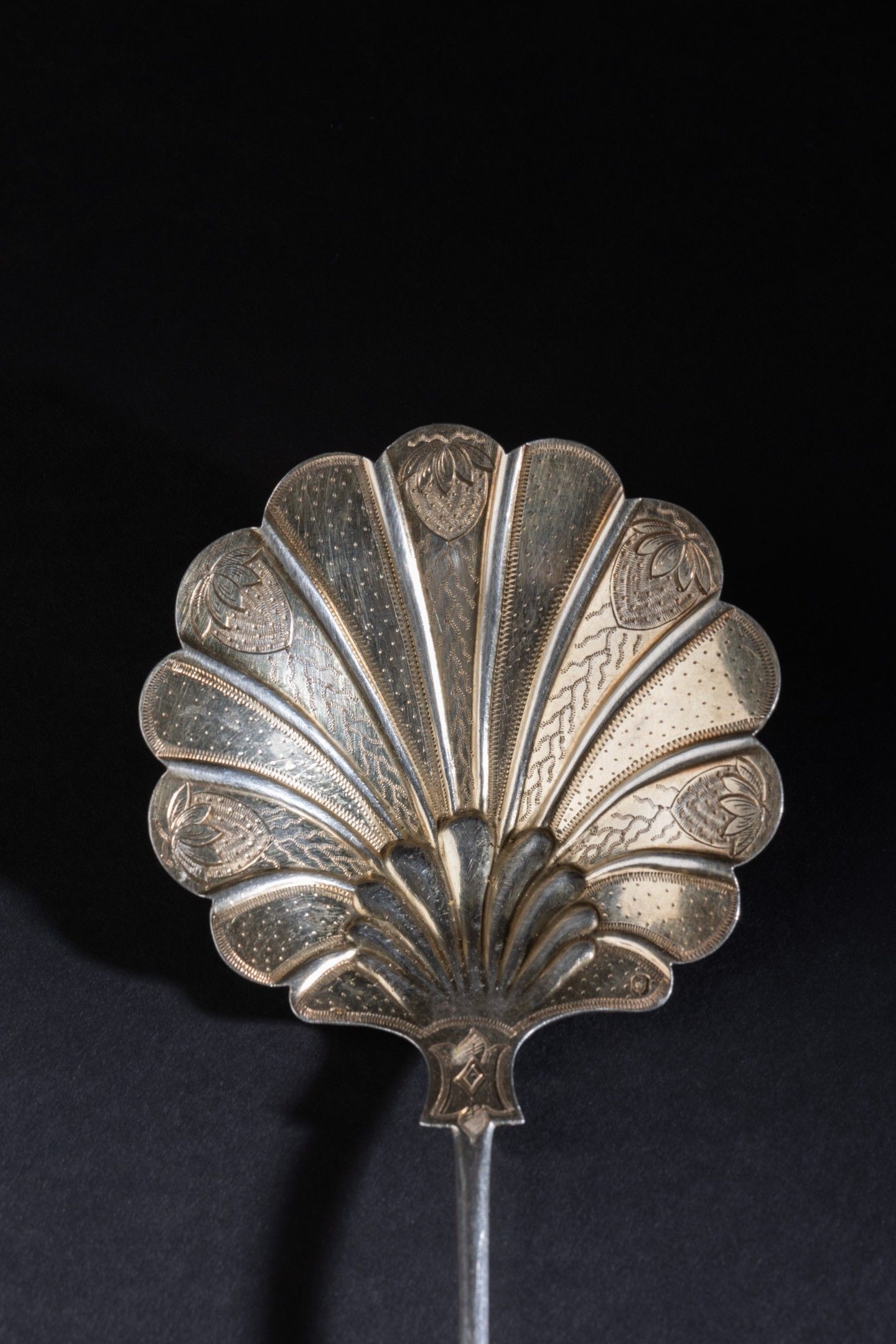 - Shovel n°1: PARIS, Paul TALLOIS, 1907-1928 (Minerve). The spoon in the shape of a shell, the spatula edged with water leaves engraved with the monogram VD.