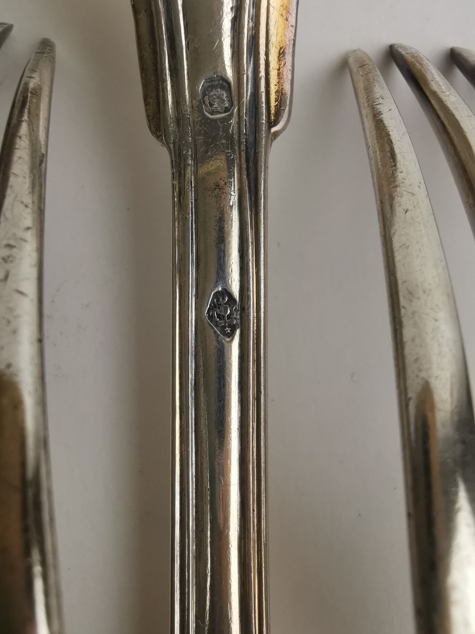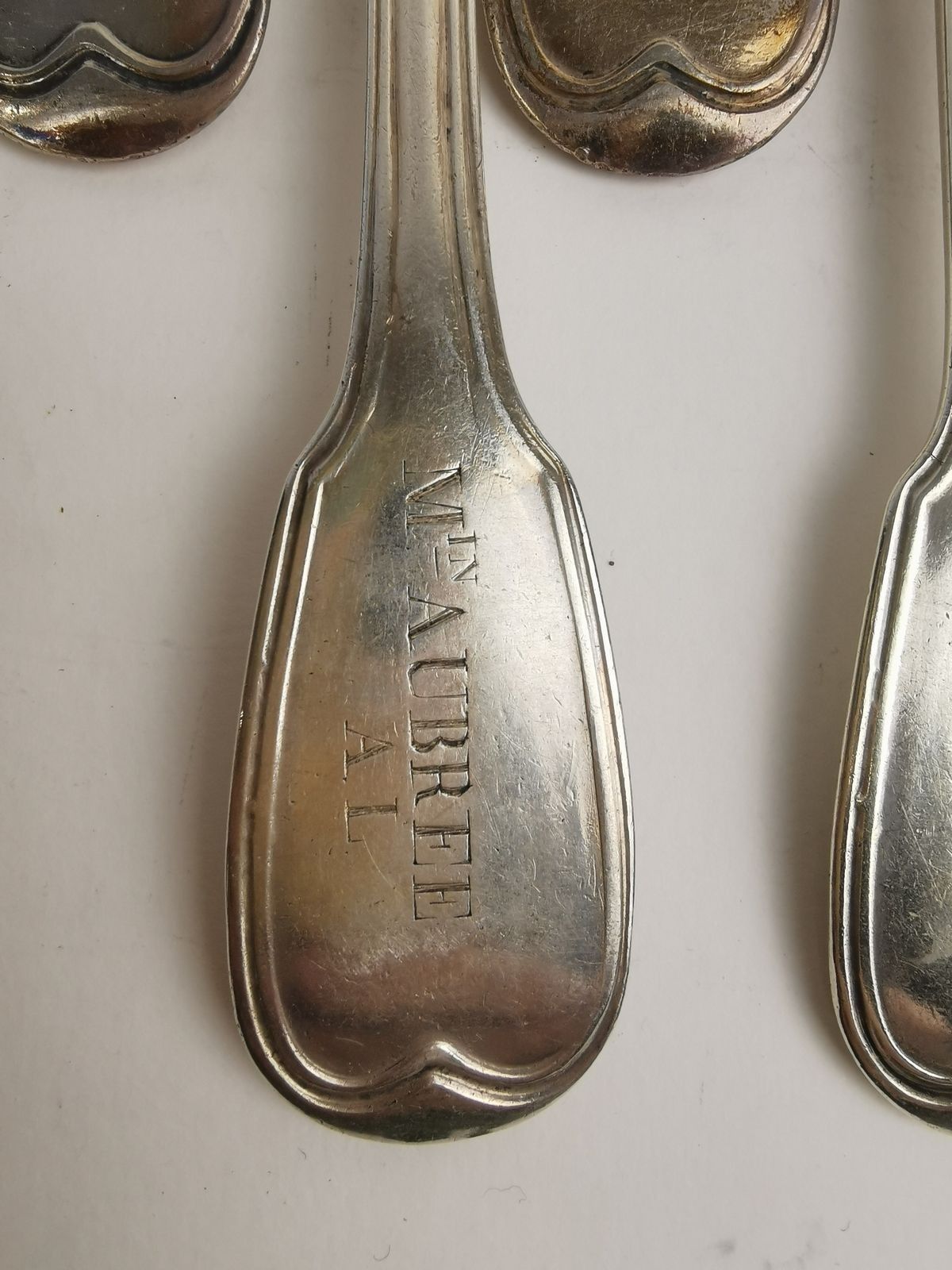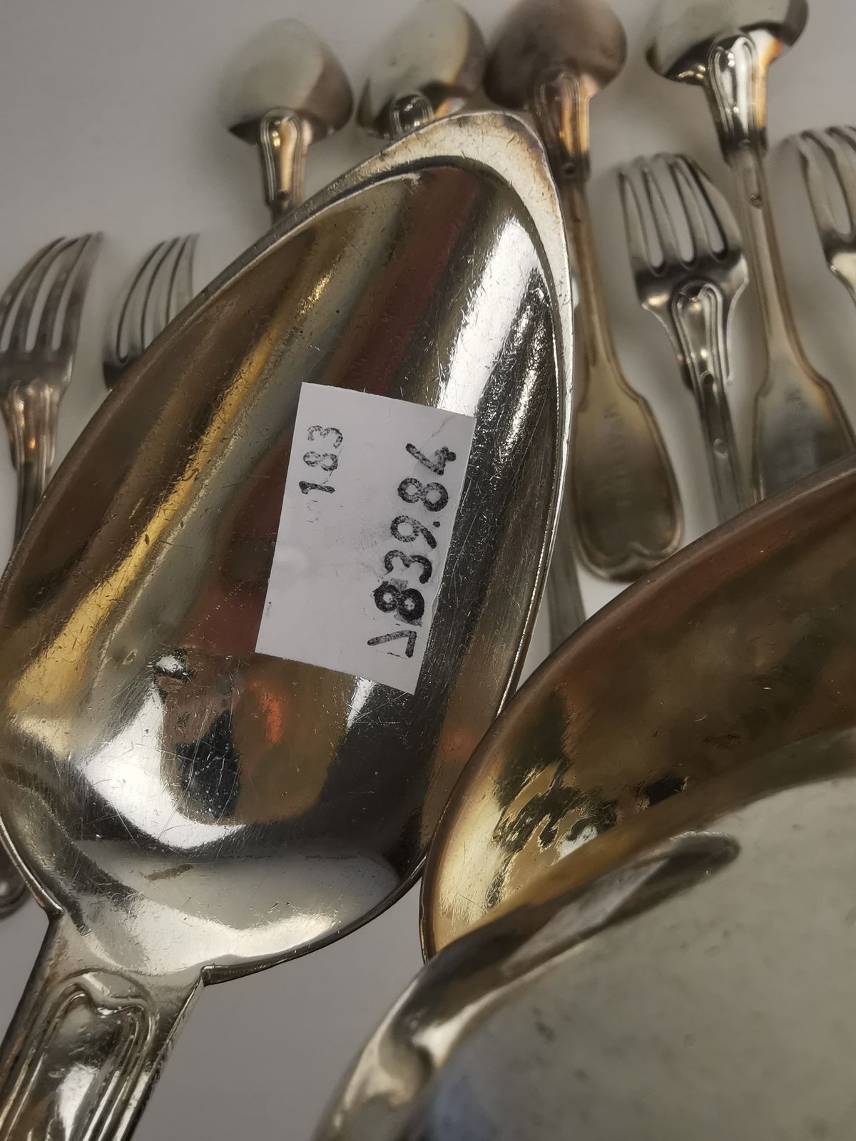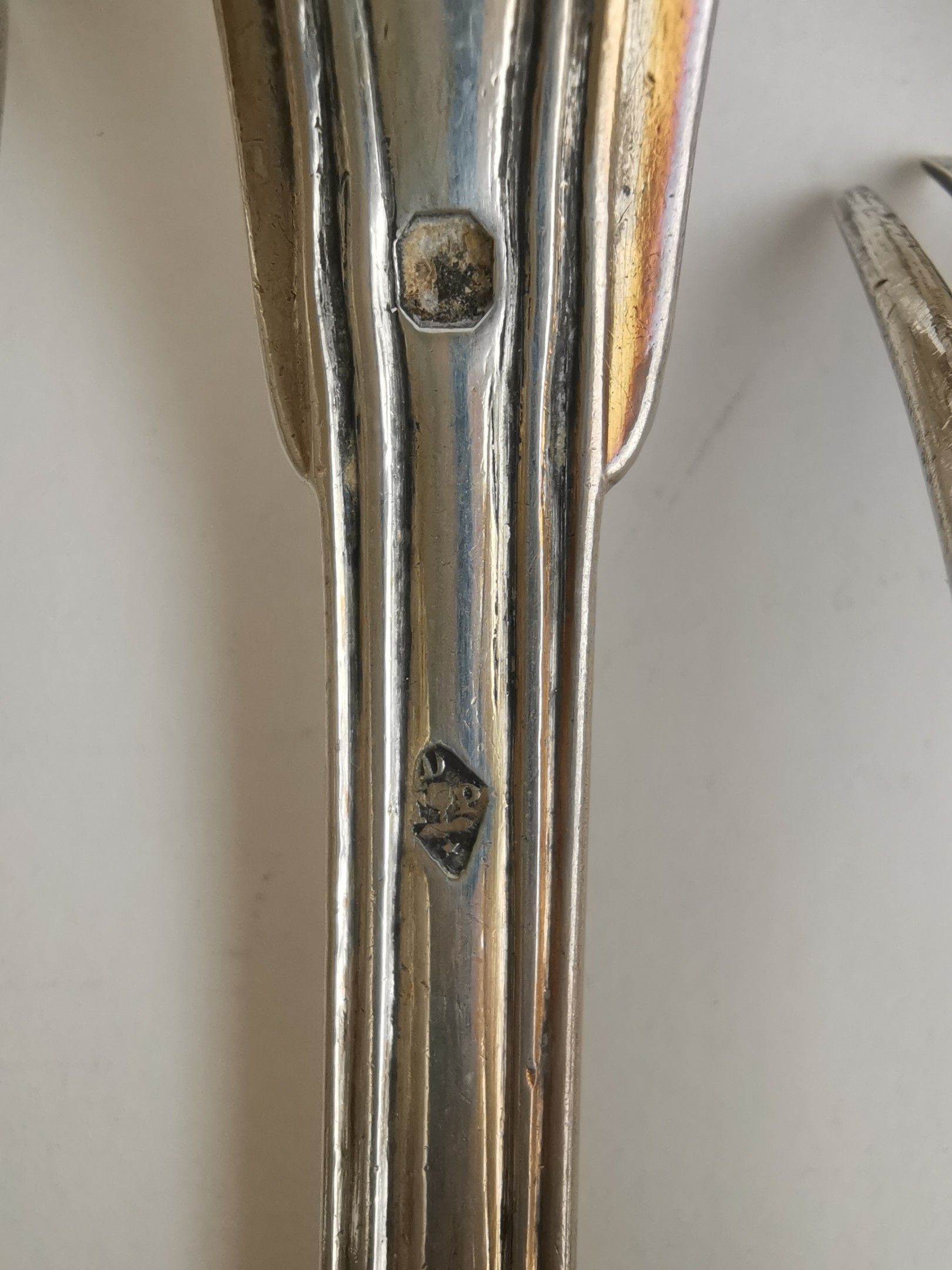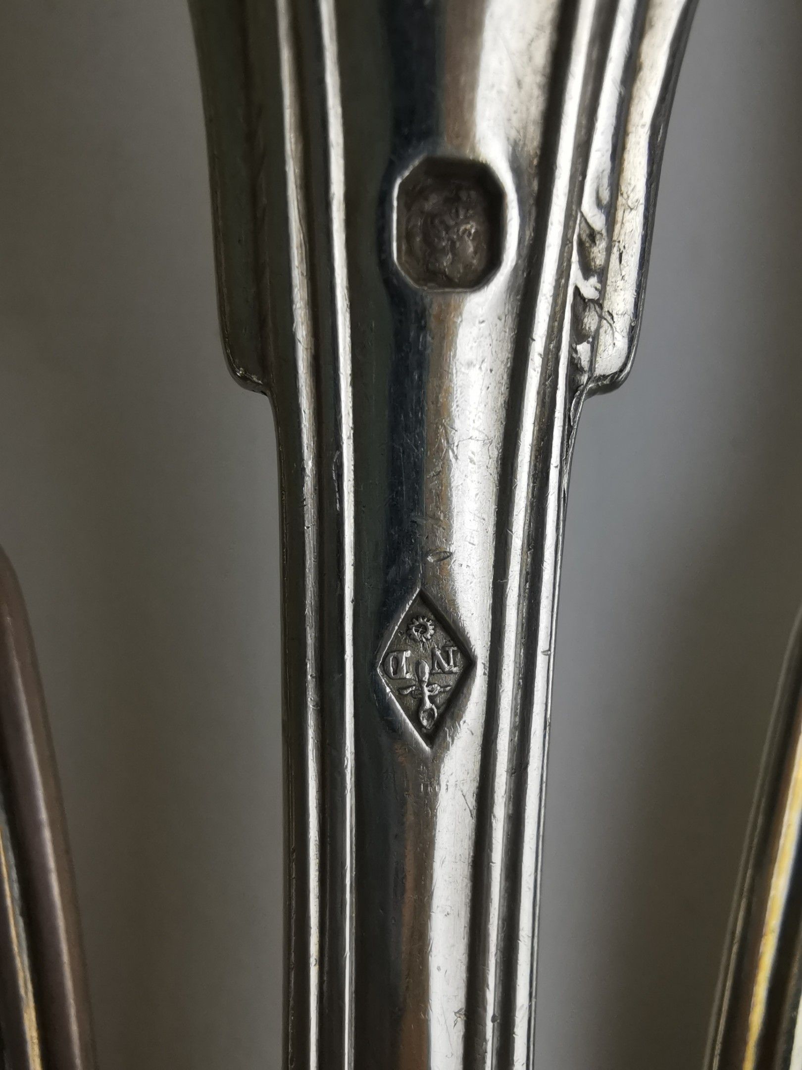 SEVEN Soup spoons and eight table spoons in silver (925). PARIS, various silversmiths, ap. 1838 (Minerve). Uniplat model, spatulas engraved M[IN] AUBREE / AL. Weight 1056 g.