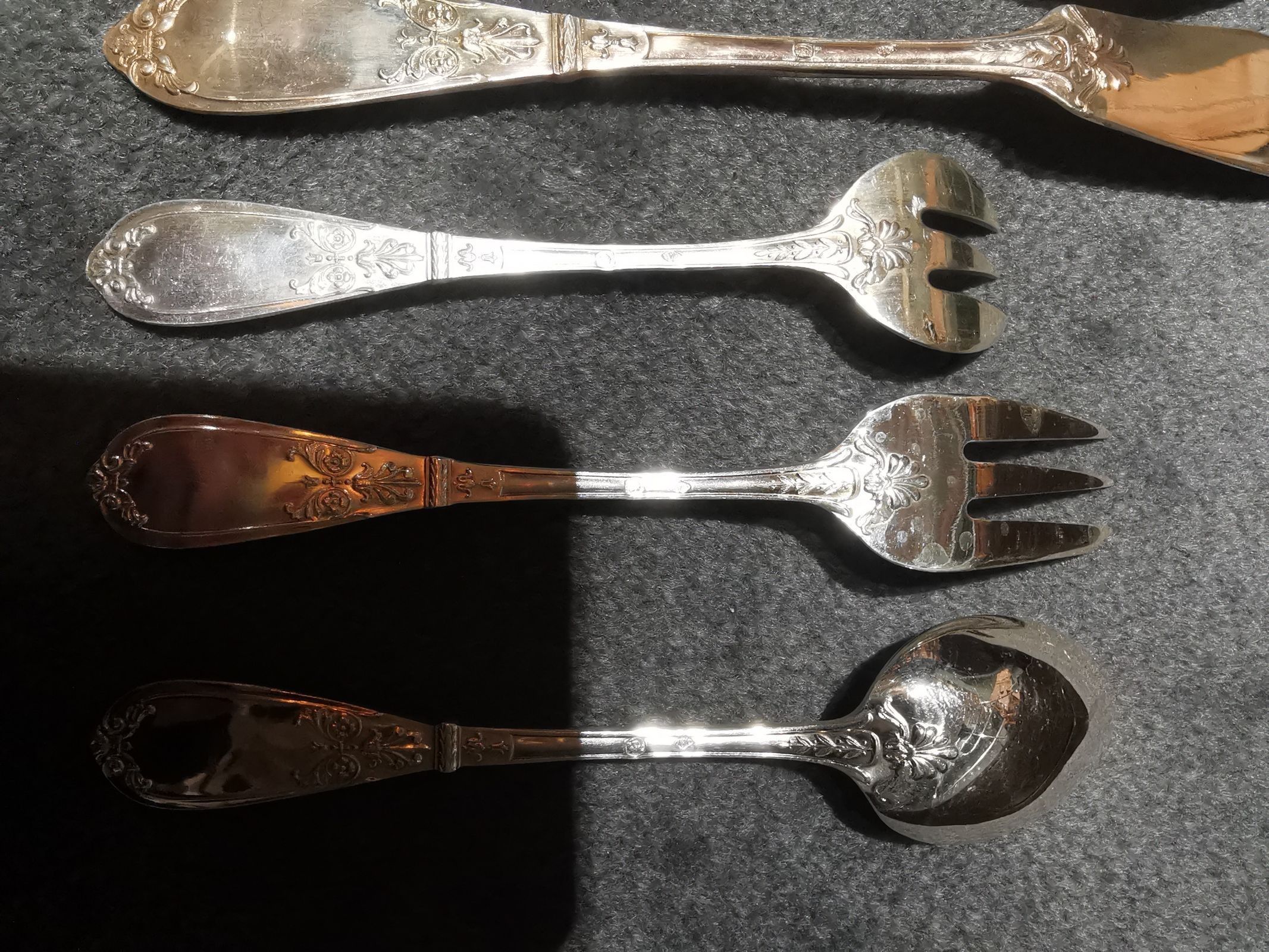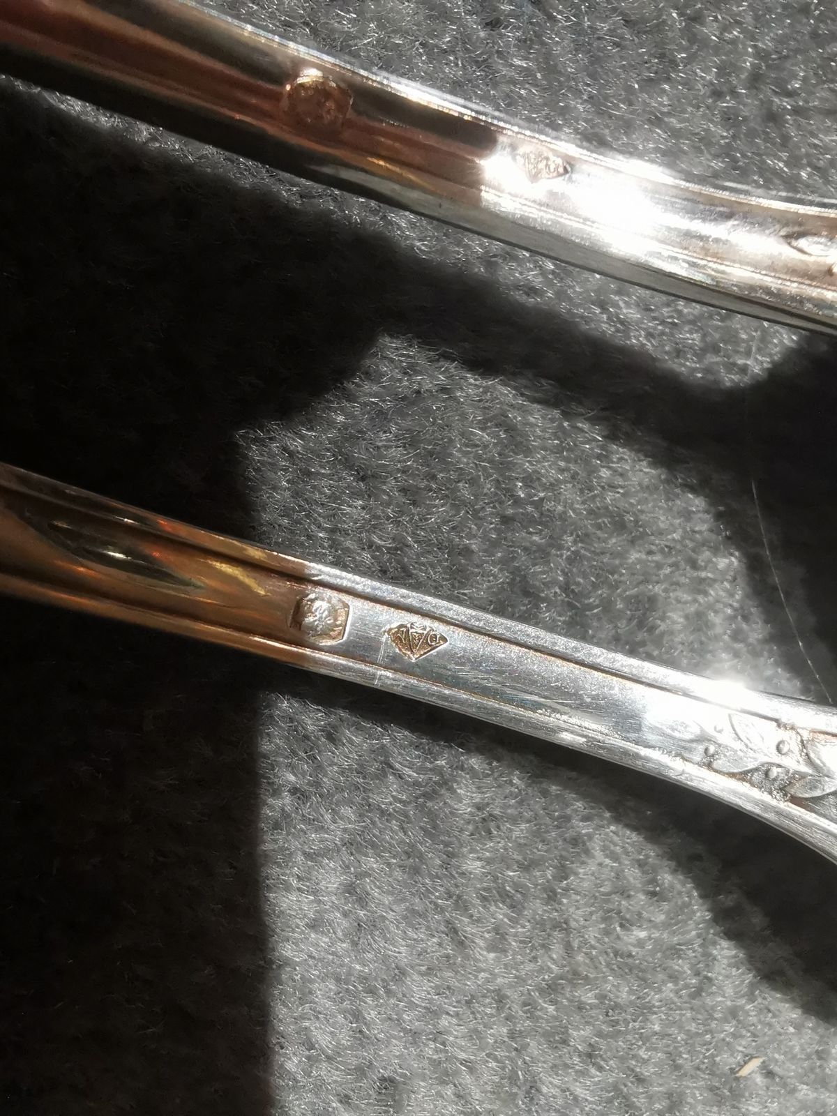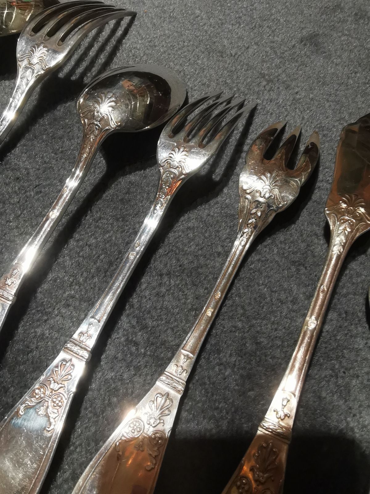 Silver MENAGERE (925) (108 pieces). PARIS, MORAND Frères, ap. 1947 (Minerve). It comprises: twelve pieces of table cutlery, twelve pieces of fish cutlery, twelve pieces of dessert cutlery (spoon and cake fork), twelve oyster forks. Filet pattern with foliate and palmette decoration, stem encircled by a laurel torus. Total weight 5616 g.