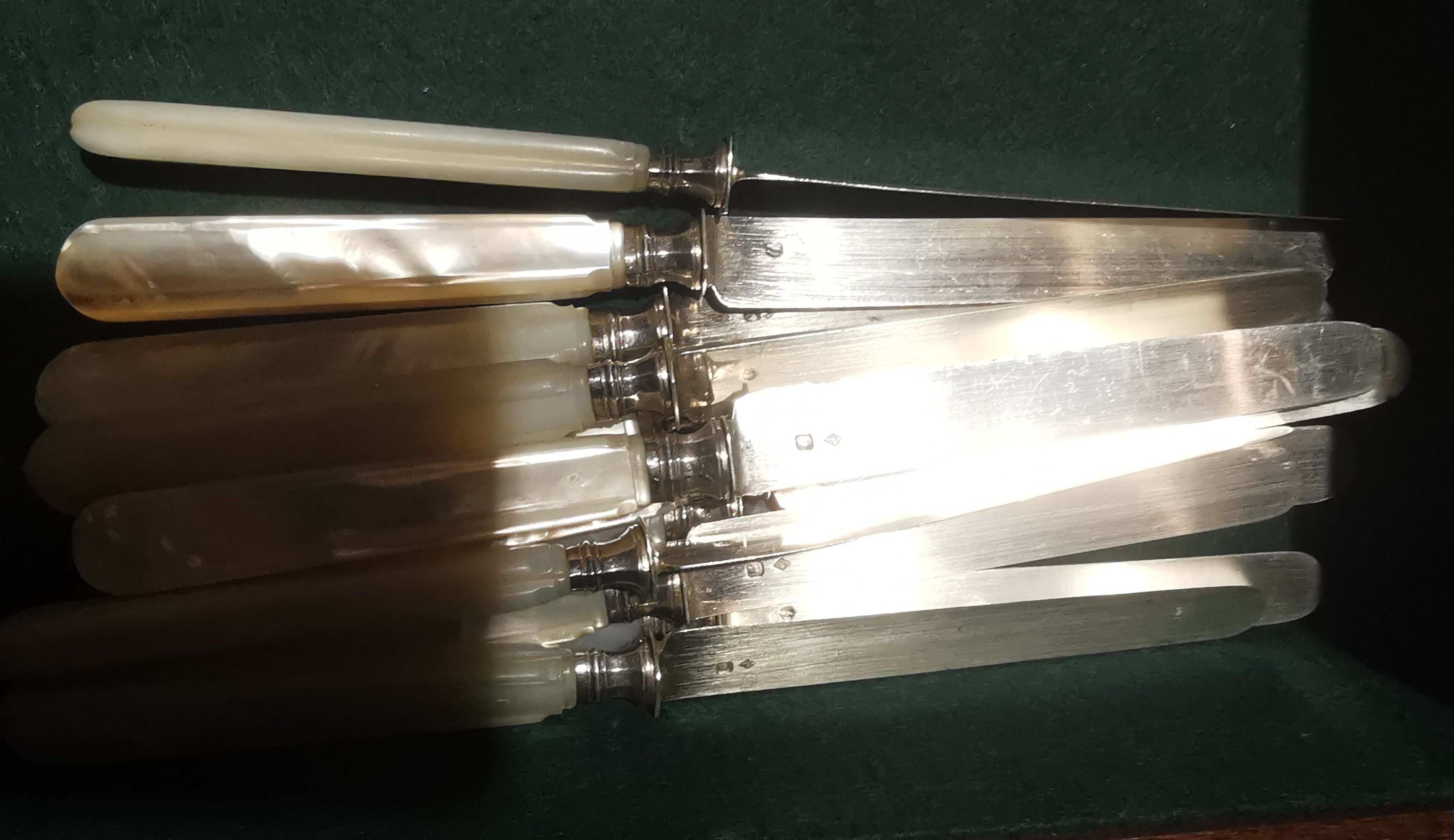 A SERIES OF TWELVE FRUIT KNIVES, mother-of-pearl handle, silver blade (925), PARIS, silversmith BL, ap. 1838 (Minerve). Gross weight 443 g.