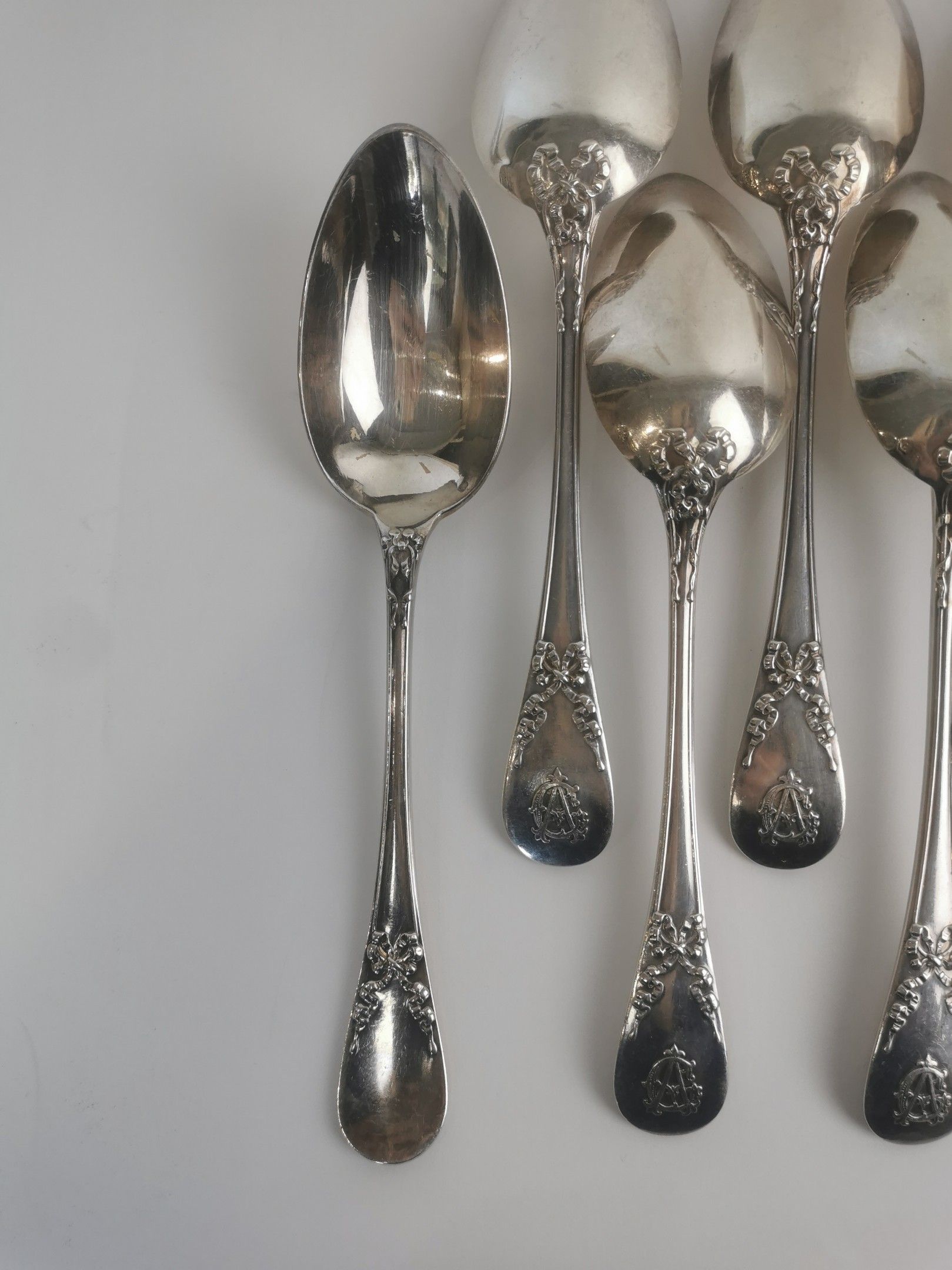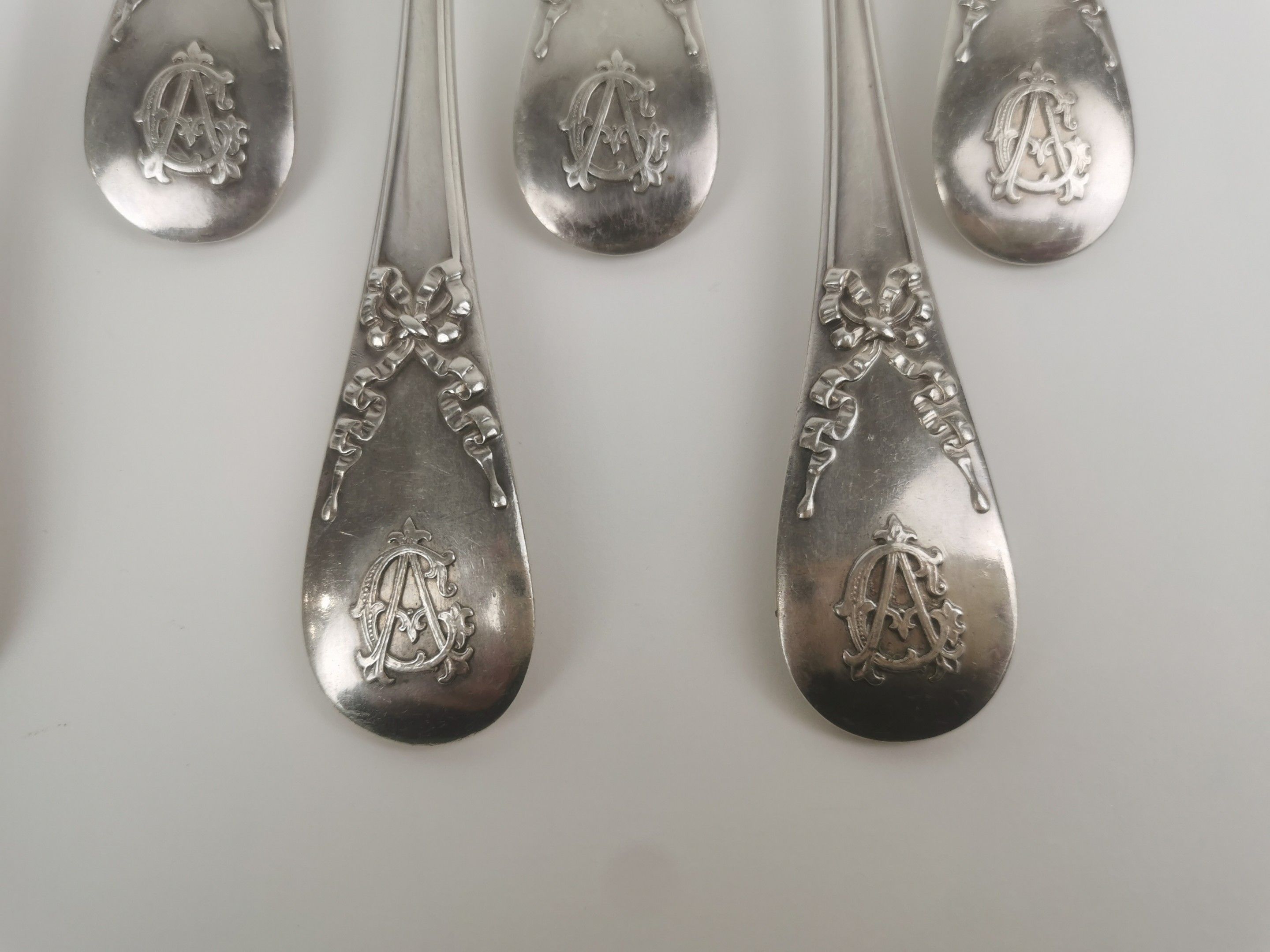 SERIES OF TWELVE Soup spoons in silver (925). PARIS, QUEILLE, ap. 1838 (Minerve). Baguette model with ribbon bow, the spatula decorated with the applied monogram CA. Weight 1020 g.
