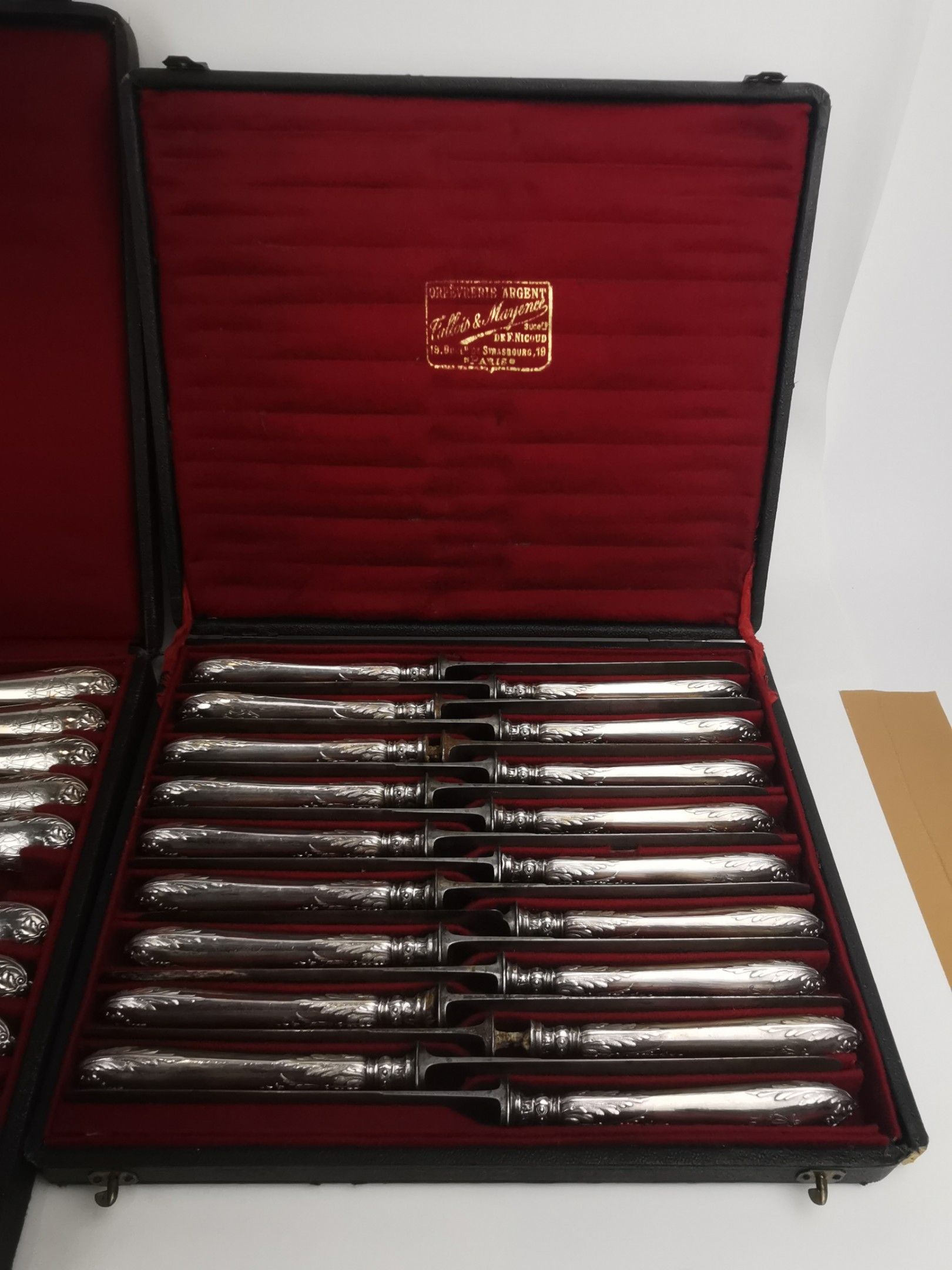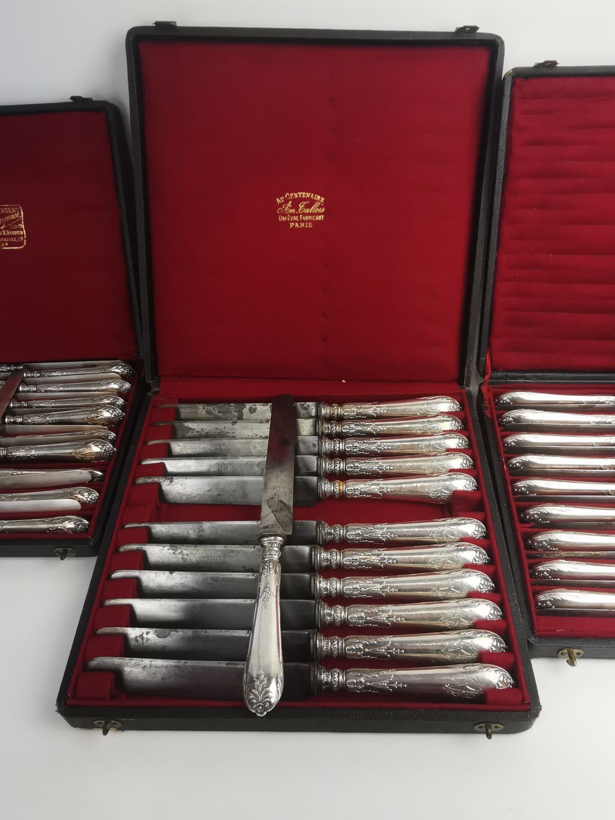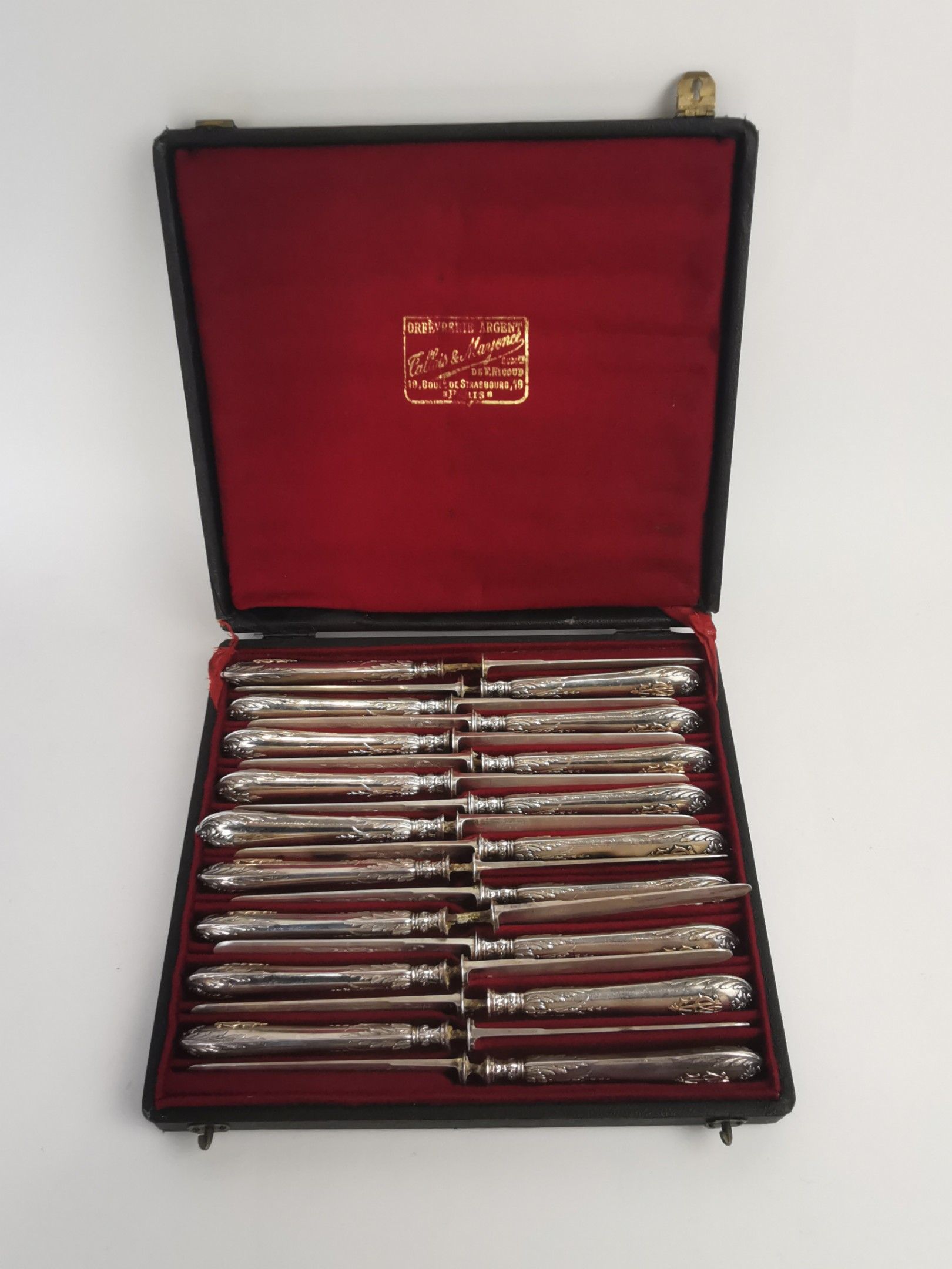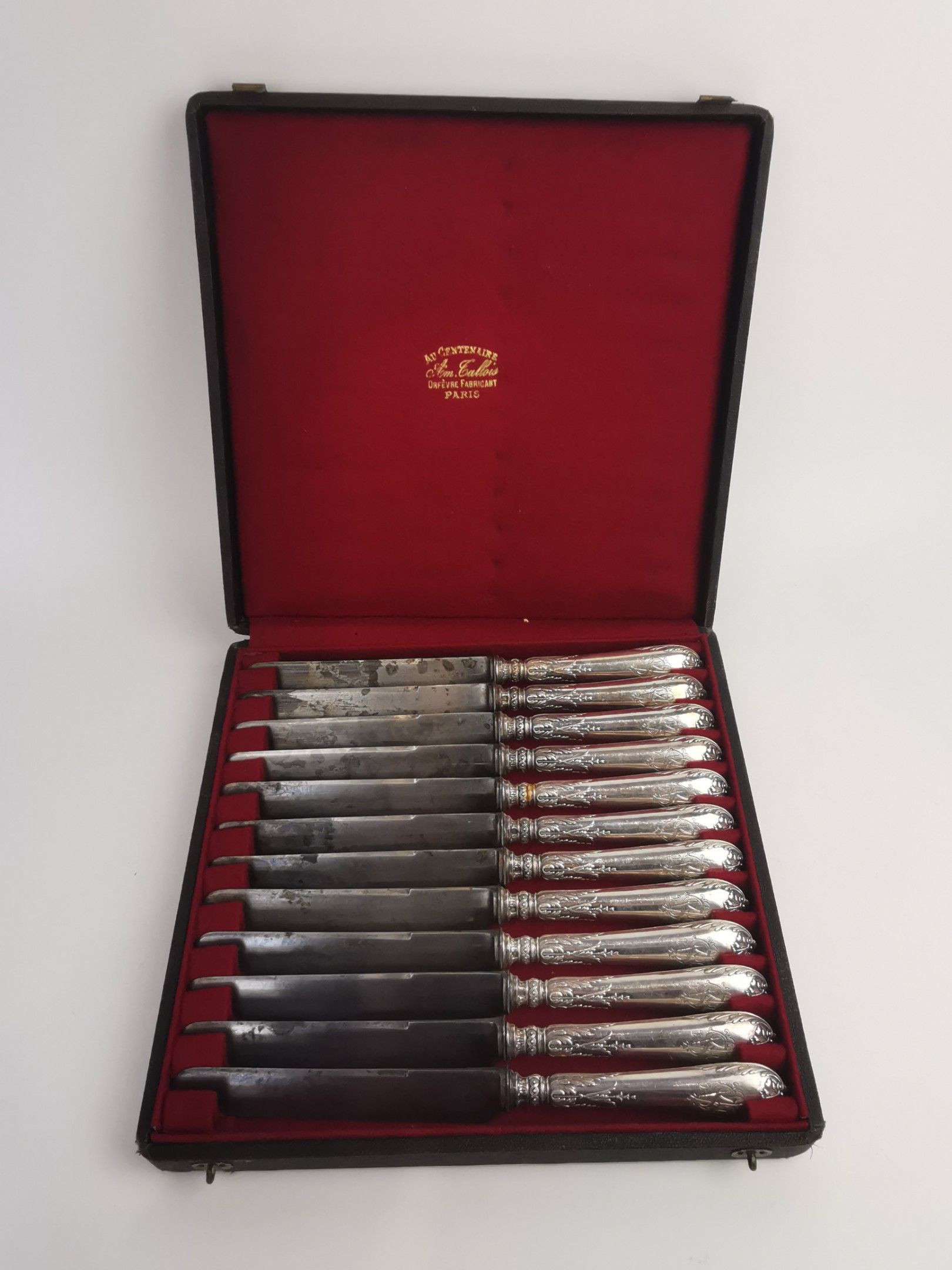 SERIES OF TWELVE TABLE KNIVES, EIGHTEEN FRUIT KNIVES AND EIGHTEEN CHEESE KNIVES, forged silver handles (925). PARIS, TALLOIS & MAYENCE, circa 1880 (Minerve). Model with floral and foliate decoration, ferrule with frieze of ovals and tracery, applied AS monogram gilded on the handle or engraved (for 12 table knives). The blades bear the maker's mark (variants). The series are presented in their cases, two of which are marked AS on the lid and one with the maker's mark on the lid (variant). Two cheese knives and ten fruit knives are very worn, as is one box. Gross weight 2254 g.