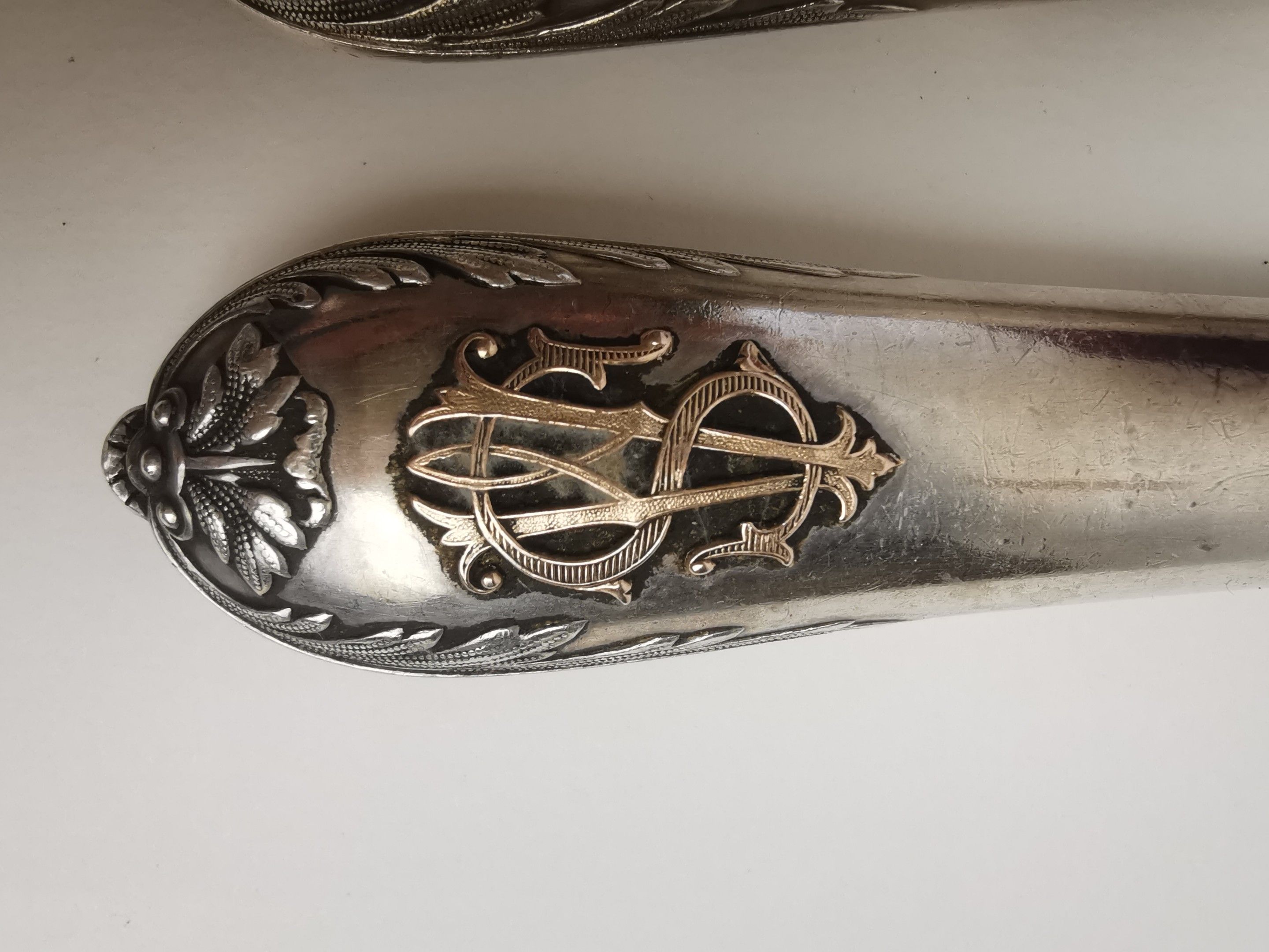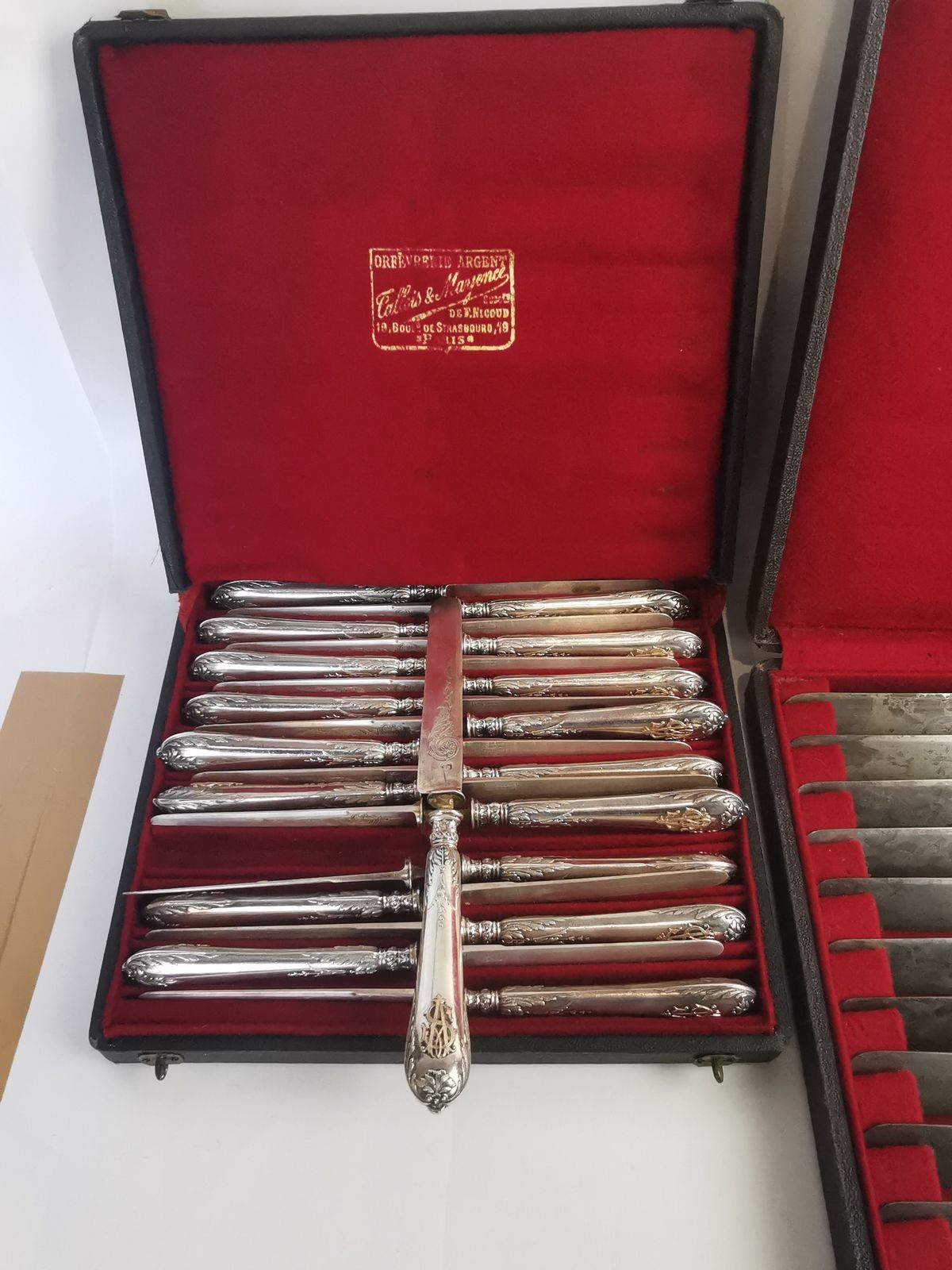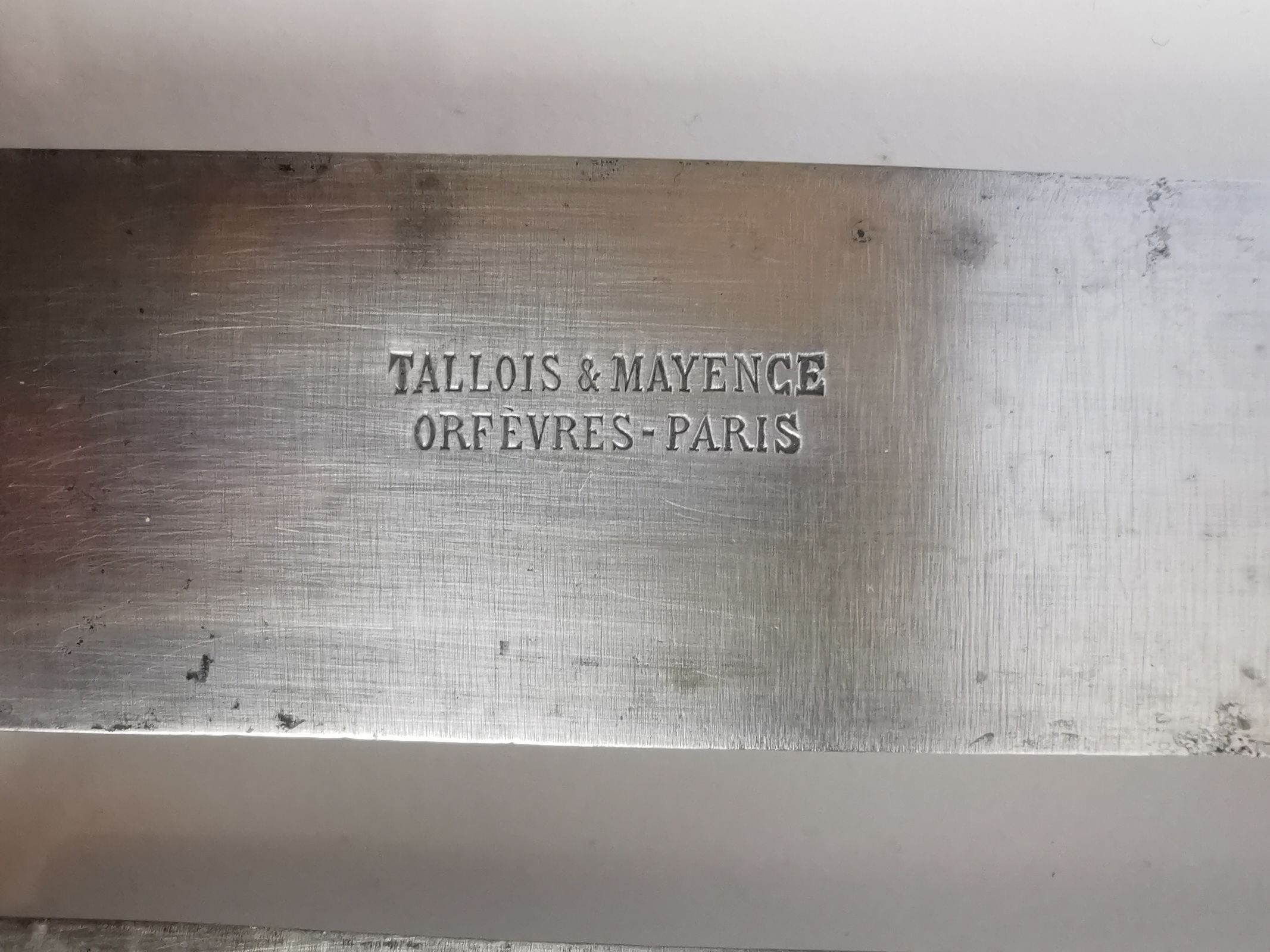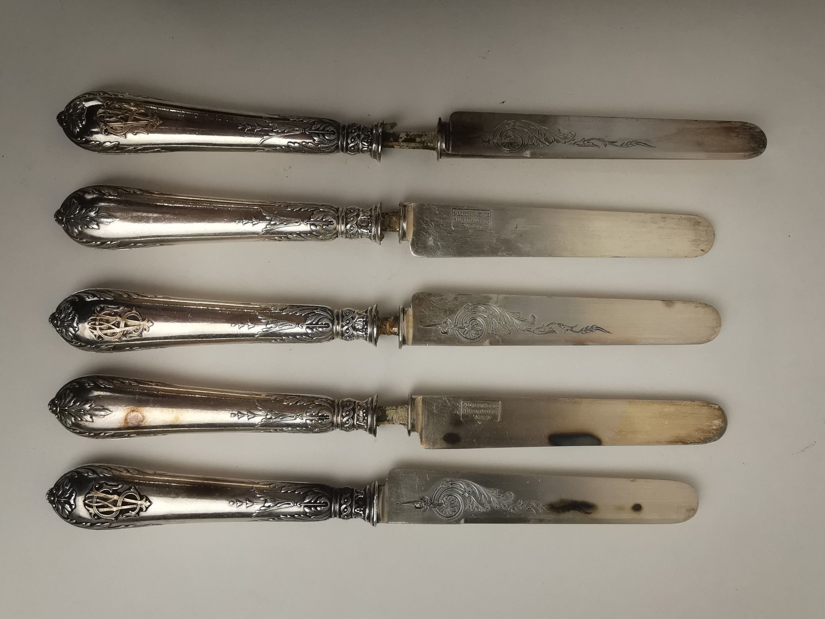 SERIES OF TWELVE TABLE KNIVES, EIGHTEEN FRUIT KNIVES AND EIGHTEEN CHEESE KNIVES, forged silver handles (925). PARIS, TALLOIS & MAYENCE, circa 1880 (Minerve). Model with floral and foliate decoration, ferrule with frieze of ovals and tracery, applied AS monogram gilded on the handle or engraved (for 12 table knives). The blades bear the maker's mark (variants). The series are presented in their cases, two of which are marked AS on the lid and one with the maker's mark on the lid (variant). Two cheese knives and ten fruit knives are very worn, as is one box. Gross weight 2254 g.