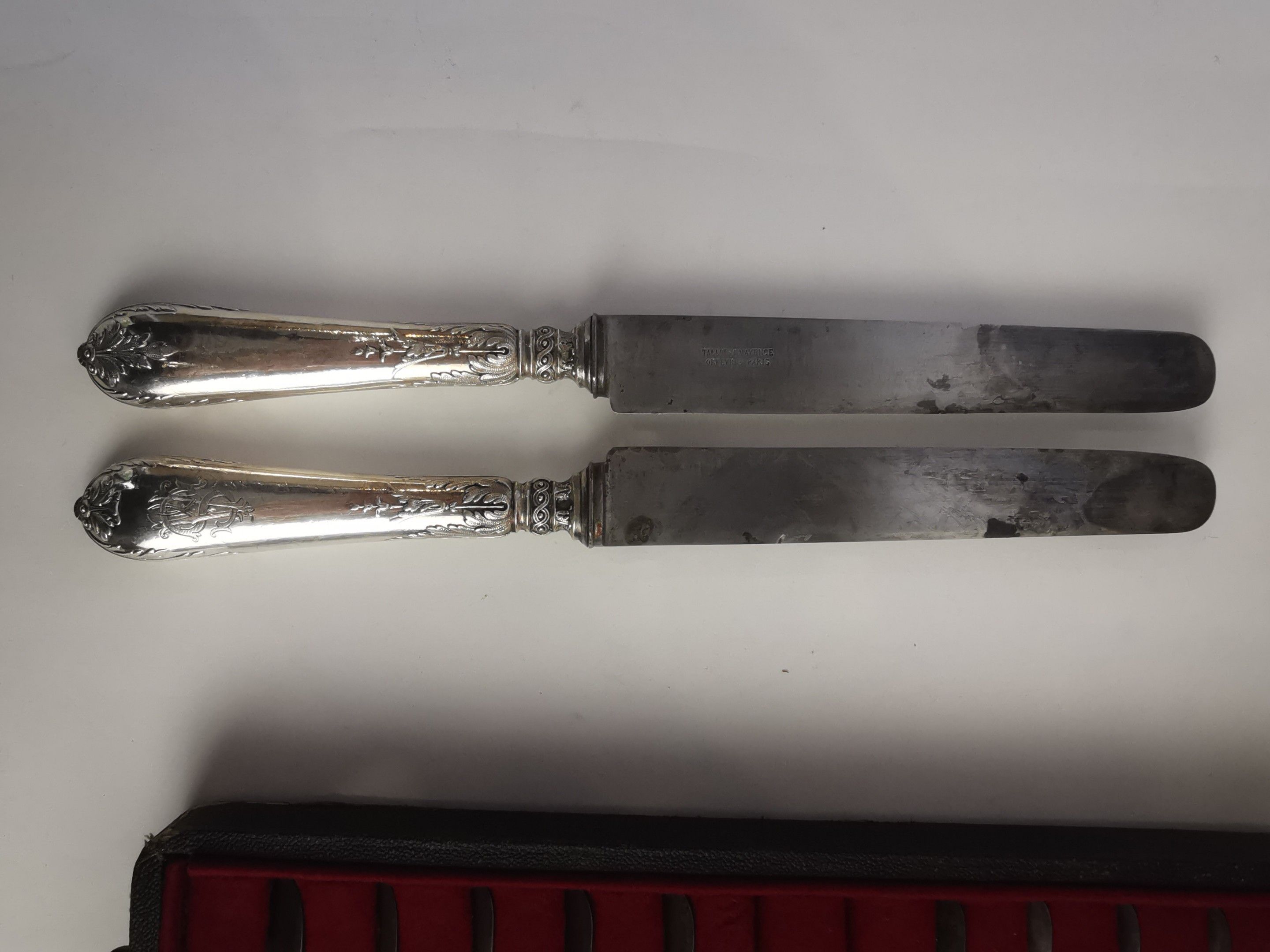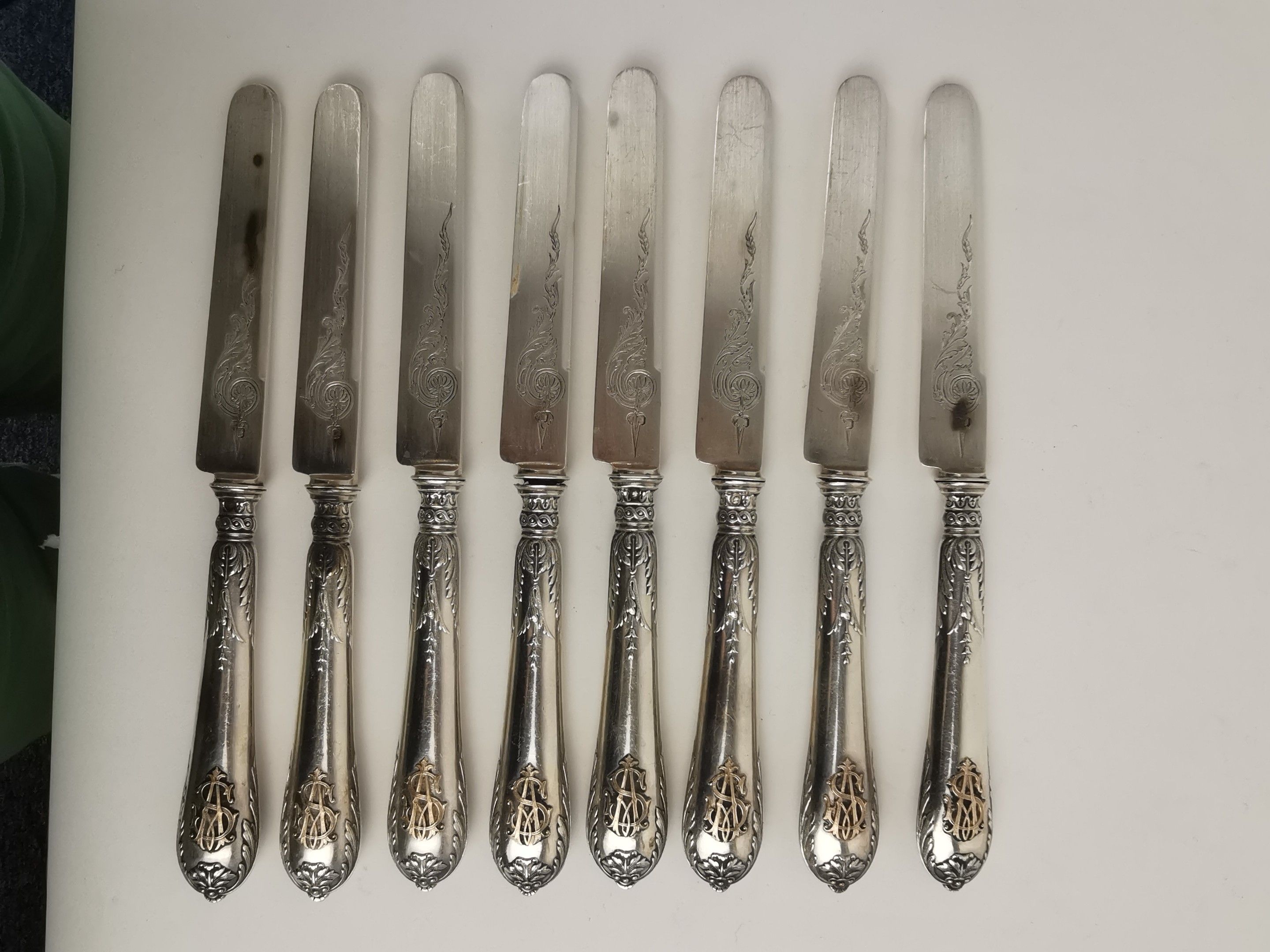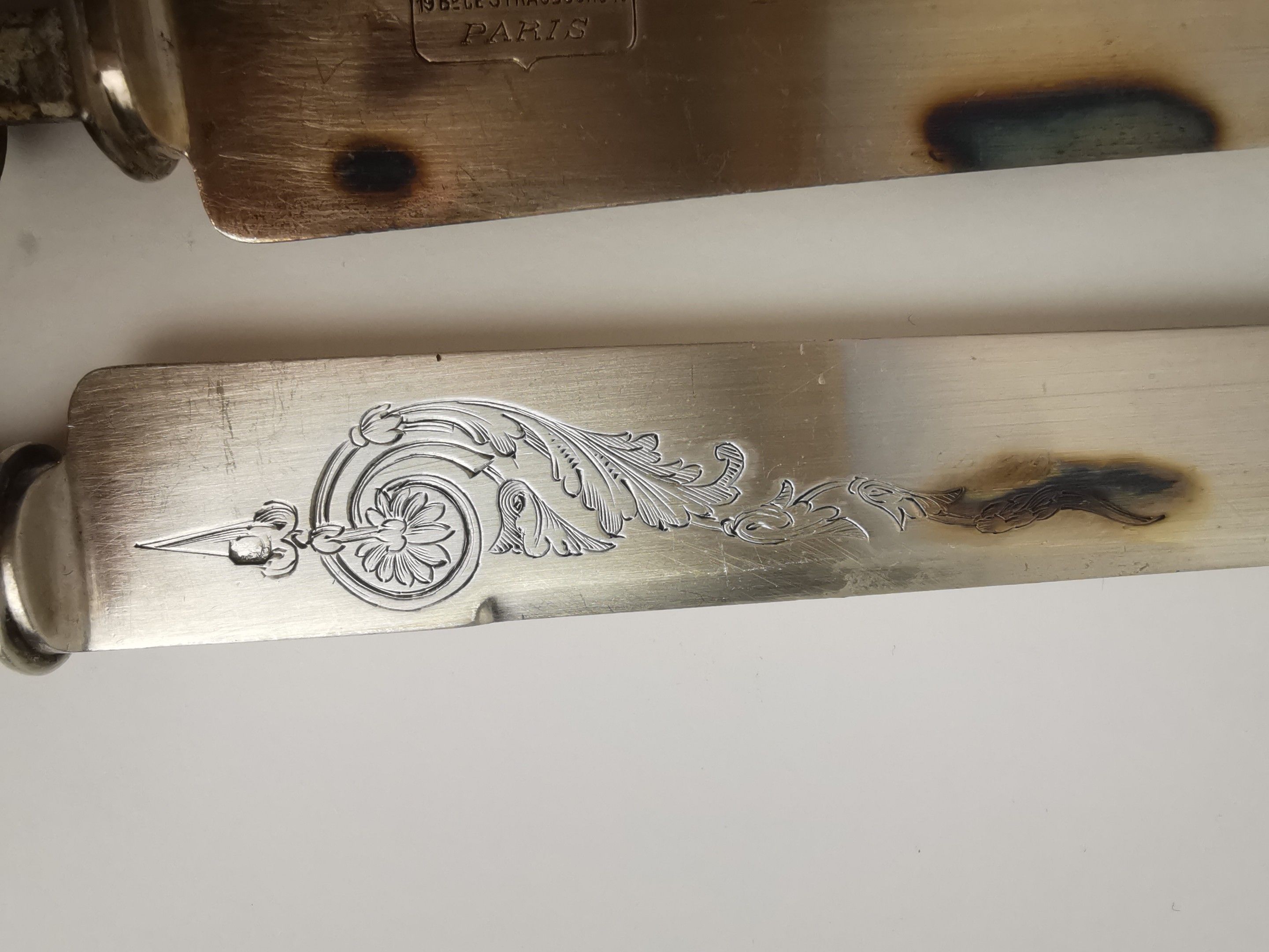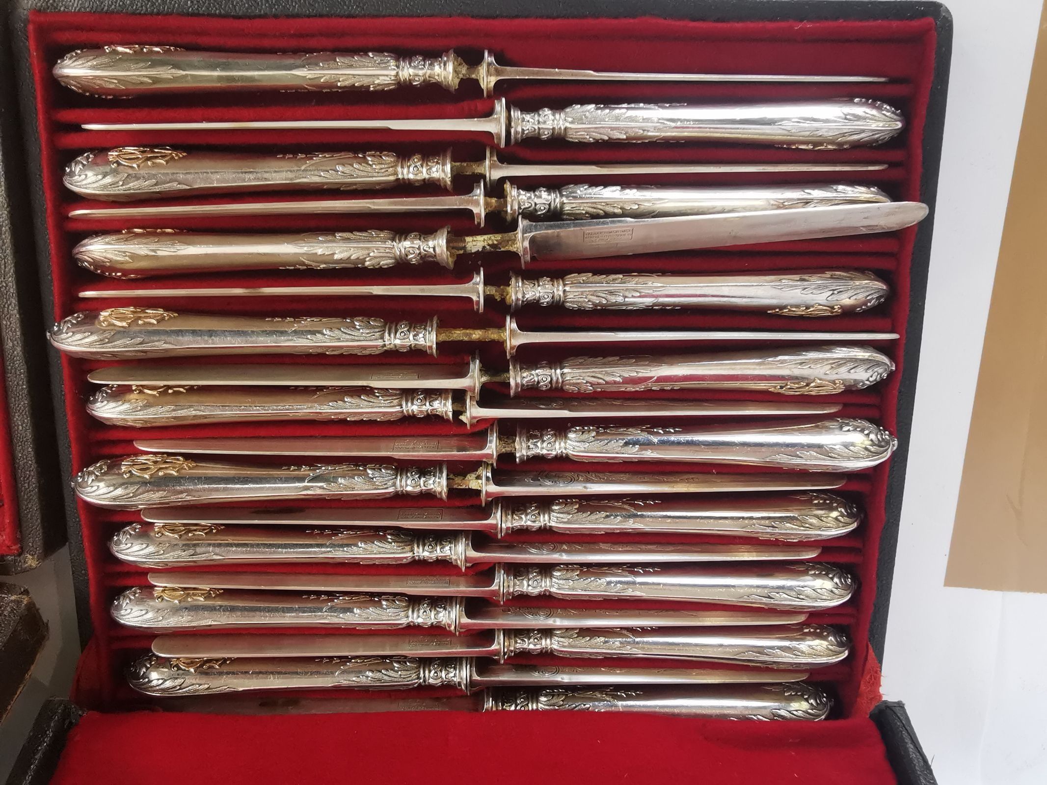 SERIES OF TWELVE TABLE KNIVES, EIGHTEEN FRUIT KNIVES AND EIGHTEEN CHEESE KNIVES, forged silver handles (925). PARIS, TALLOIS & MAYENCE, circa 1880 (Minerve). Model with floral and foliate decoration, ferrule with frieze of ovals and tracery, applied AS monogram gilded on the handle or engraved (for 12 table knives). The blades bear the maker's mark (variants). The series are presented in their cases, two of which are marked AS on the lid and one with the maker's mark on the lid (variant). Two cheese knives and ten fruit knives are very worn, as is one box. Gross weight 2254 g.
