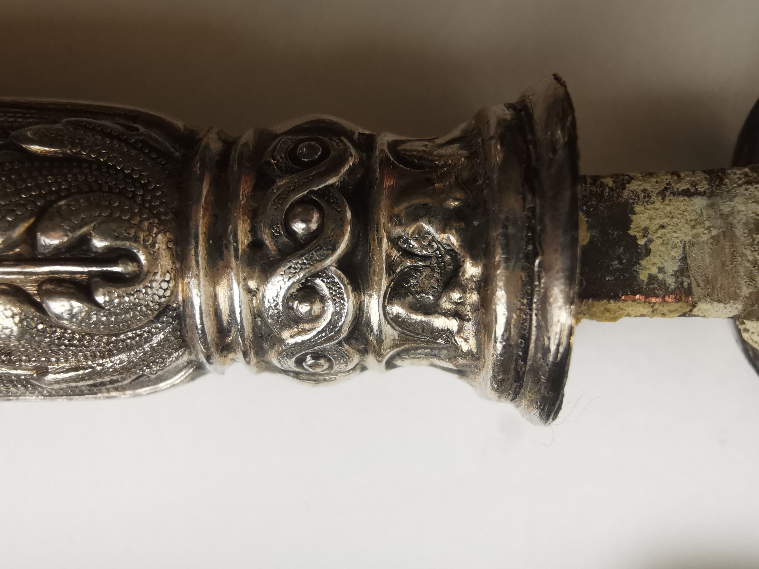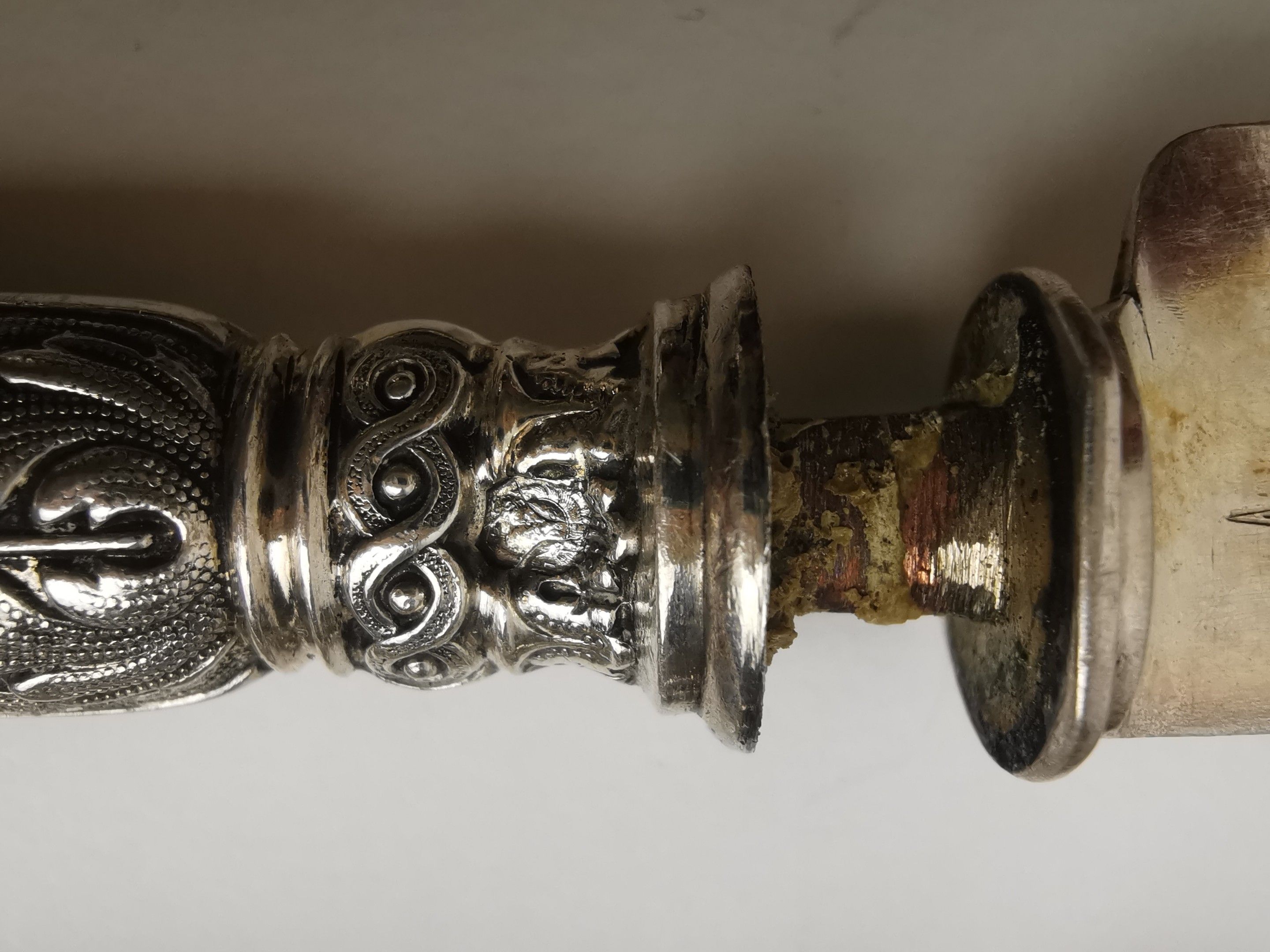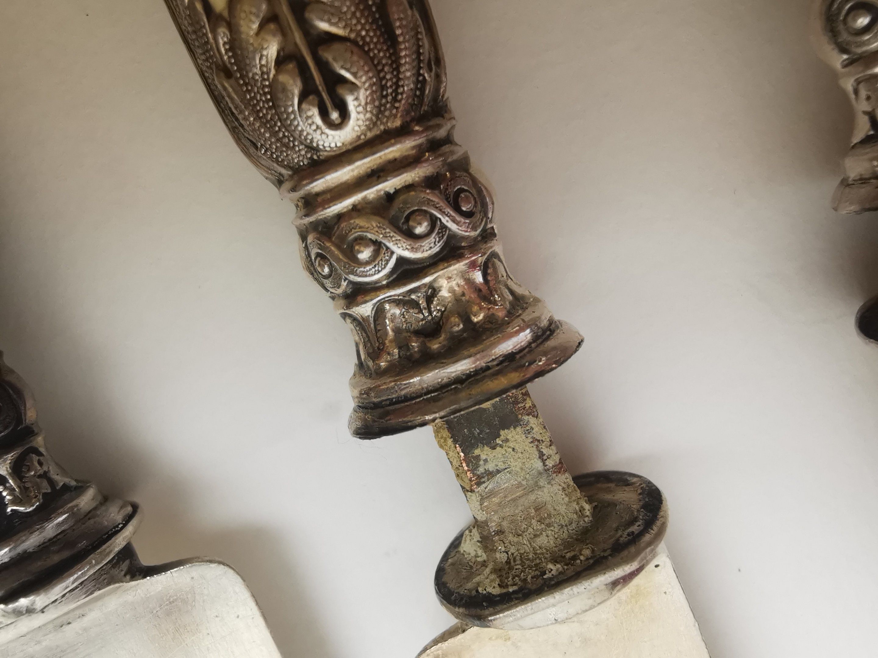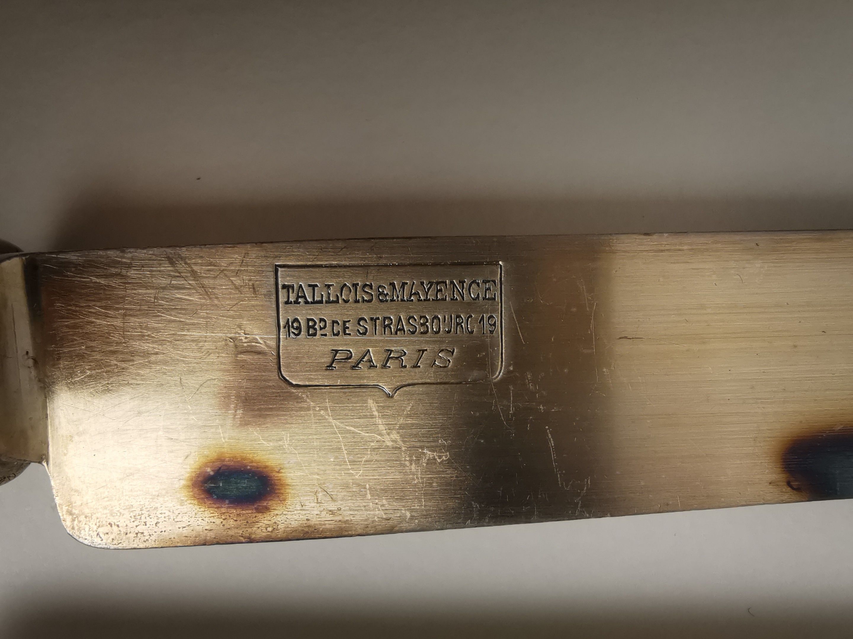 SERIES OF TWELVE TABLE KNIVES, EIGHTEEN FRUIT KNIVES AND EIGHTEEN CHEESE KNIVES, forged silver handles (925). PARIS, TALLOIS & MAYENCE, circa 1880 (Minerve). Model with floral and foliate decoration, ferrule with frieze of ovals and tracery, applied AS monogram gilded on the handle or engraved (for 12 table knives). The blades bear the maker's mark (variants). The series are presented in their cases, two of which are marked AS on the lid and one with the maker's mark on the lid (variant). Two cheese knives and ten fruit knives are very worn, as is one box. Gross weight 2254 g.