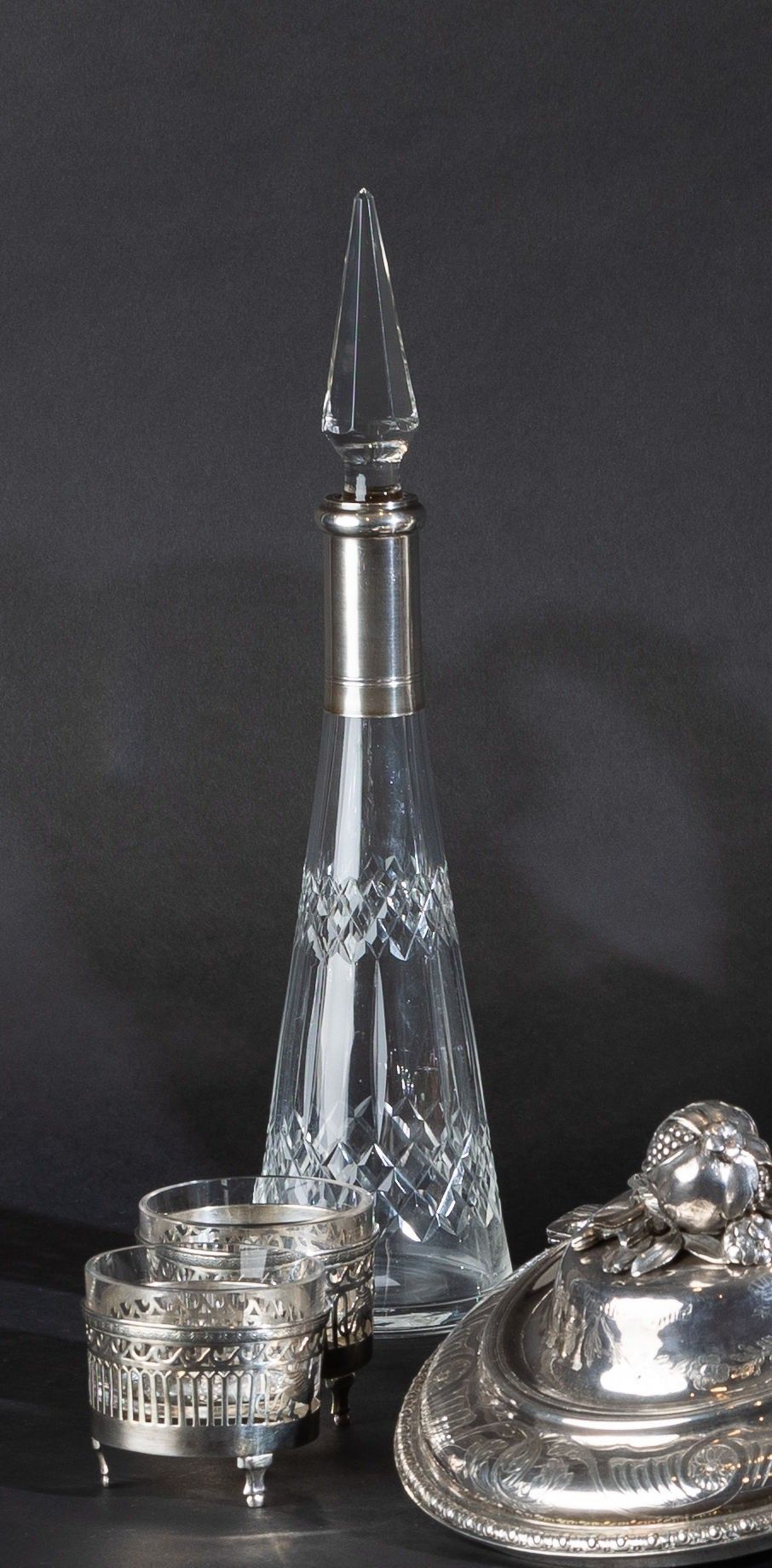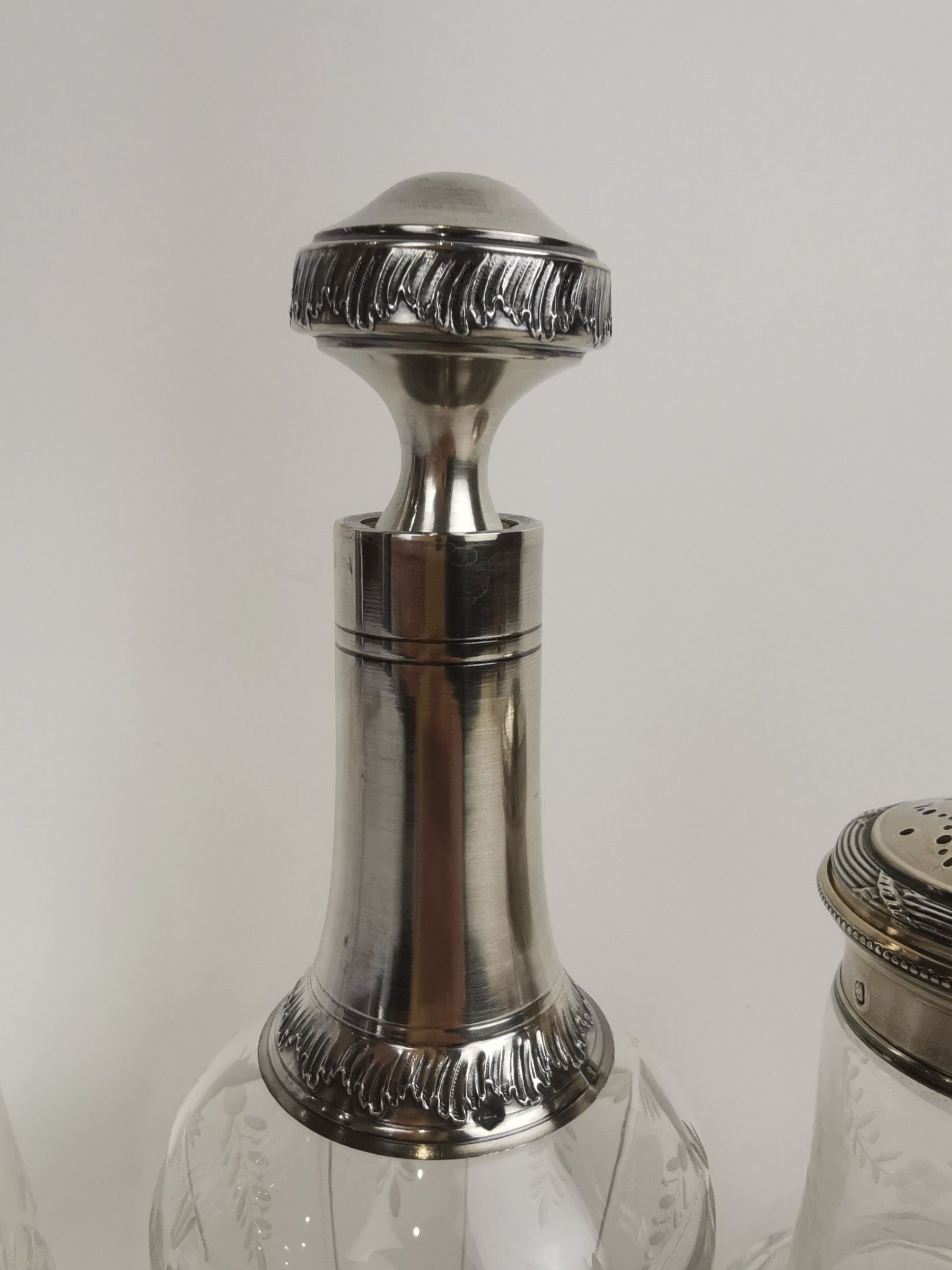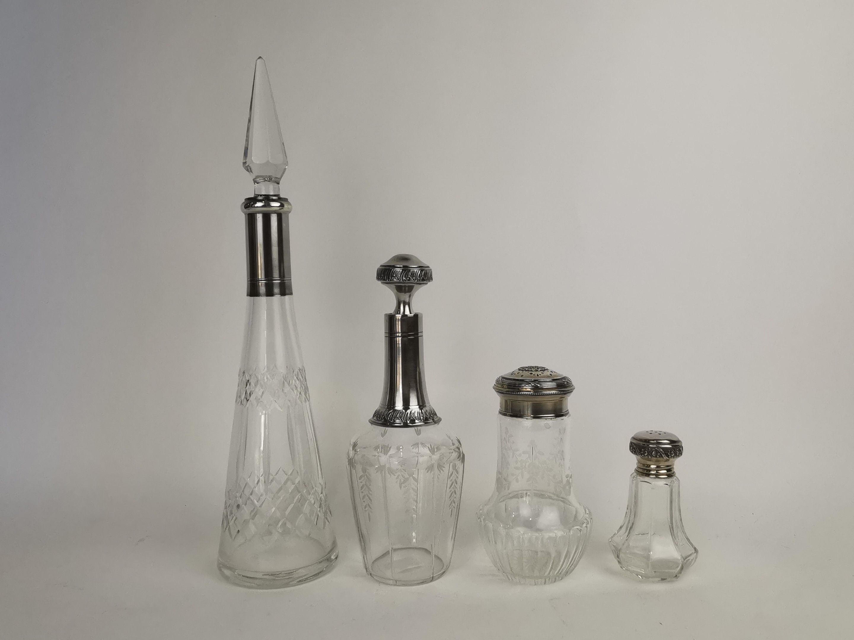 TWO silver (925) CARAFES, TWO SAUPOUDROIRS, crystal bodies. PARIS, various silversmiths, ap. 1838 (Minerve). Two carafes, the larger of which has a flat-bottomed truncated cone shape, two saupoudroirs, one of which is a saleron, old gilt stopper. Crystal body with engraved decoration. Silver trim and stoppers. Height (large carafe) 32 cm; total gross weight 890 g.