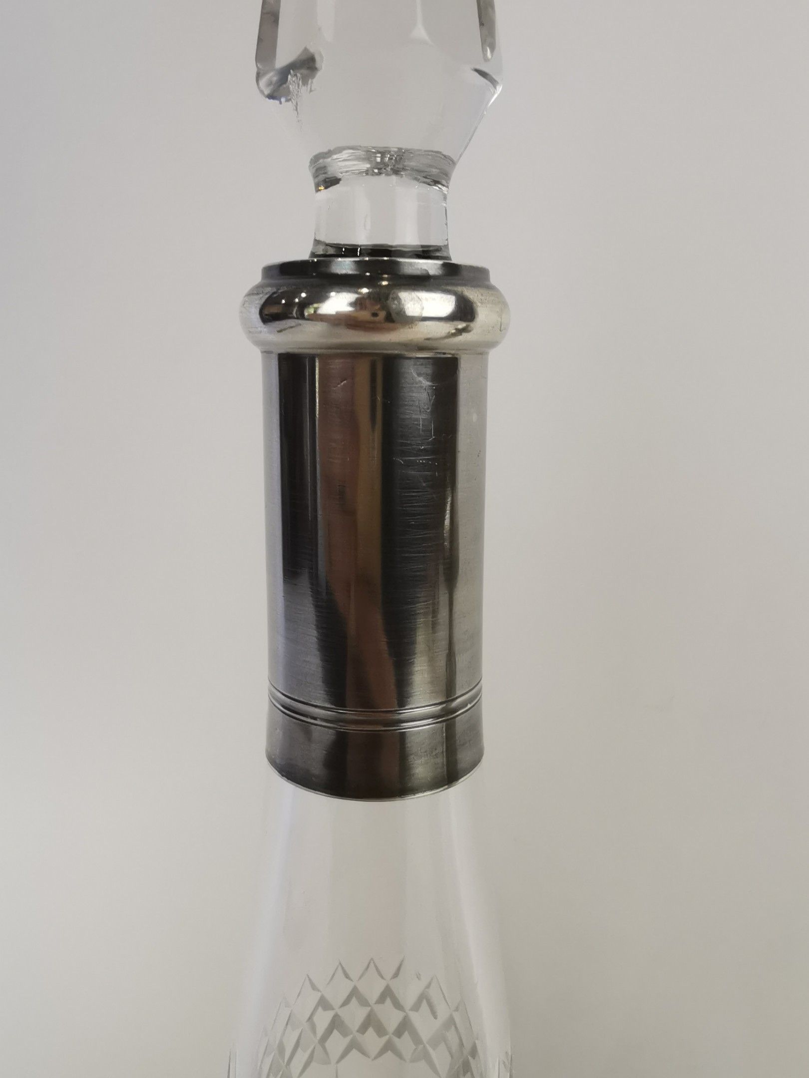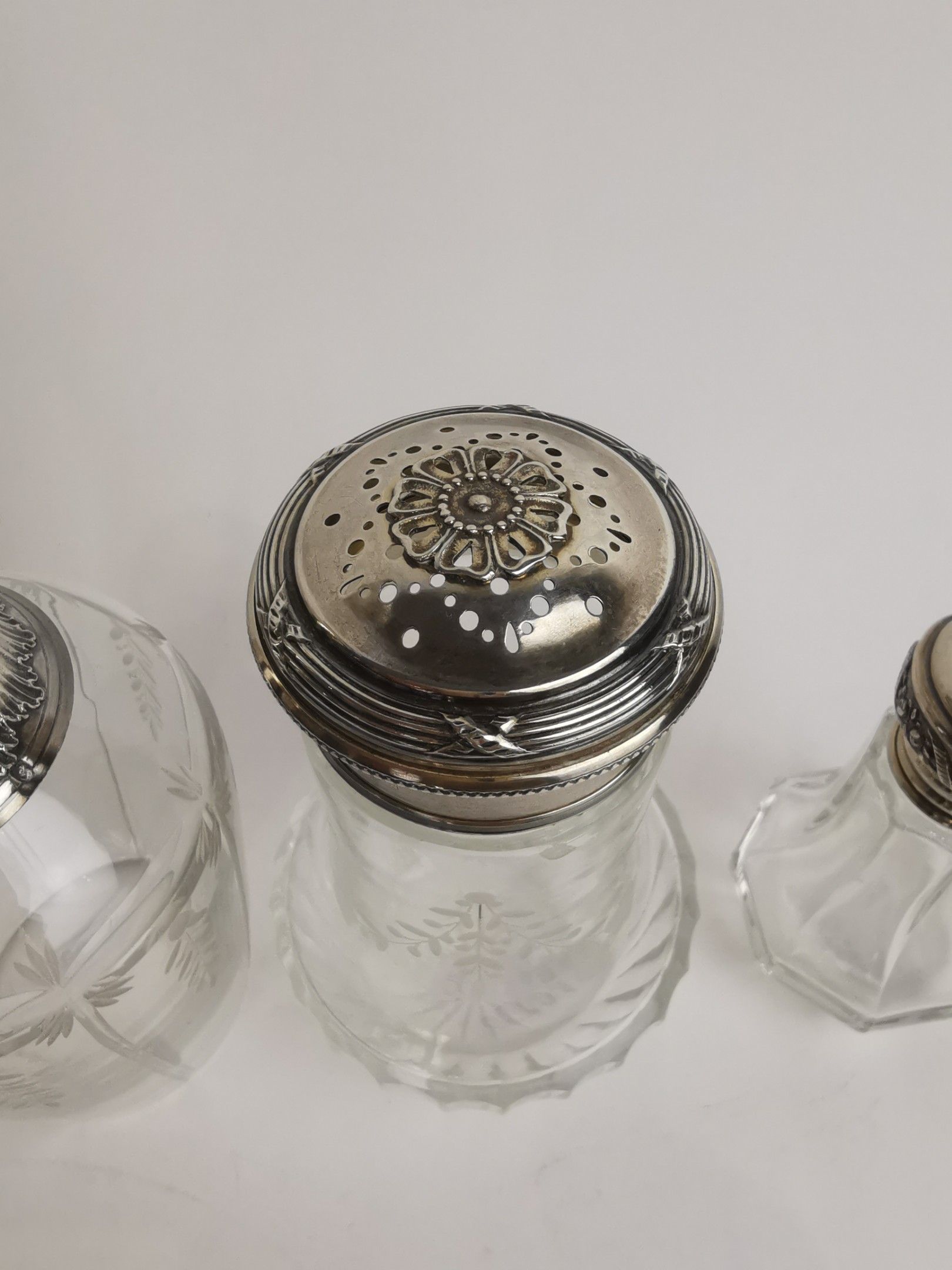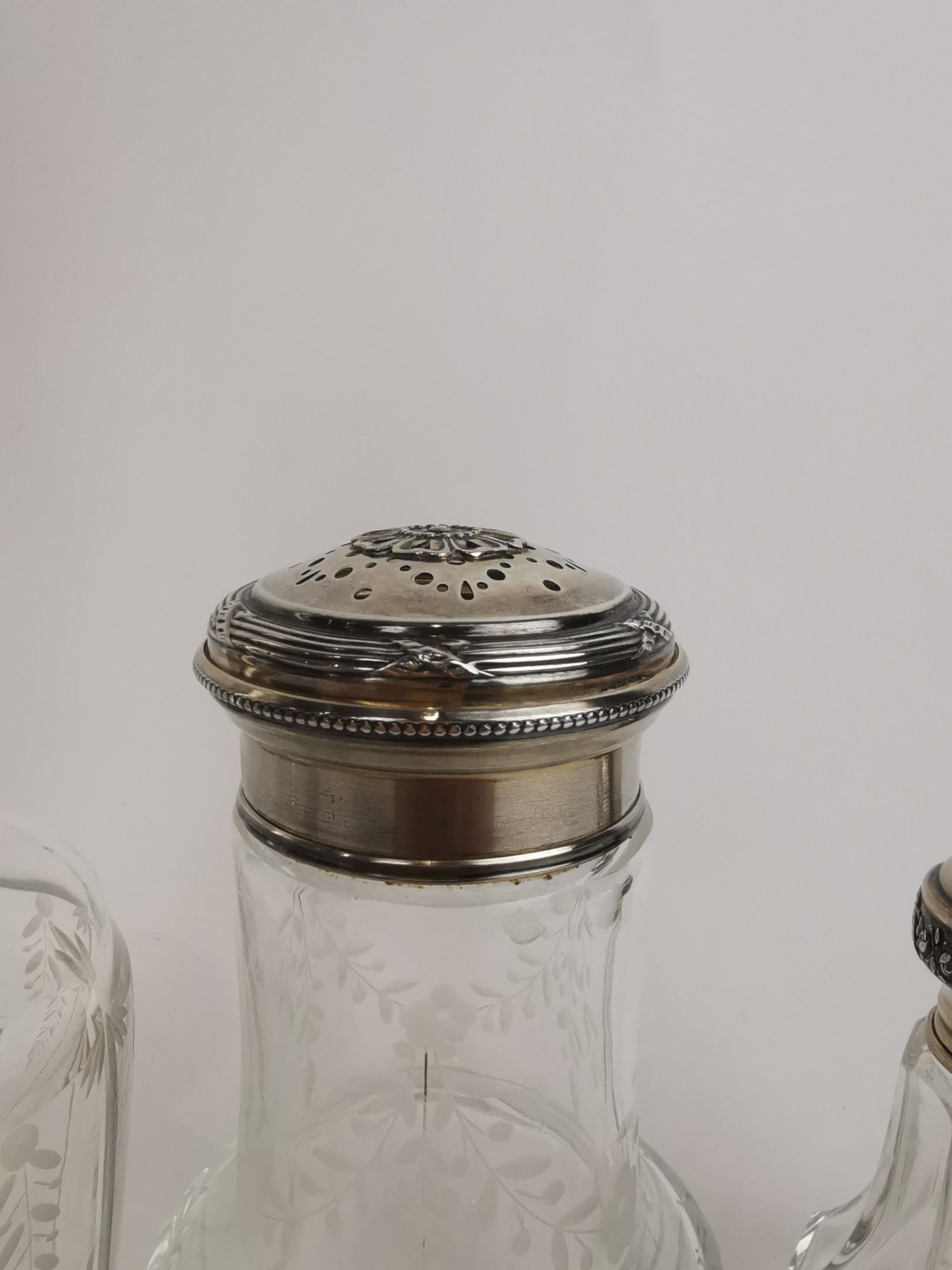 TWO silver (925) CARAFES, TWO SAUPOUDROIRS, crystal bodies. PARIS, various silversmiths, ap. 1838 (Minerve). Two carafes, the larger of which has a flat-bottomed truncated cone shape, two saupoudroirs, one of which is a saleron, old gilt stopper. Crystal body with engraved decoration. Silver trim and stoppers. Height (large carafe) 32 cm; total gross weight 890 g.