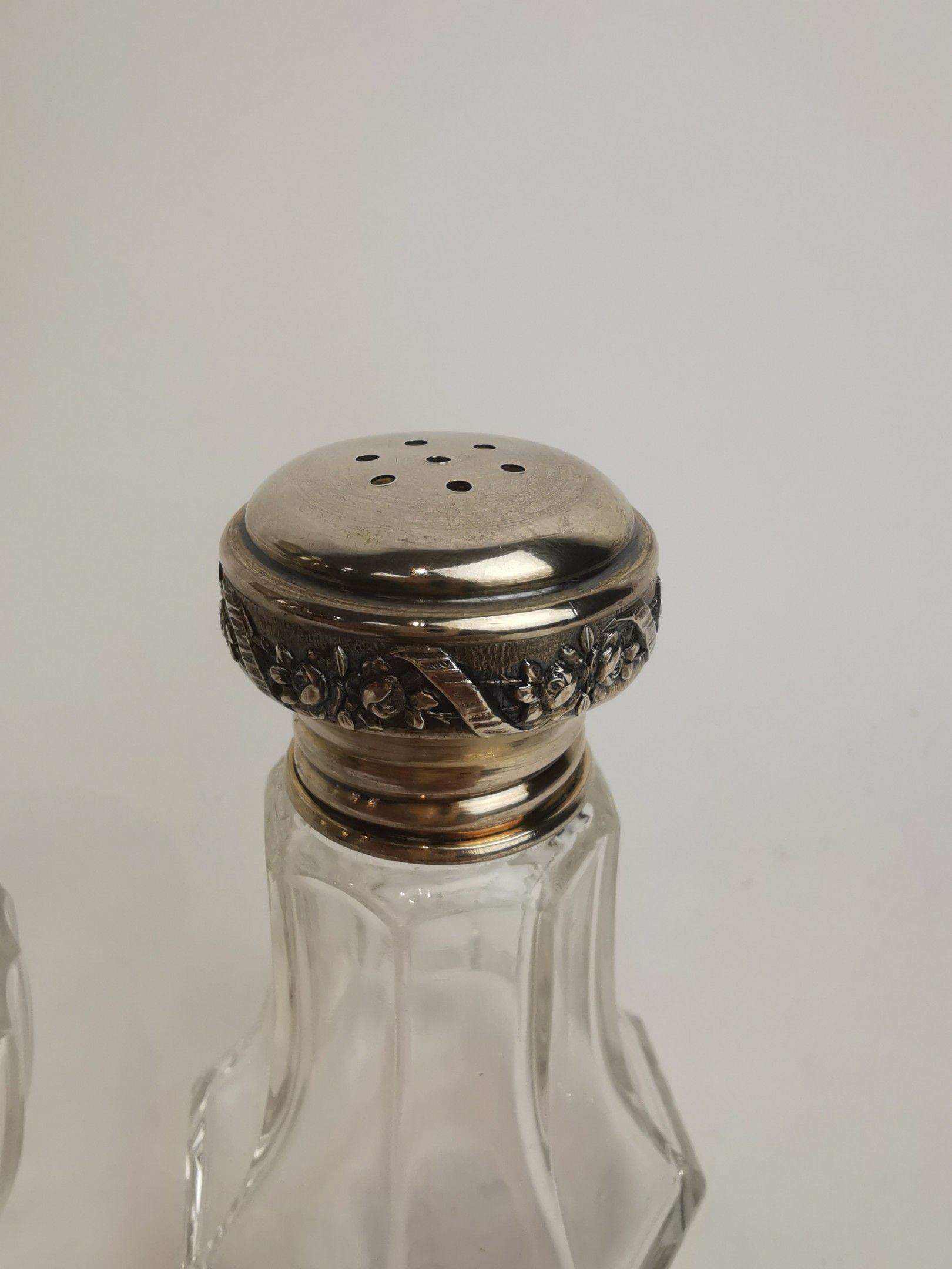 TWO silver (925) CARAFES, TWO SAUPOUDROIRS, crystal bodies.