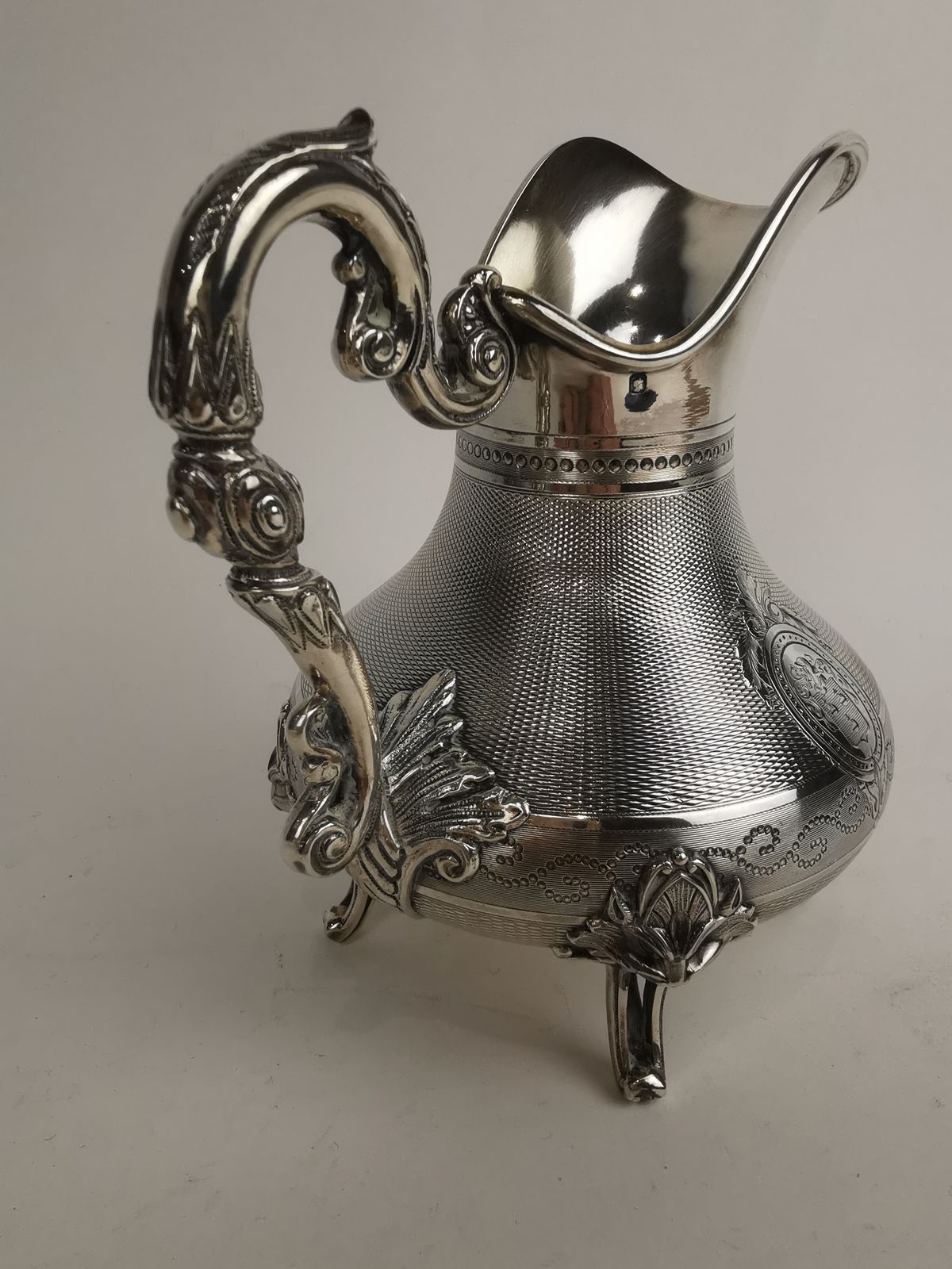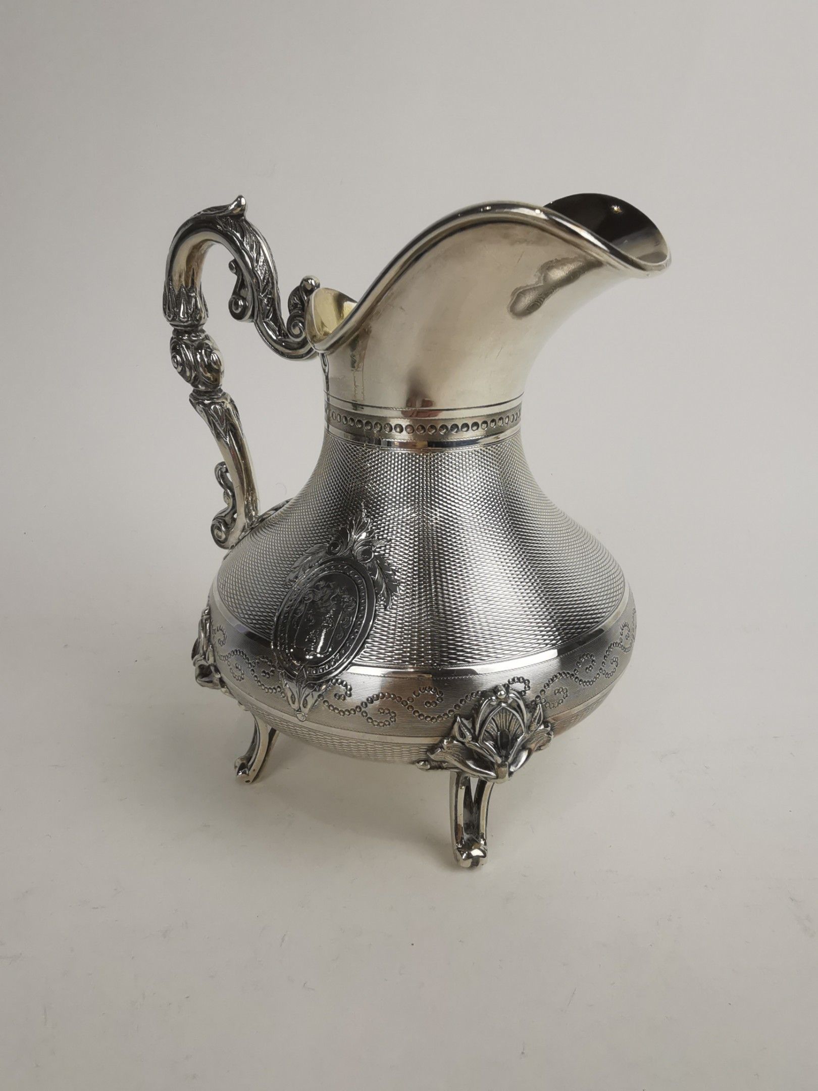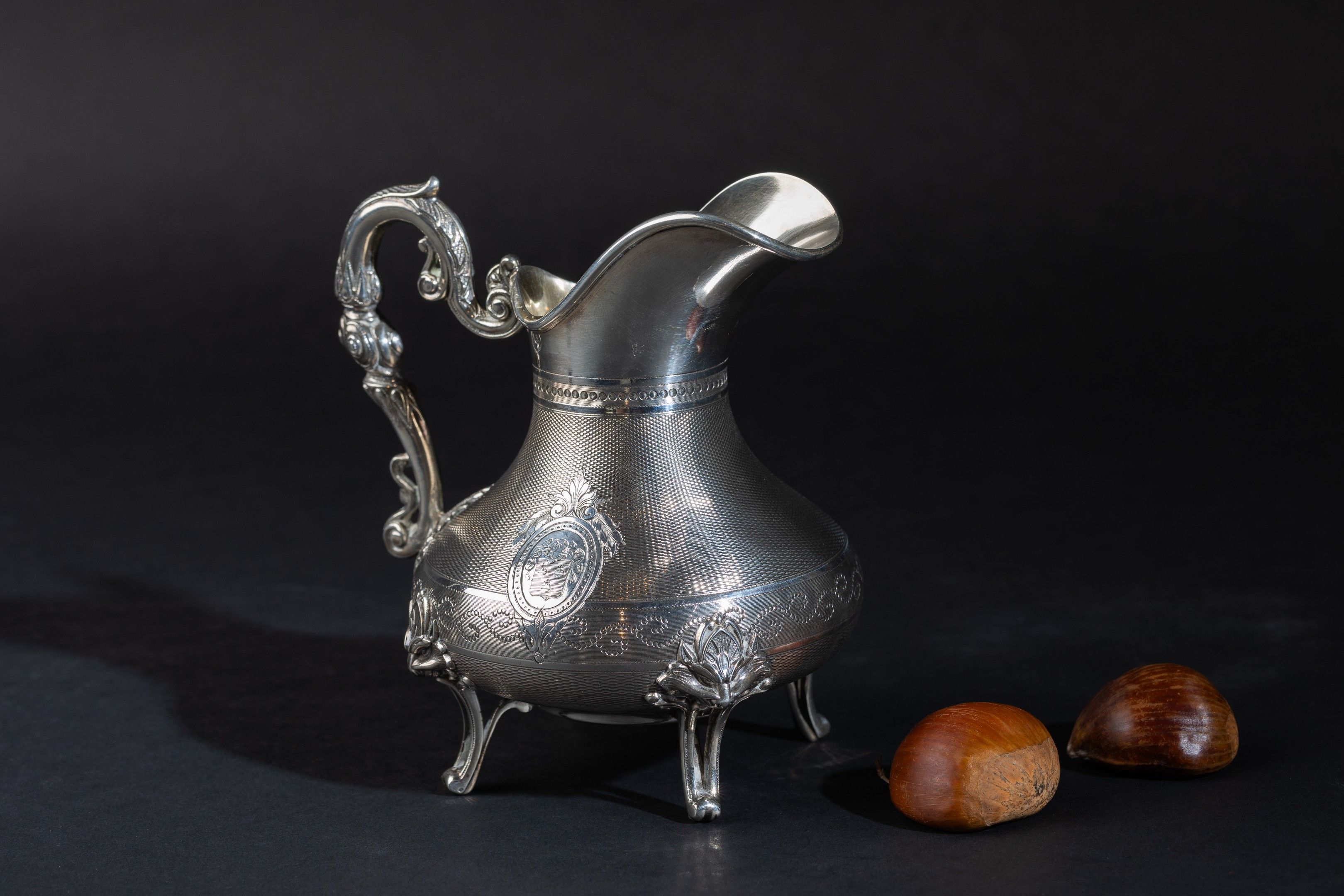 Silver MILK POT (925). PARIS, Auguste-Louis FIZAINE, 1858-1879 (Minerve). Pansu quadripod, stylized lion's head foot attachments, guilloche basketwork decoration, engraved medallion at mid-panel flory with coat of arms stamped with a helmet tared in profile: azure three orbs posed 2, 1. Curved flory handle. Height 13 cm; weight 212 g.