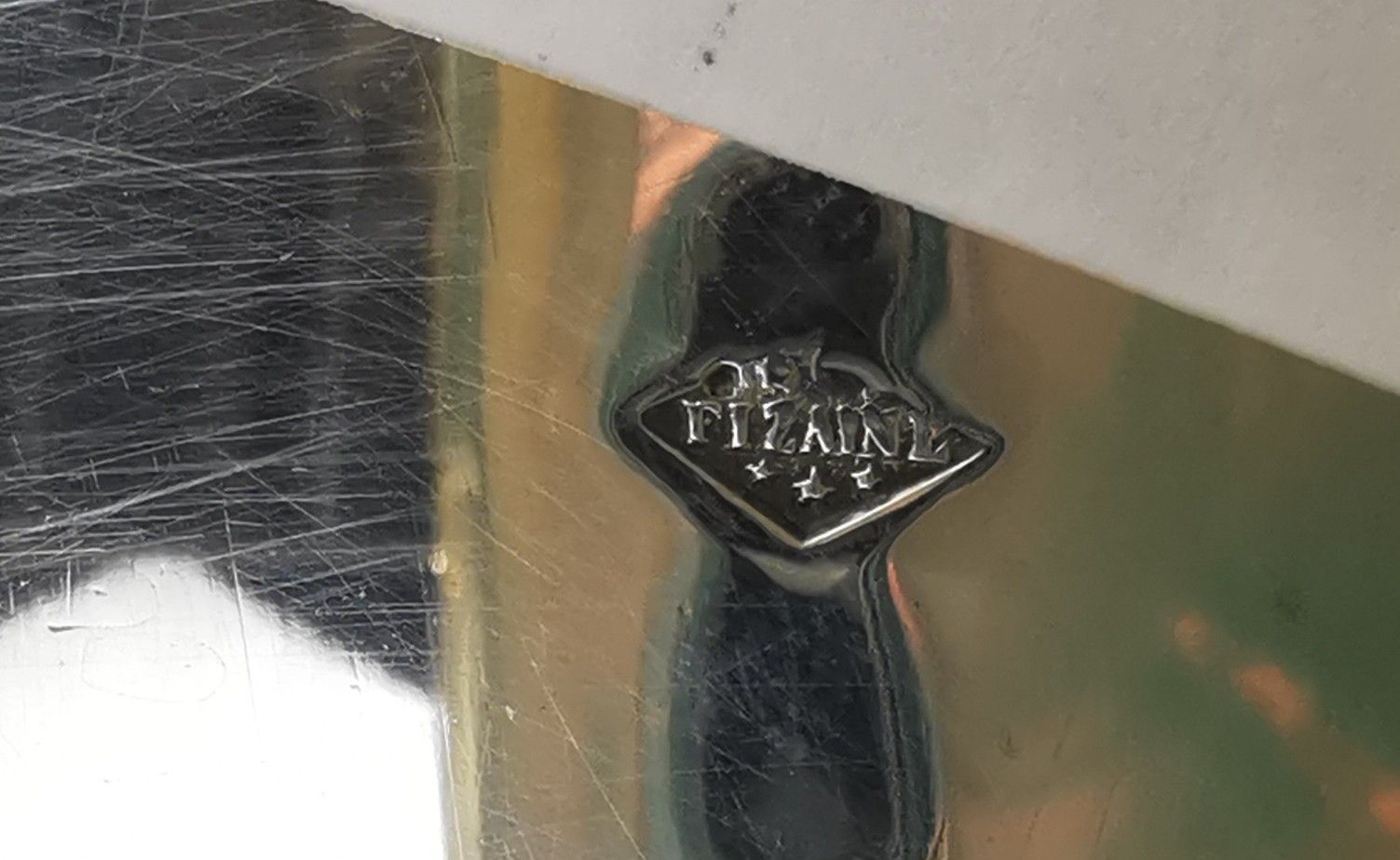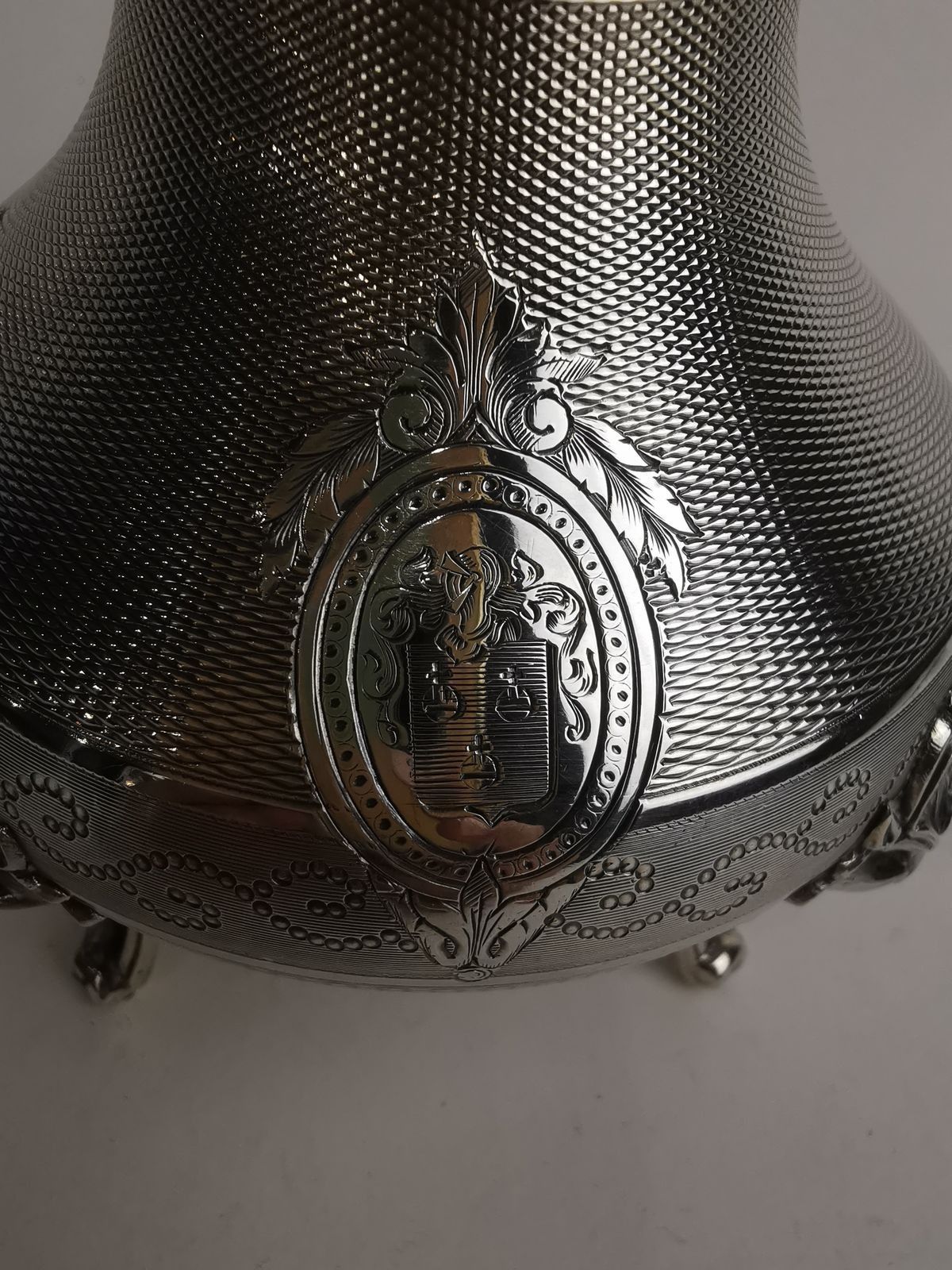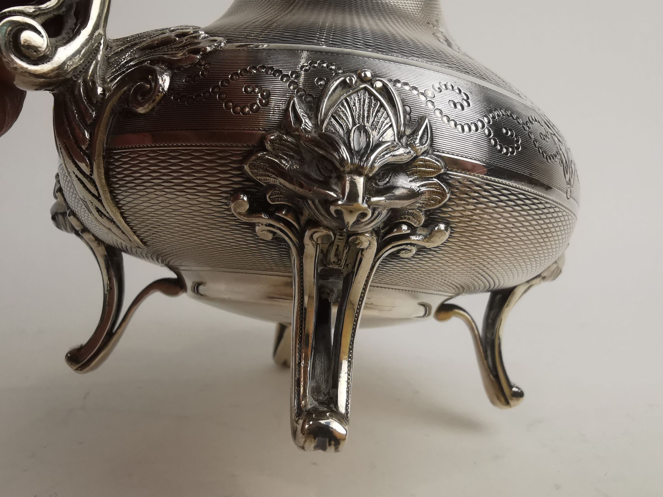Silver MILK POT (925). PARIS, Auguste-Louis FIZAINE, 1858-1879 (Minerve). Pansu quadripod, stylized lion's head foot attachments, guilloche basketwork decoration, engraved medallion at mid-panel flory with coat of arms stamped with a helmet tared in profile: azure three orbs posed 2, 1. Curved flory handle. Height 13 cm; weight 212 g.