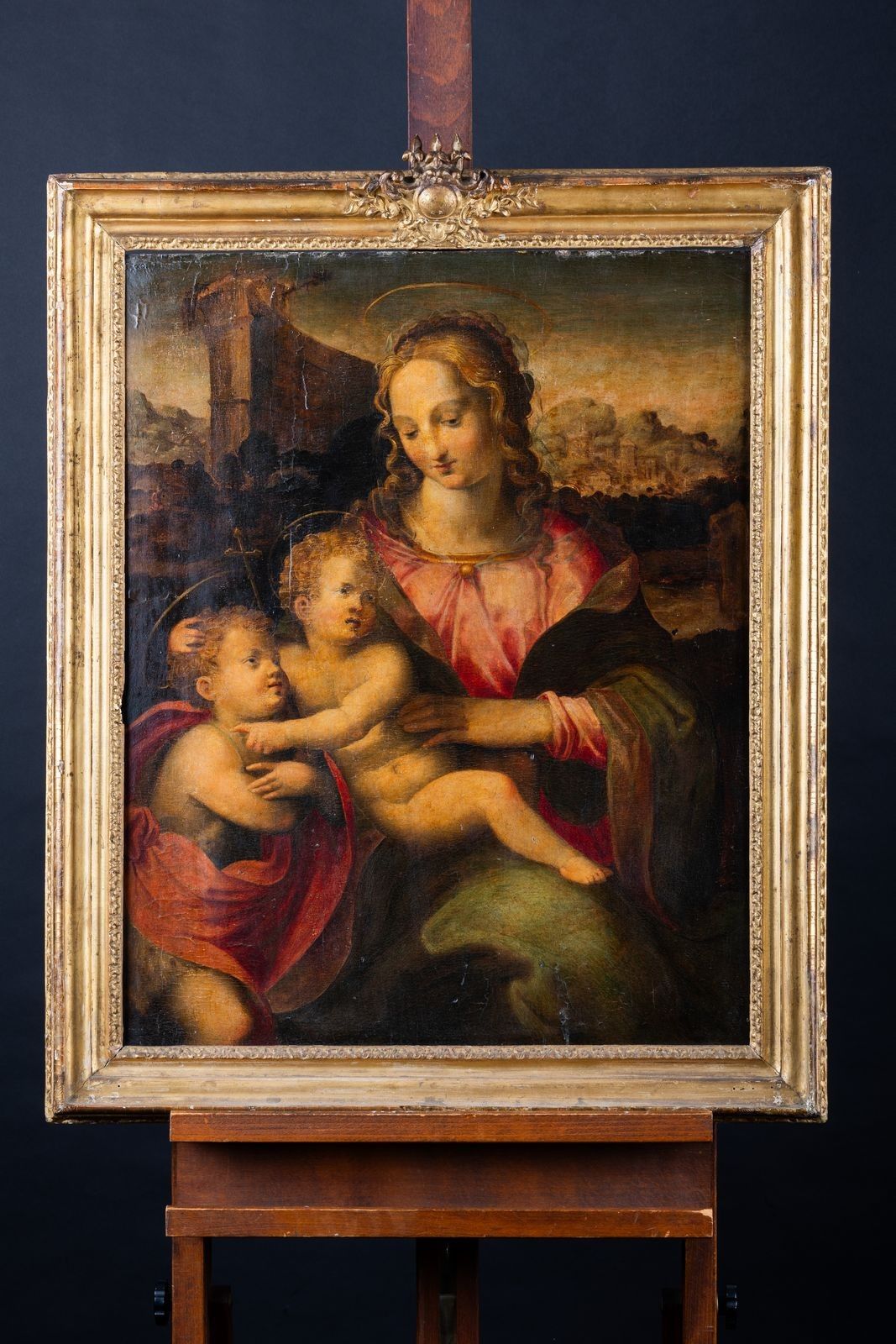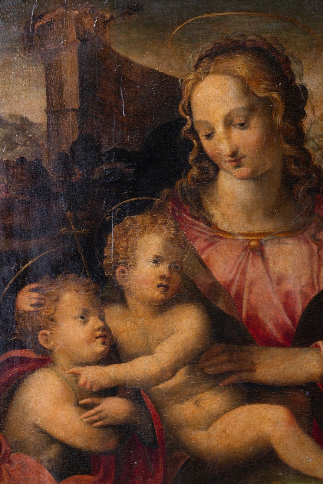 The composition was created around the middle of the 16th century by the Florentine artist Michele Tosini. A pupil of Lorenzo di Credi and Antonio del Ceraiolo, he later joined the workshop of Ridolfo Ghirlandaio, hence his nickname Michele di Ridolfo del Ghirlandaio. A frescoist, portraitist and painter of devotional works, he was initially influenced by the great masters of the classical Renaissance, such as Andrea del Sarto and Fra Bartolomeo, before turning to the mannerism of Francesco Salviati, Agnolo Bronzino and Giorgio Vasari, whom he assisted in decorating the Palazzo Vecchio in Florence. From then on, his style was characterised by sculptural figures, decorative attention to drapery and hair, and a vivid, bluish palette. Tosini was responsible for a number of important decorations and a large number of altarpieces and paintings, some of which he produced in his studio with the help of artists such as Bernardino Poccetti and Francesco Brini. Our painting is fully in keeping with this high-quality production, and the underlying drawing is visible beneath the layer of paint that has become translucent over time. However, our version differs from the others in that the background includes an imposing semi-circular ancient ruin to the left of the Virgin. Among the other known compositions, two were offered for sale in Vienna (Dorotheum) on 15 August 1964 (oil on panel, 75 x 56 cm), and in Milan (Finarte) on 24 May 1976 (oil on panel, 76 x 65.5 cm), both of which feature a landscape with a castle in the background, with a town to the right in the 1976 version. Other autographed versions are known in Baltimore, Walters Art Museum (inv. 37.1025), and in Glasgow, Kelvingrove Art Gallery and Museum (inv. 165). Numerous replicas of varying size and quality have been found in private collections.