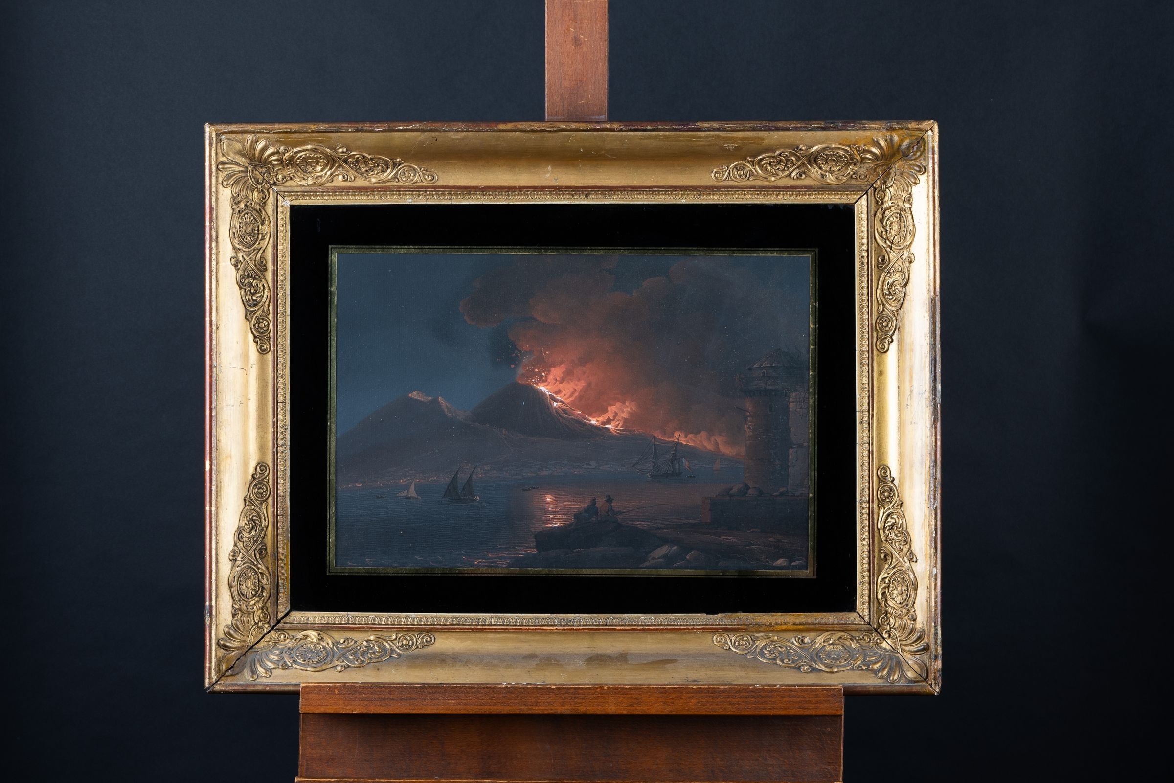 View of Vesuvius erupting at night, with fishermen in the foreground