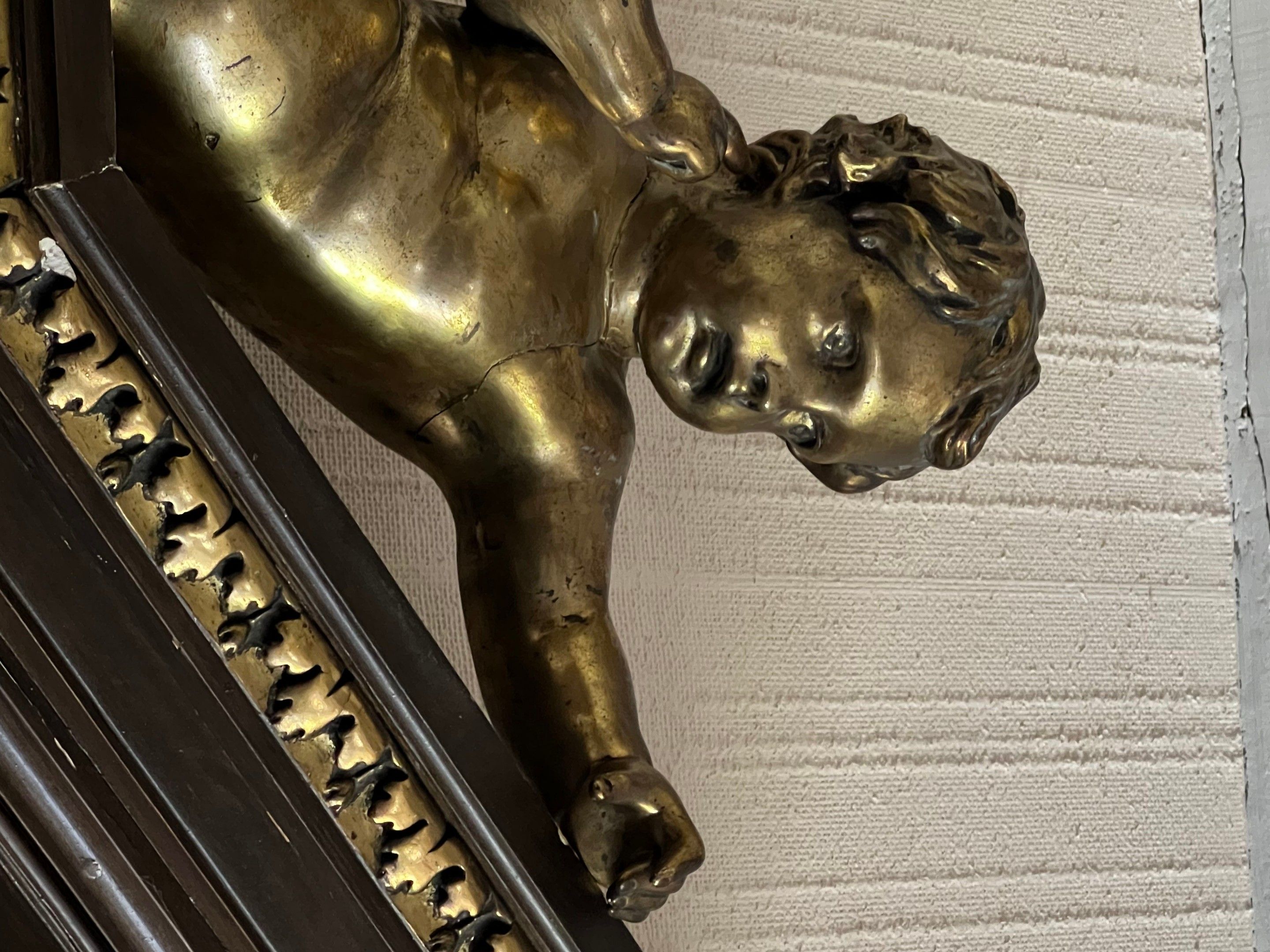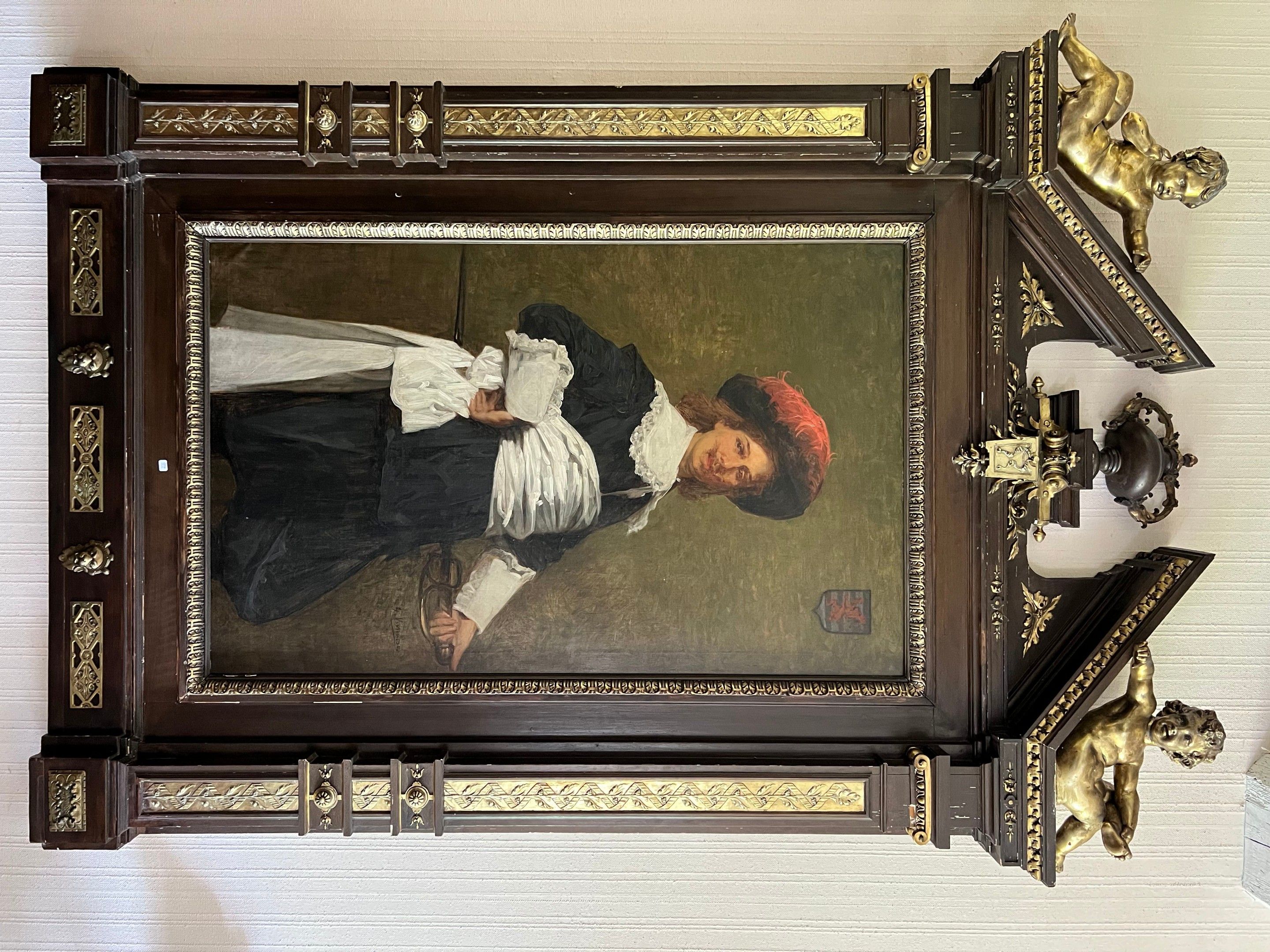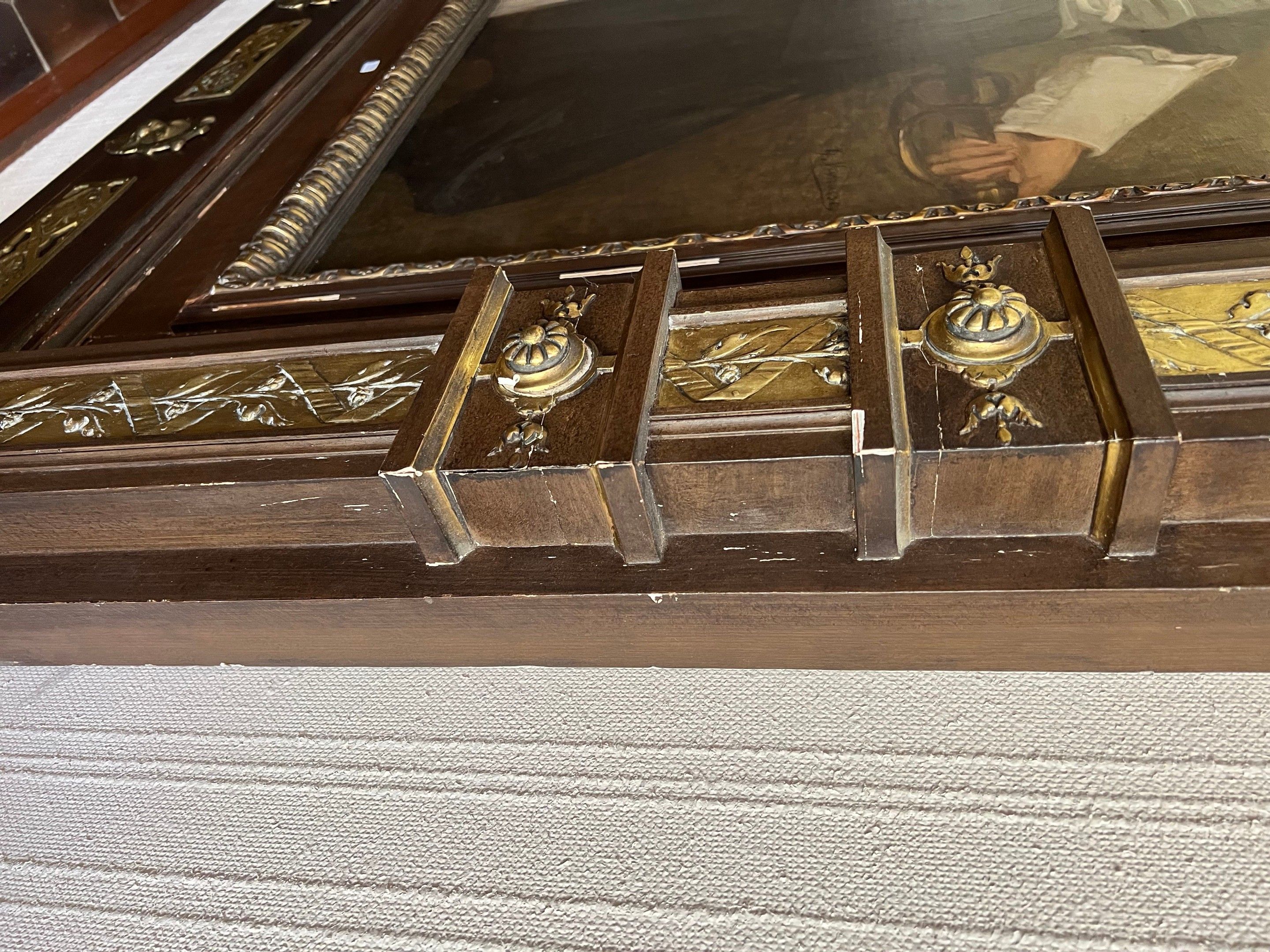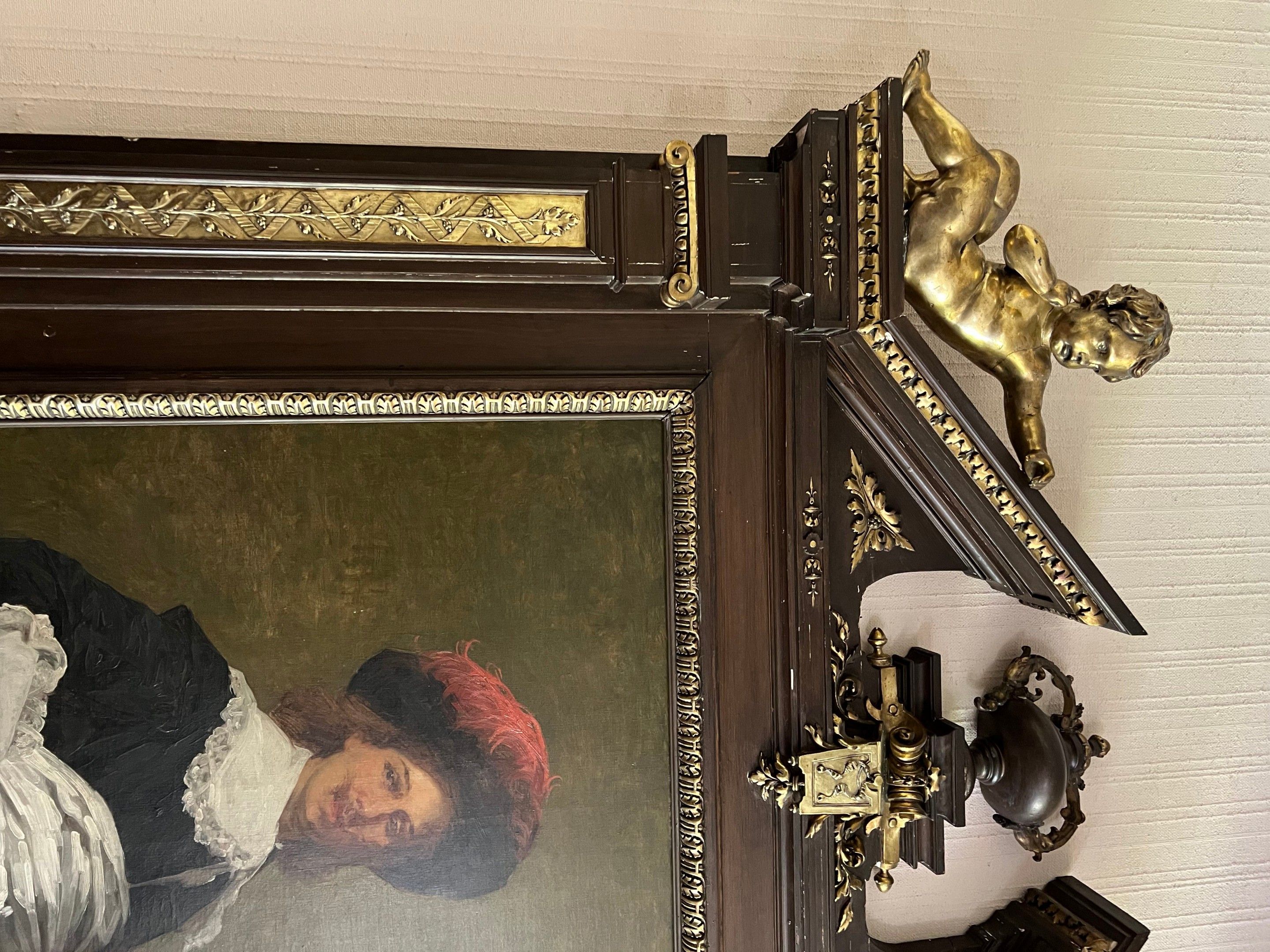 Spectacular neo-classical architectural pediment frame in carved wood and gilded stucco, topped by two putti (restorations to the frame)