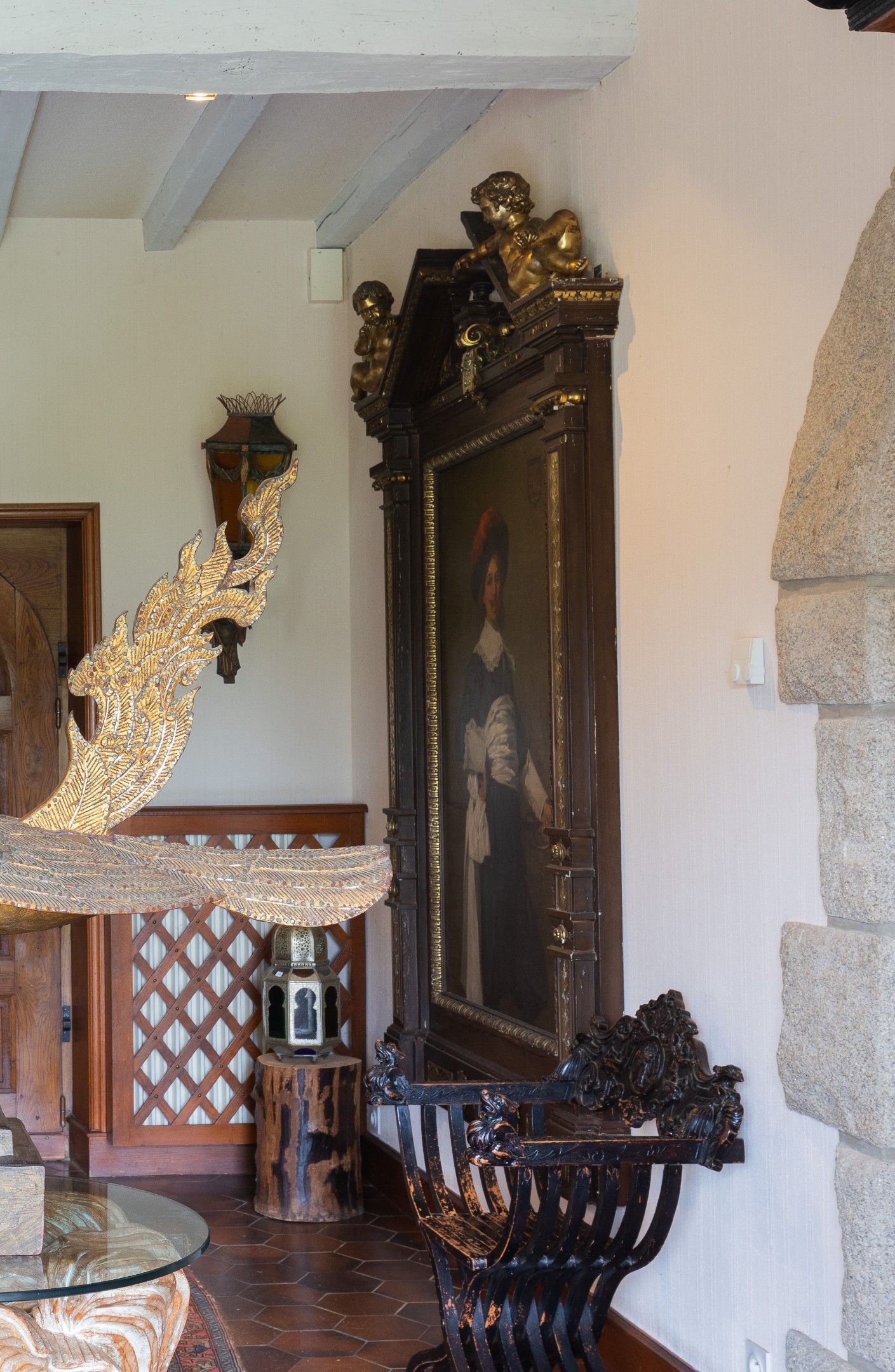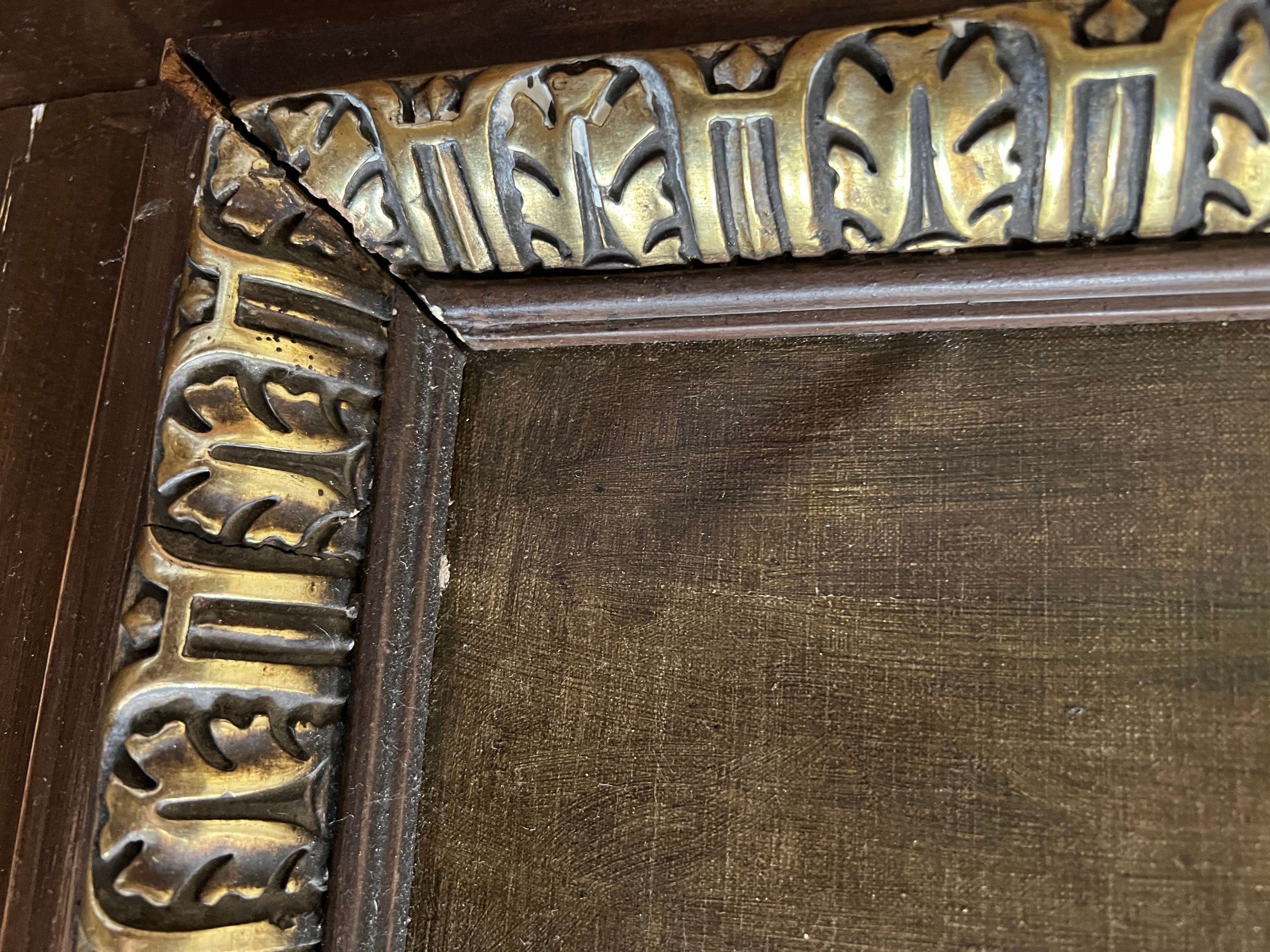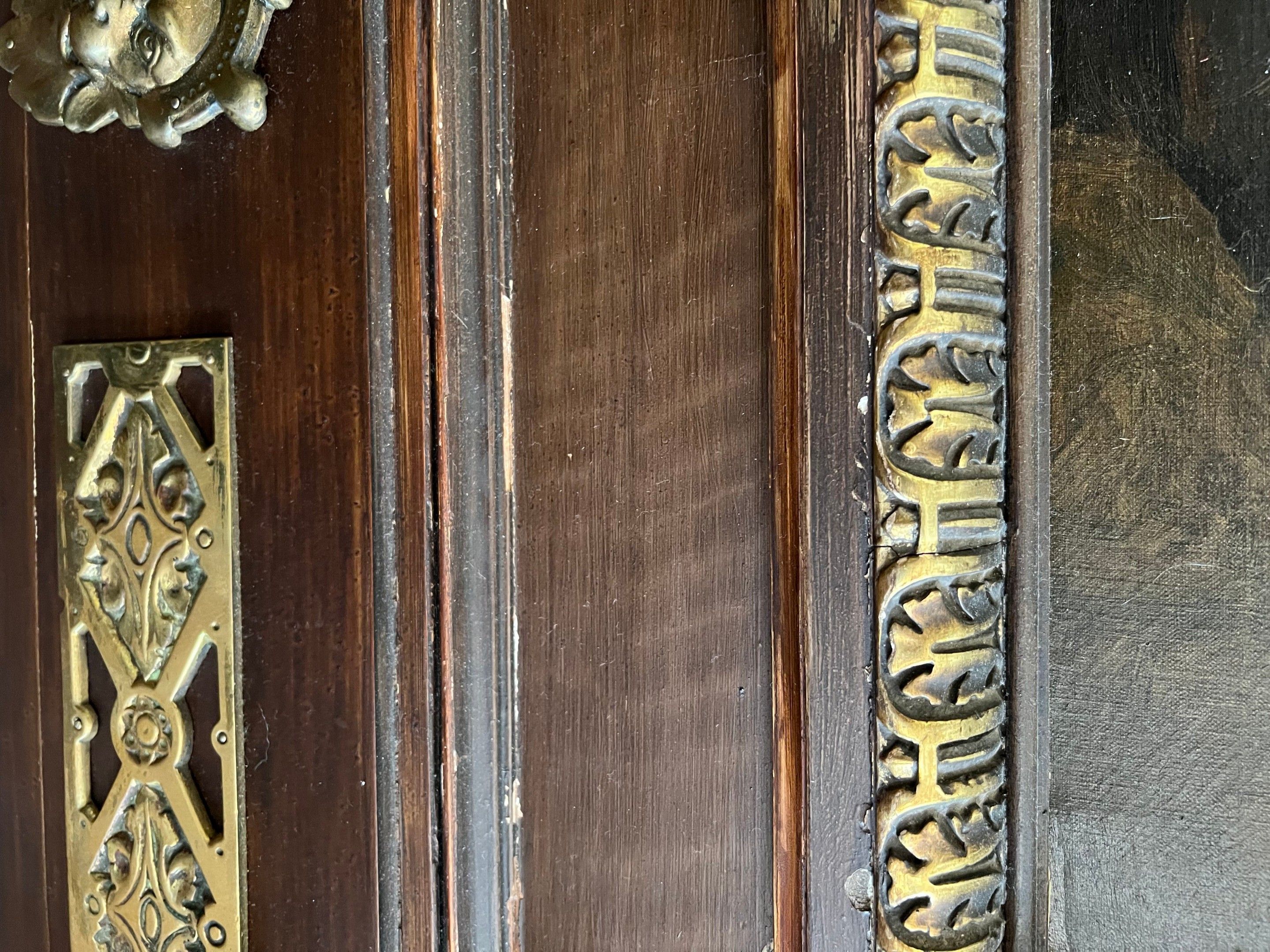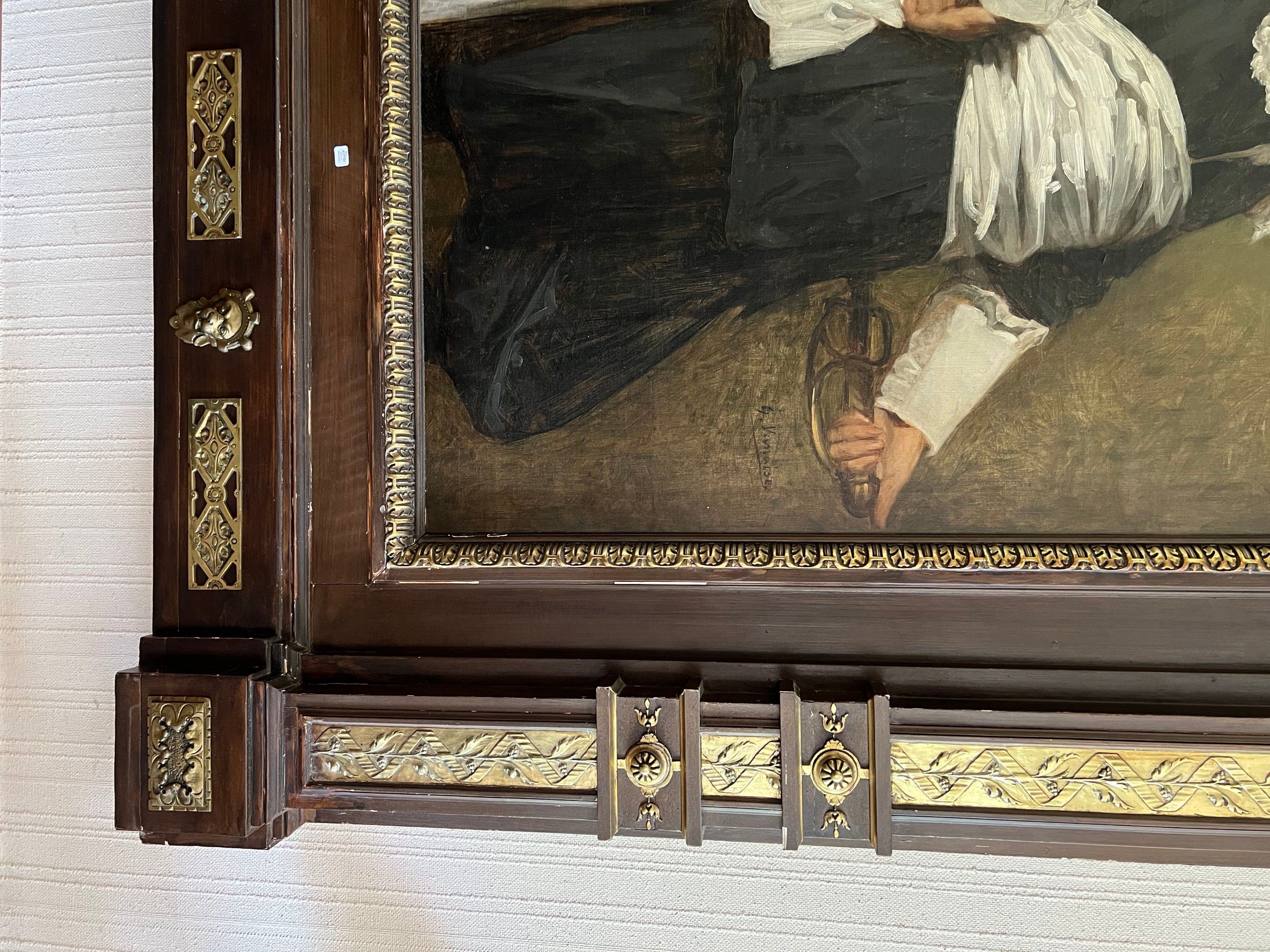Spectacular neo-classical architectural pediment frame in carved wood and gilded stucco, topped by two putti (restorations to the frame)