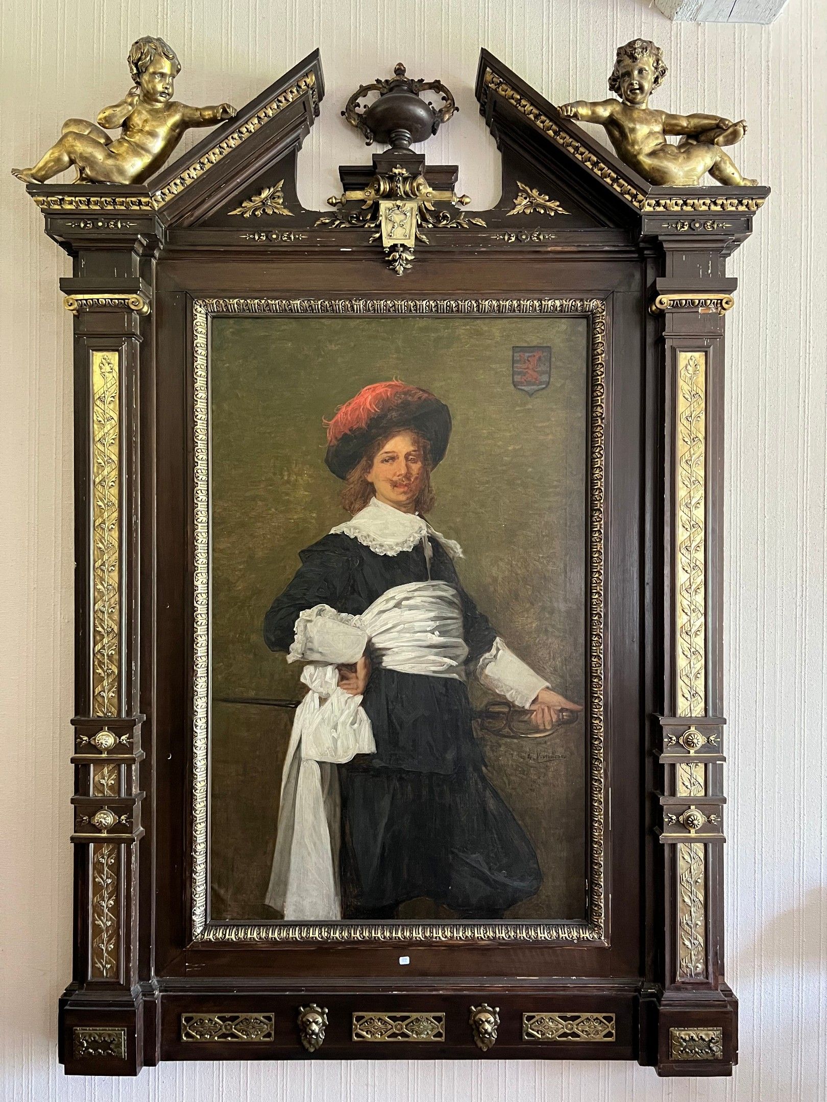 Large oil on canvas (re-set, restorations), signed lower right, coat of arms upper right
