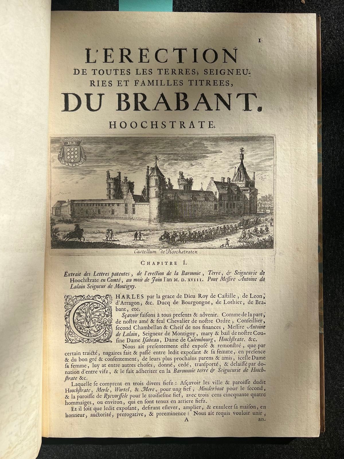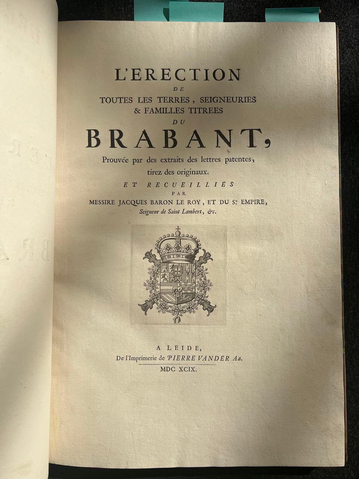 L'érection de toutes les terres, seigneuries & familles titrées du Brabant, prouvée par des extraits de lettres patentes tirez des originaux. Leiden, printed by Pierre Vander Aa, 1699.