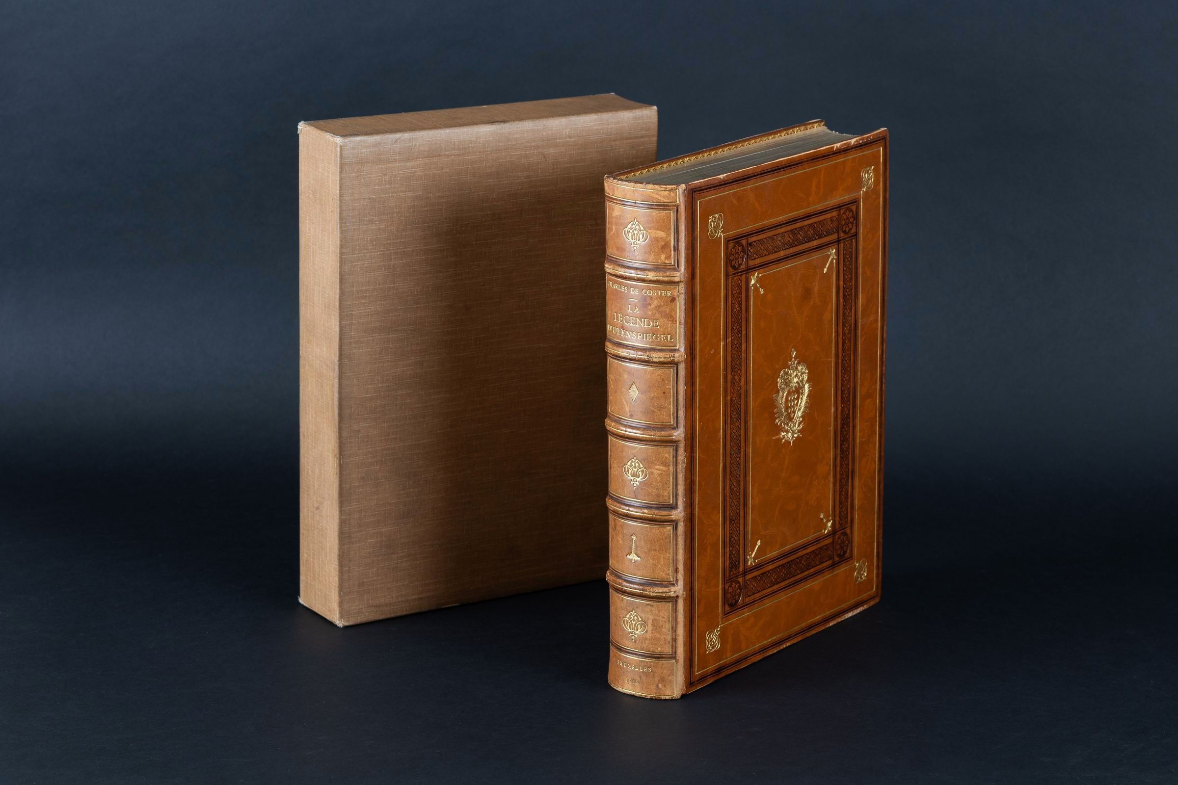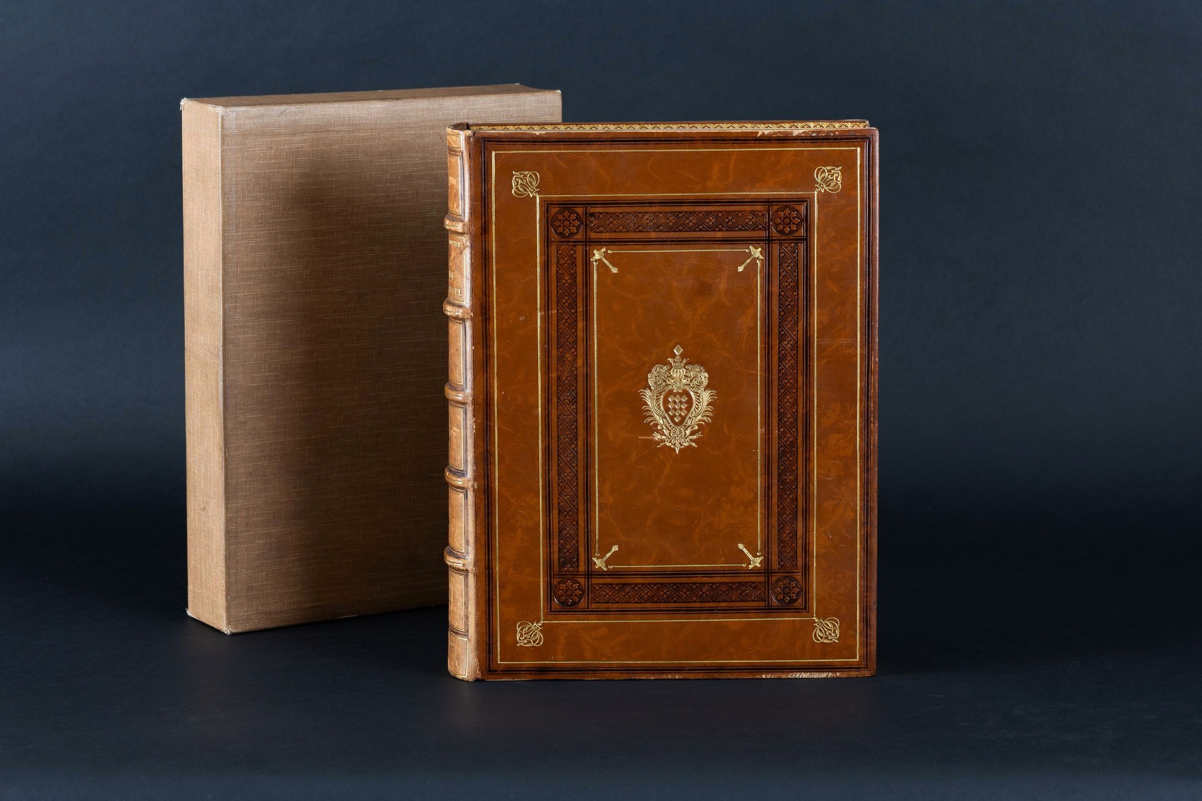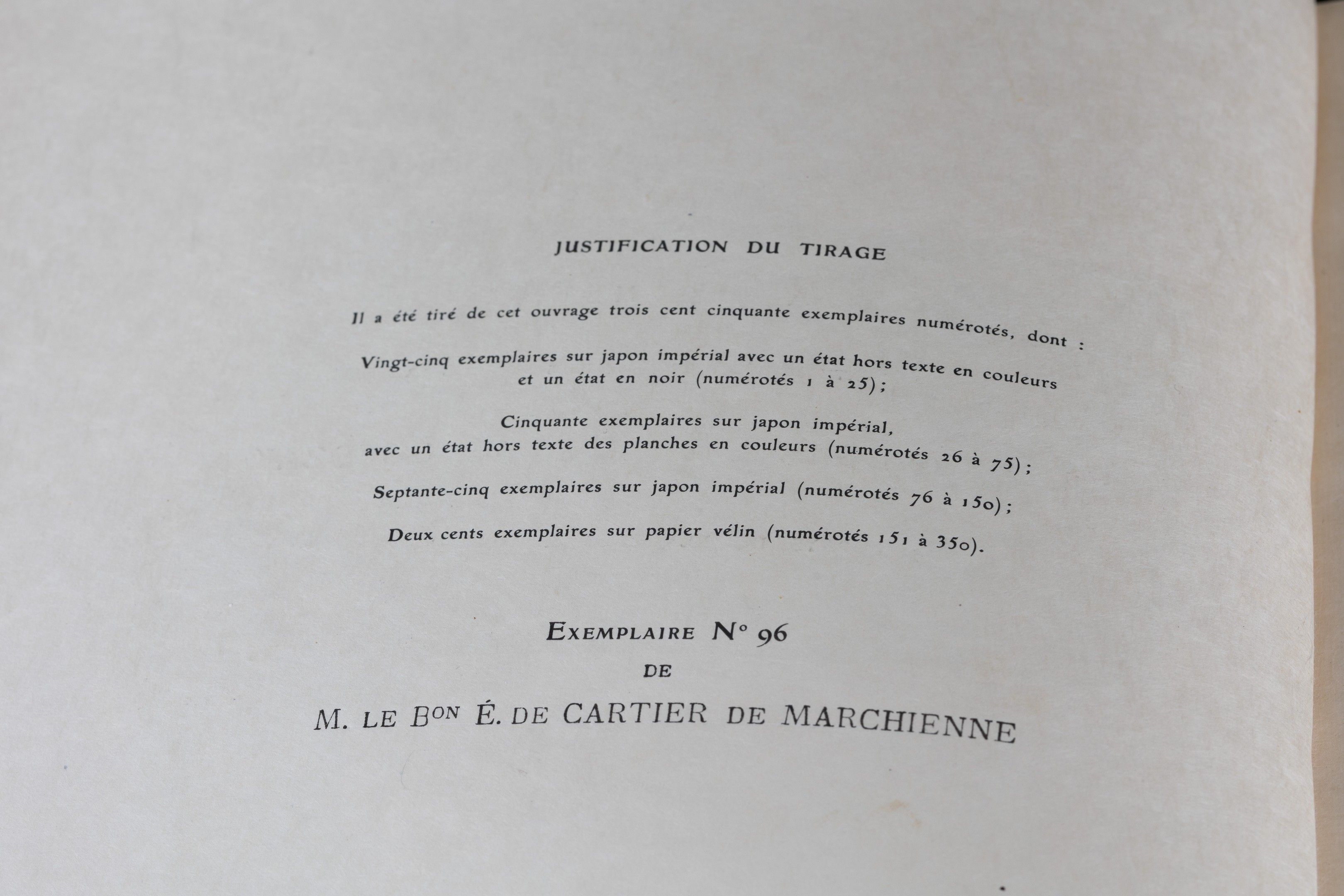 1 large volume in-4 in cloth-covered slipcase, contemporary binding in full brown glazed calf, gilt and cold decoration with Duseuil-style framing, arms in the centre of the boards, ribbed spine with gilt author, title, irons and date, gilt head (binding by Samblant 1914). Some rubbing from use, spine a little soiled. Edition of 350 copies, this one of seventy-five copies on Japon impérial numbered from 76 to 150, bears the number 96. A nominative copy printed especially for Baron Emile de Cartier de Marchienne (1871/1946), a Belgian diplomat and ambassador to London during the Second World War. His coat of arms is gilt on the boards. A very clean copy with no foxing, beautiful colour illustrations by Amédée Lynen.
