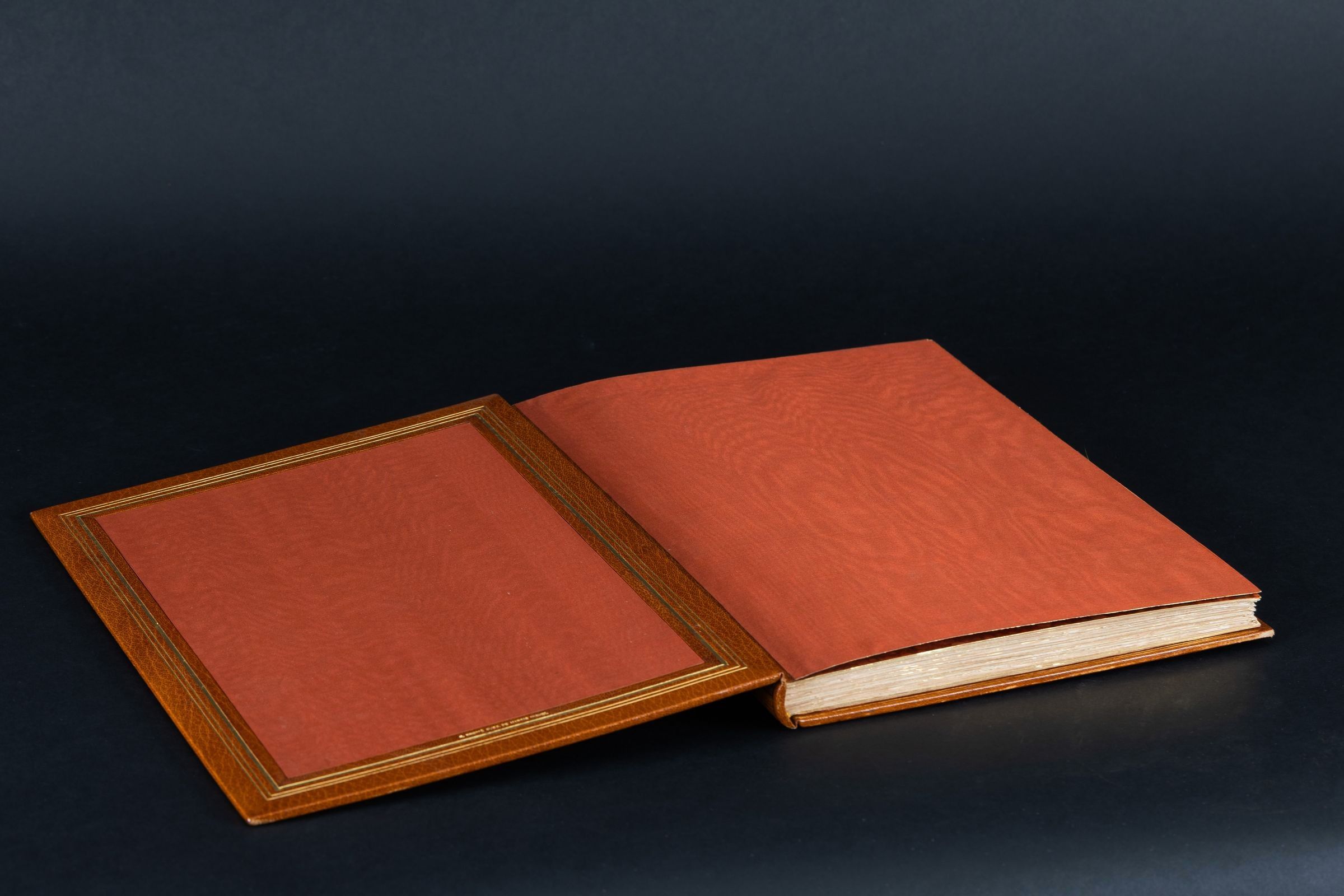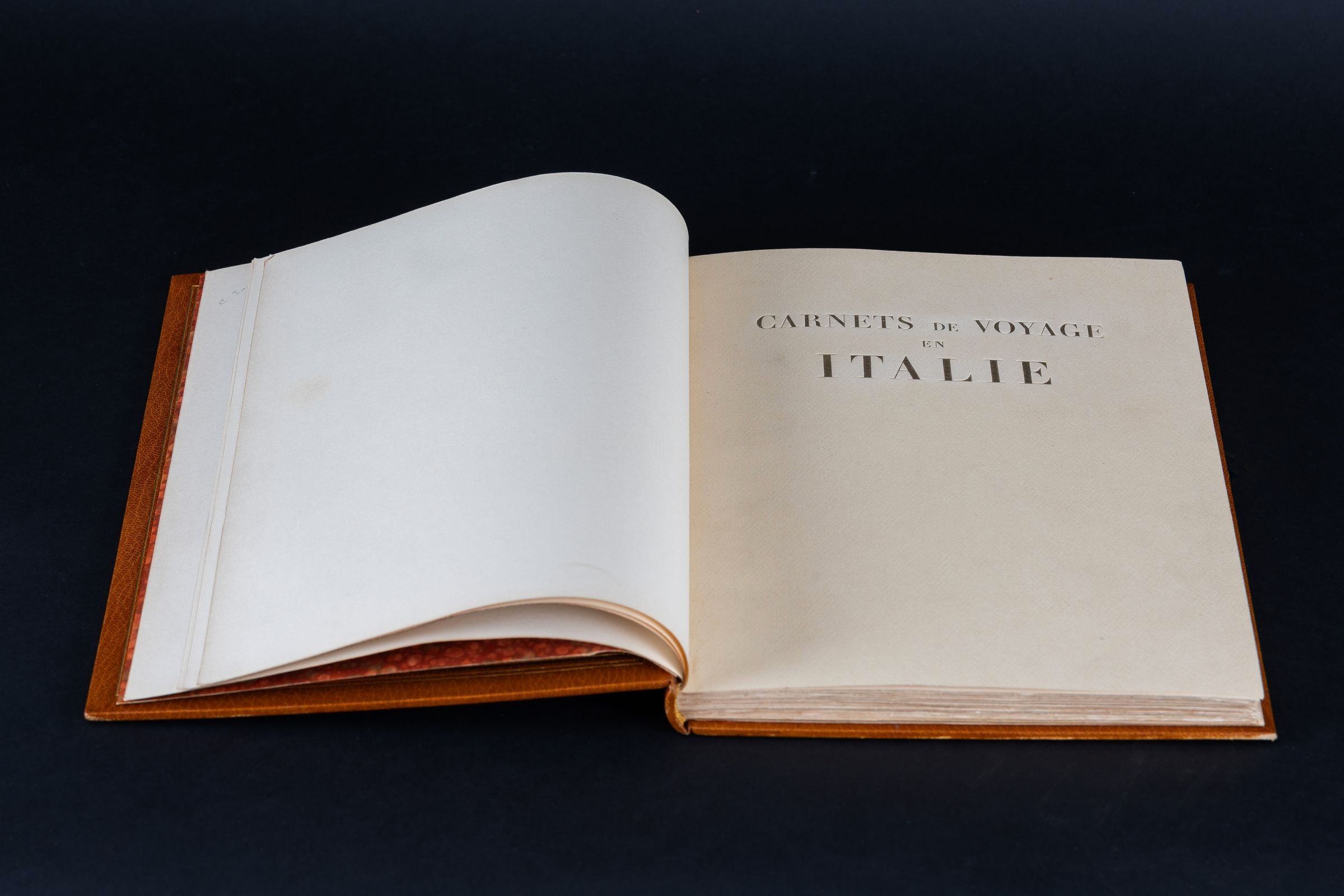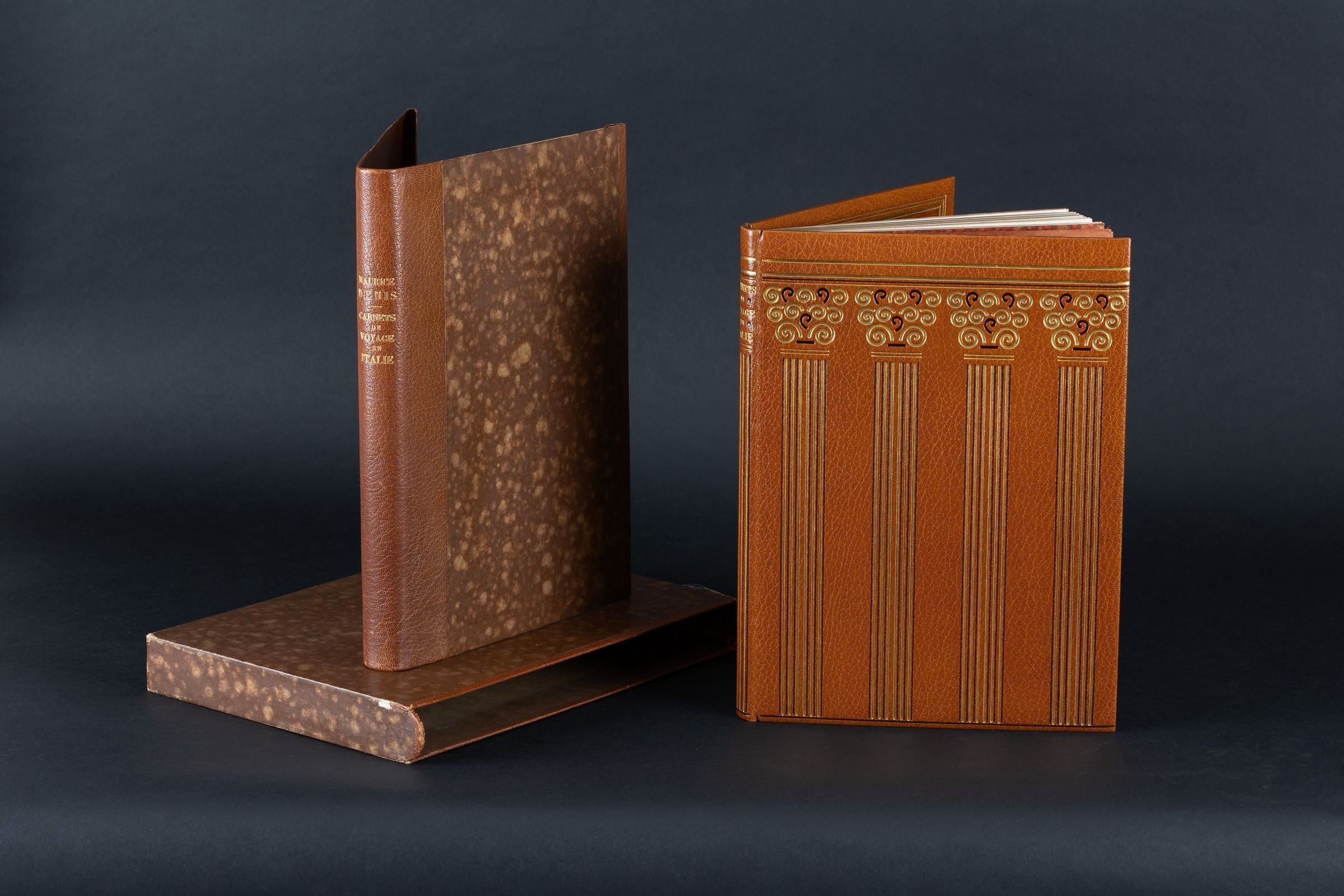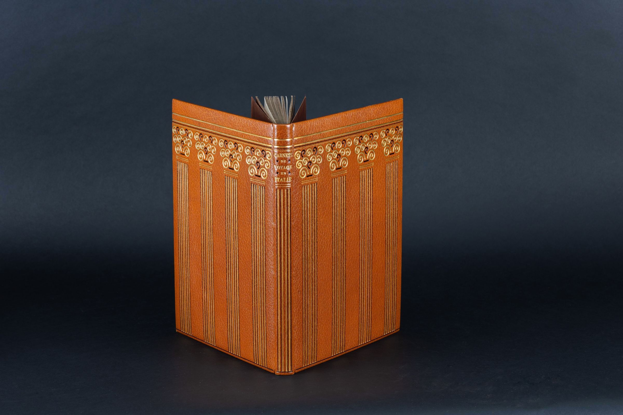 Carnets de voyage en Italie 1921-1922. Paris, Jacques Beltrand, 1925. Large in-4, bound in full morocco with slipcase. Minor restoration to be expected on the slipcase. Superb binding protected by a half chestnut morocco folder with bands, smooth spine with title. Bound in havana morocco decorated on the boards and the spine in continuity with Corinthian style columns made of gilt fillets and cold fillets, moire endpapers and back covers in the same tone as the binding. Bound by Georges Cretté, successor to Marius Michel.