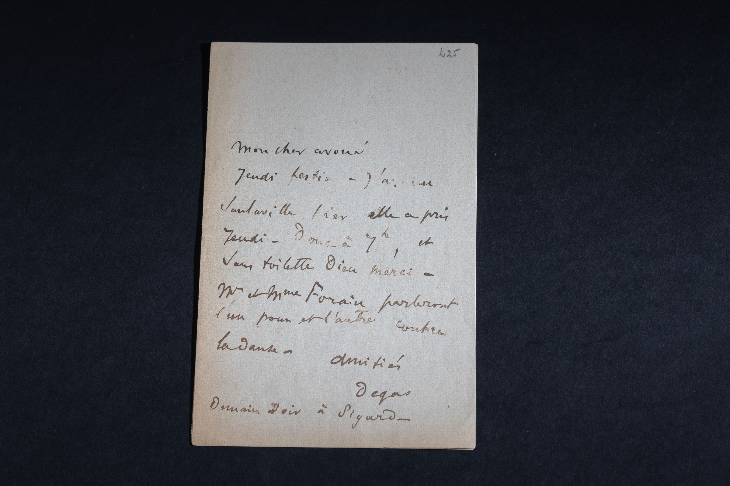 He invites her to a feast, which will take place on Thursday, according to the wishes of the dancer Marie Sanlaville: "So at 7 o'clock, and without toilet thank God. Mr and Mrs Forain will speak one for and the other against dancing. [Tomorrow evening at Sigurd". [Degas was very fond of Ernest Reyer's opera Sigurd].