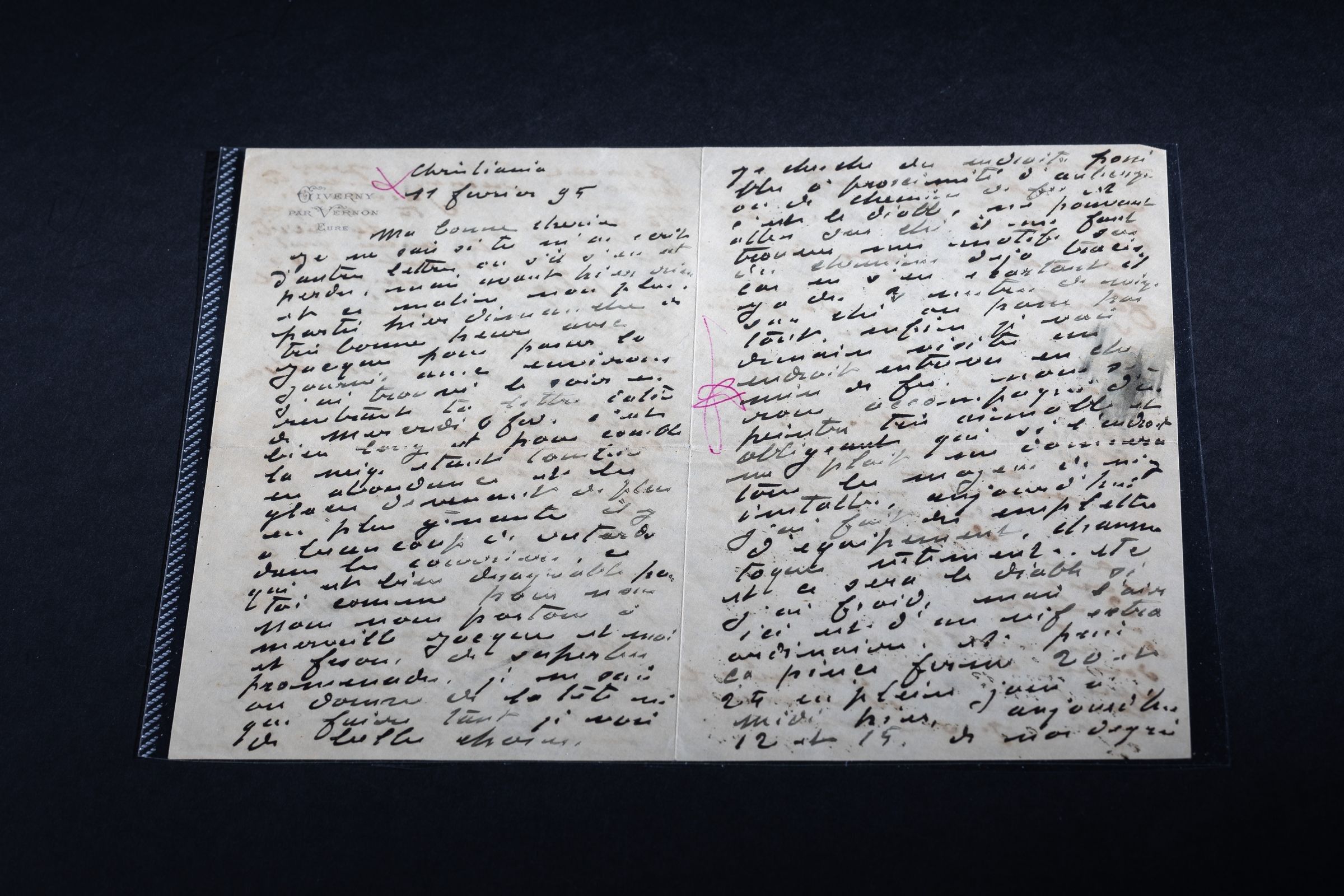 Claude MONET. L.A.S., Christiania 11 February 1895, to HIS WIFE ALICE; 4 pages in-8 on Giverny letterhead (2 red pen marks).