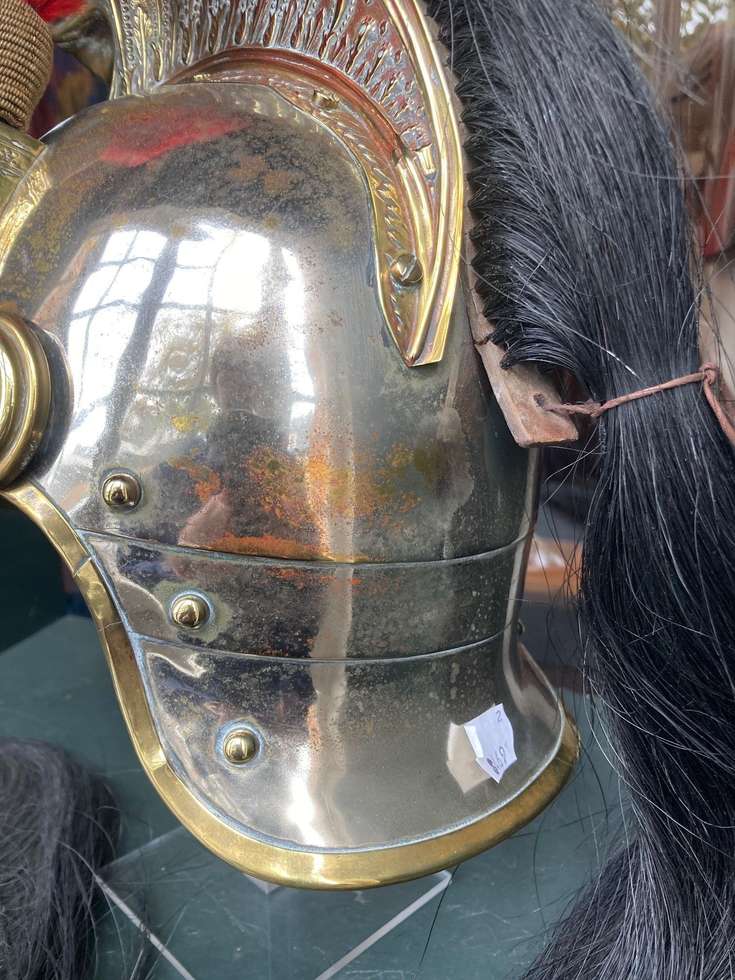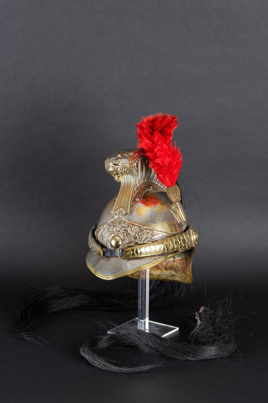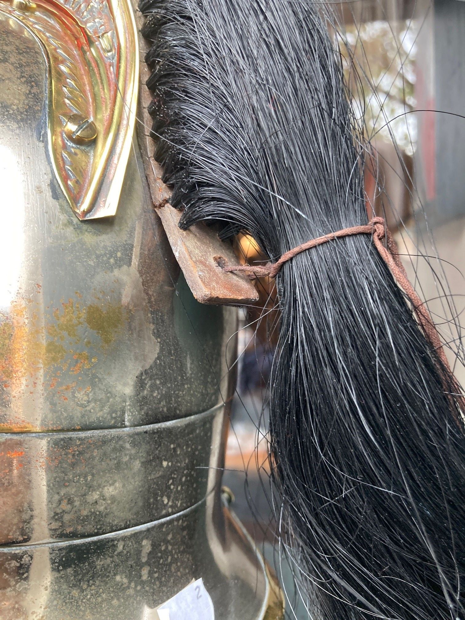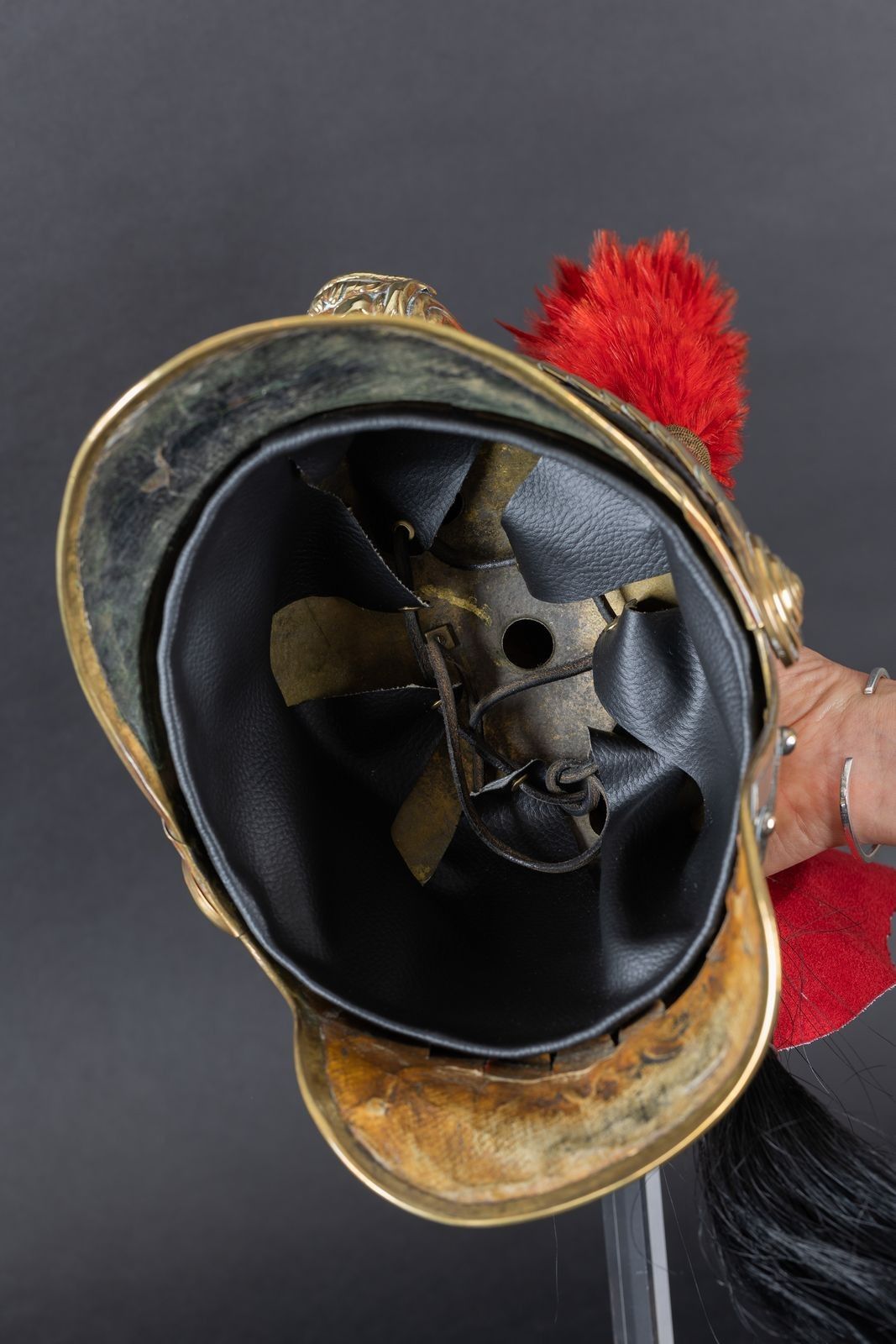 Black horsehair mane. Scarlet plumeet with gold olive. Leather inner cap.