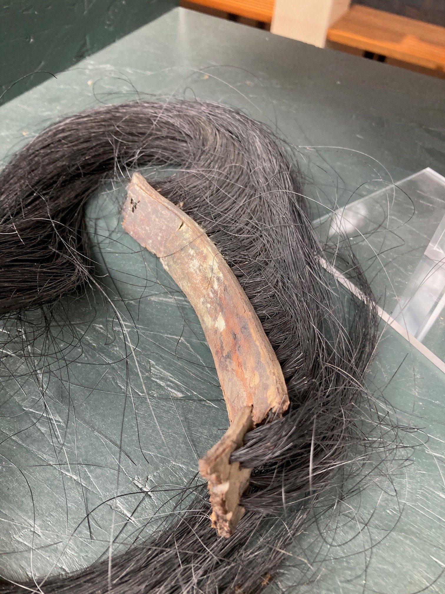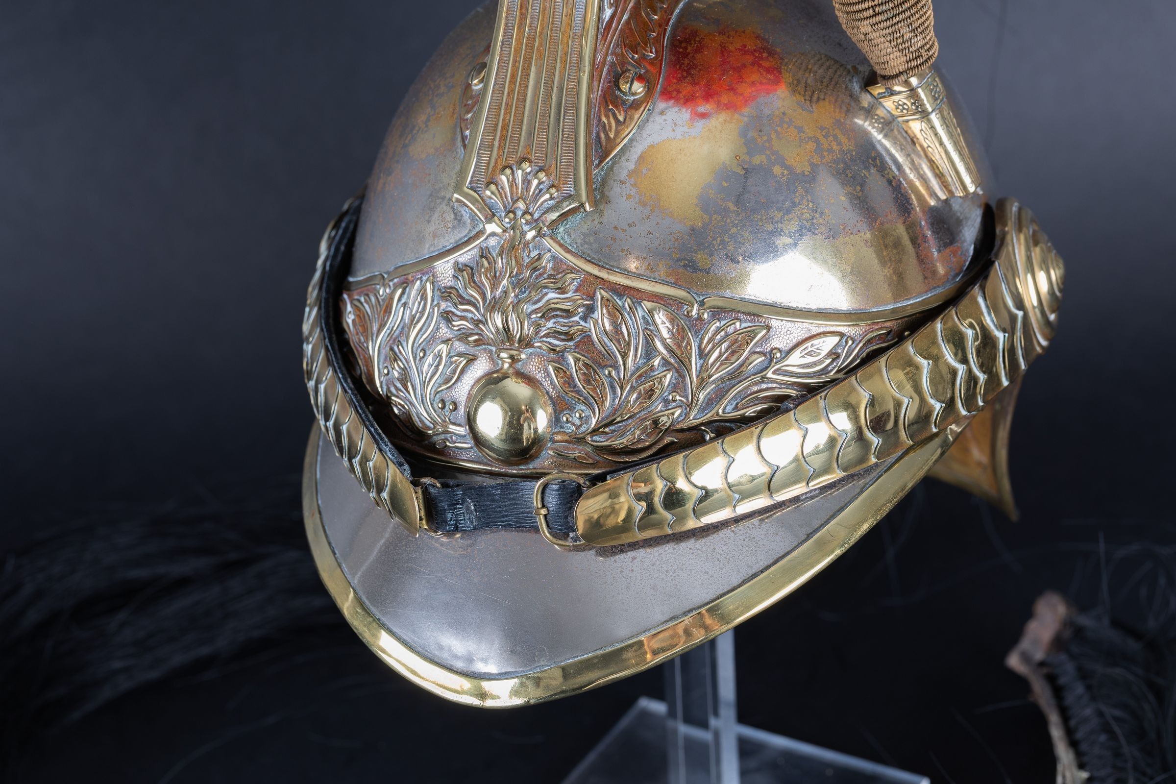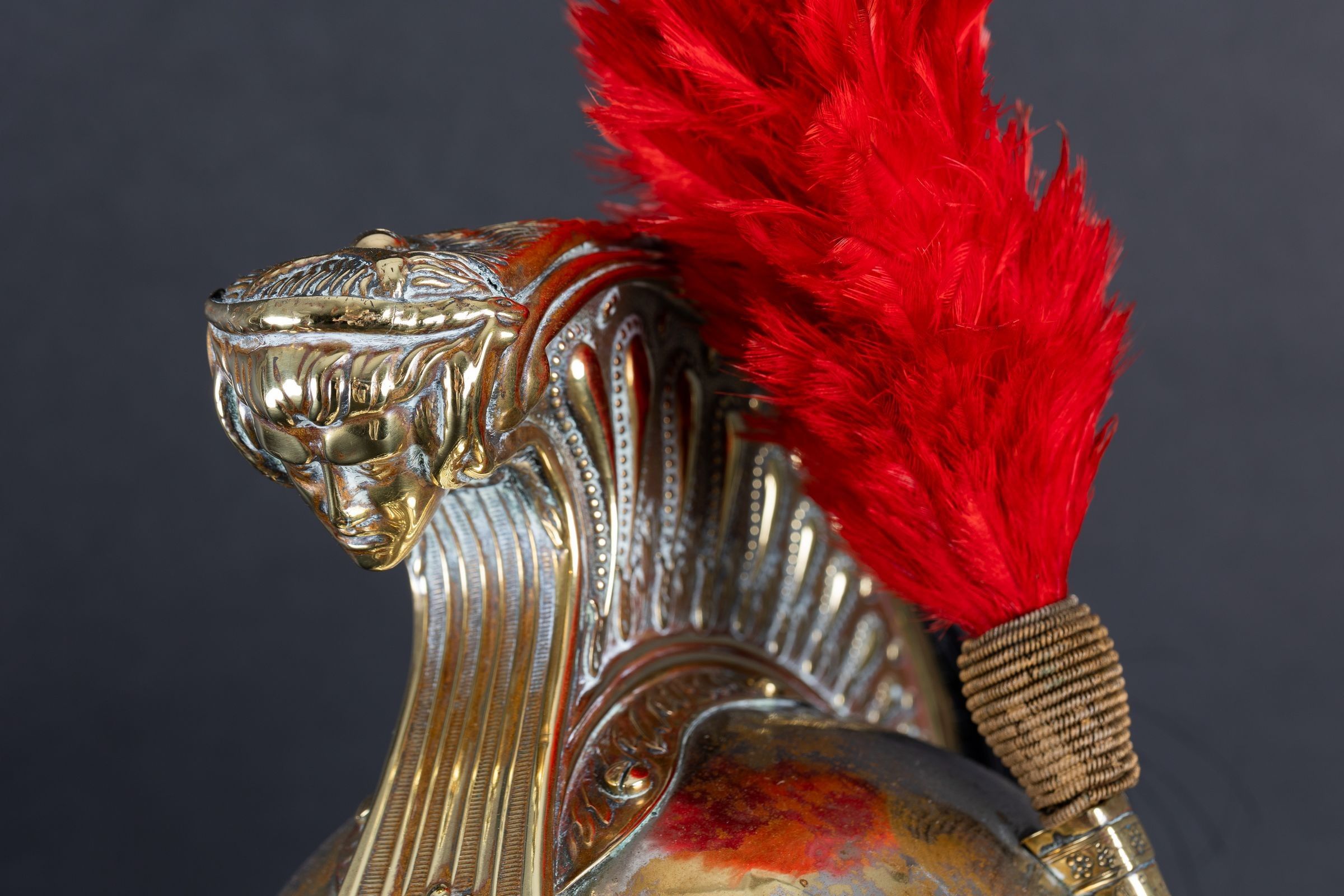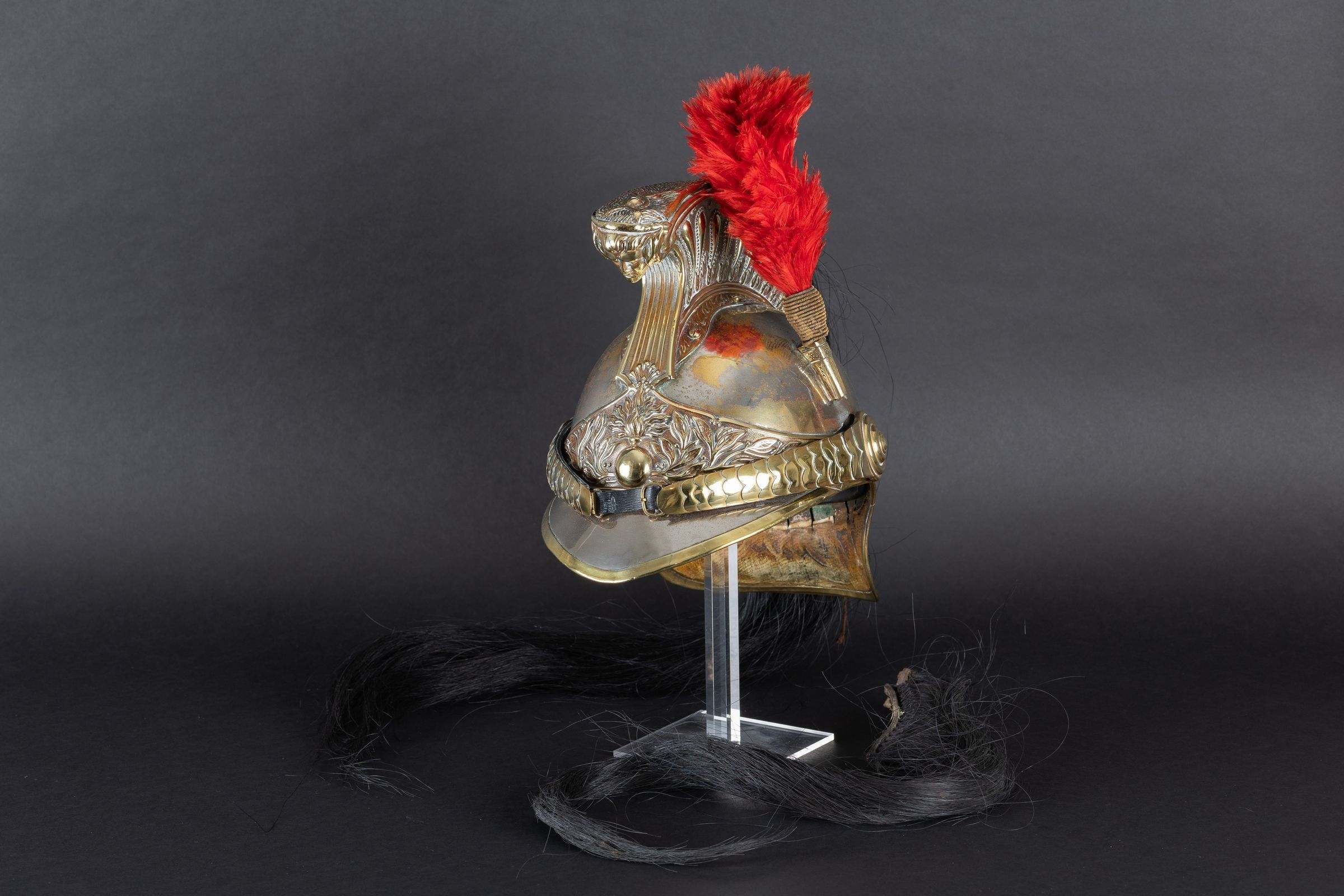 Black horsehair mane. Scarlet plumeet with gold olive. Leather inner cap.