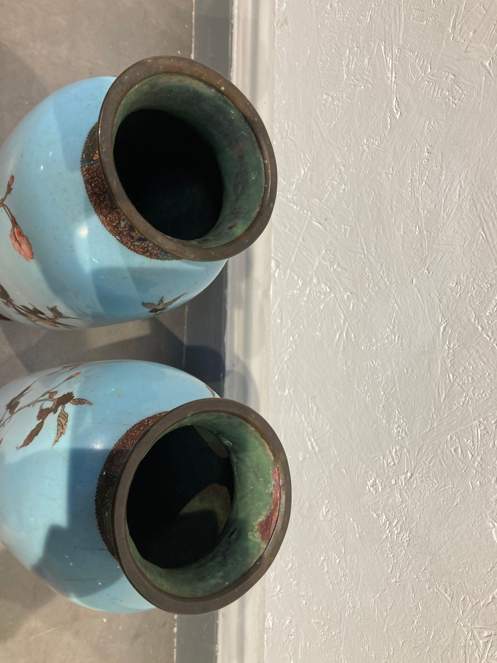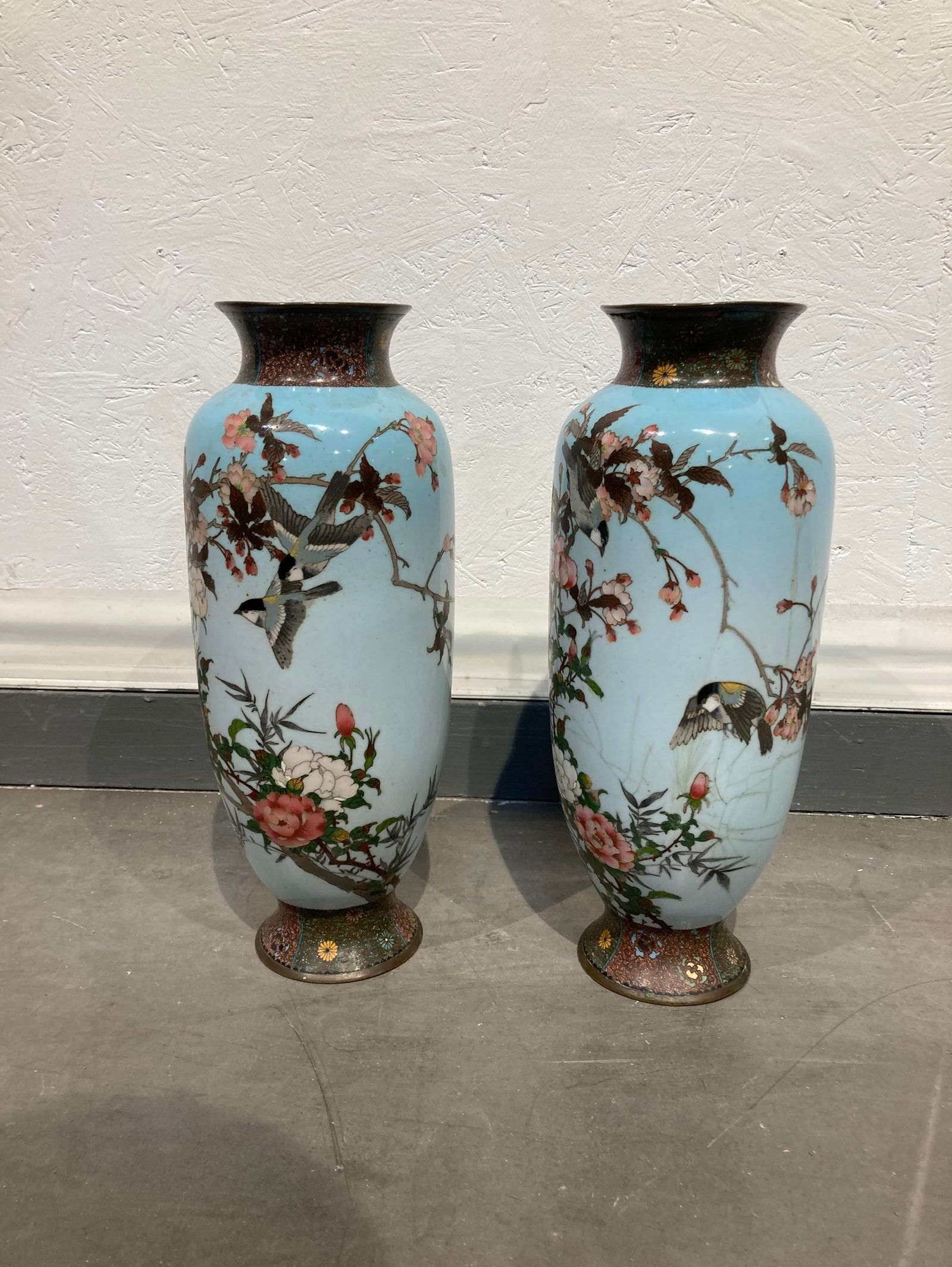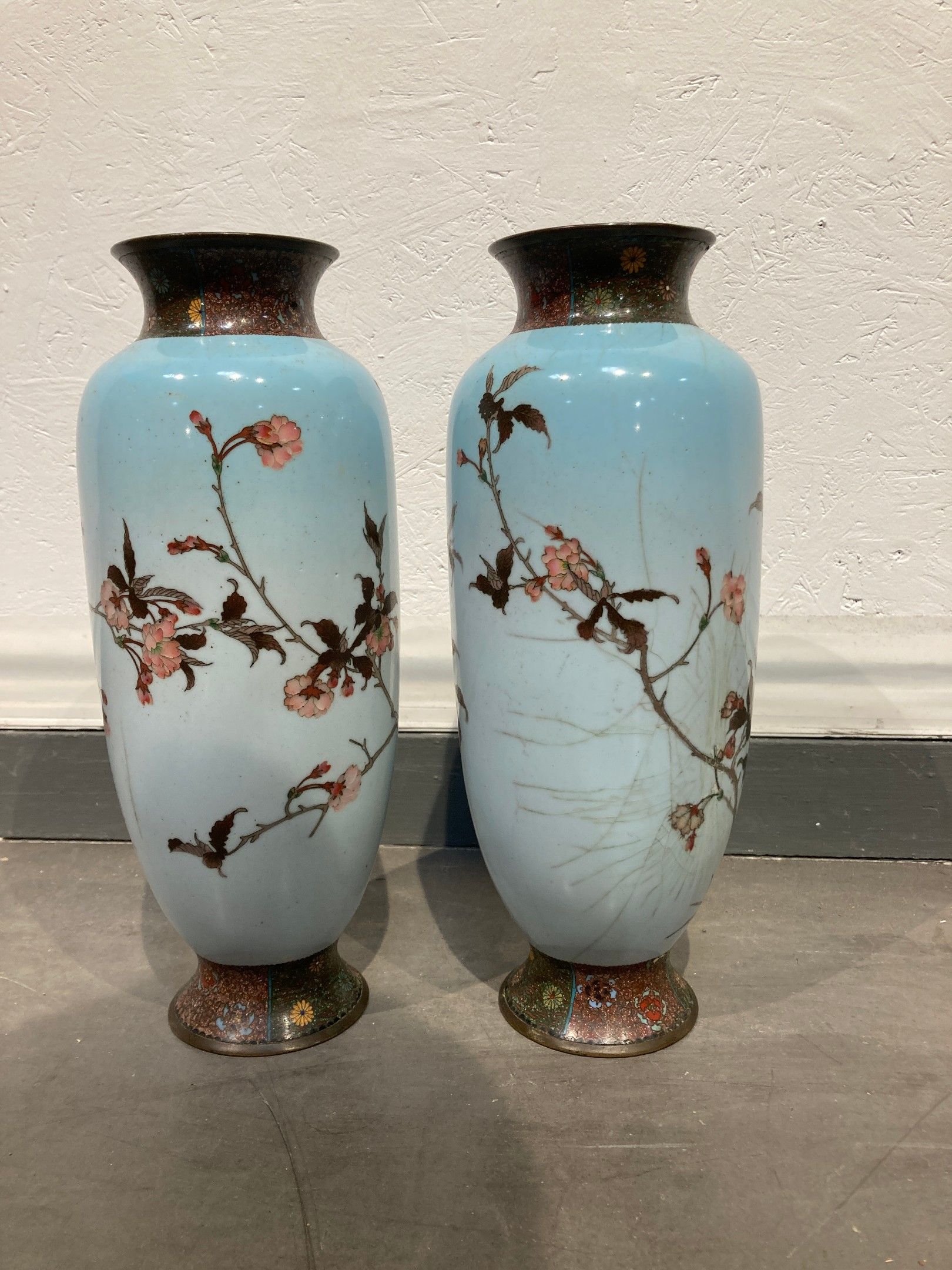 Pair of cloisonné bronze vases decorated with birds and cherry blossom branches (numerous cracks and chips on one, small crack on the other)