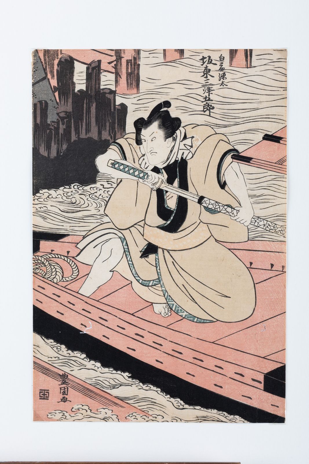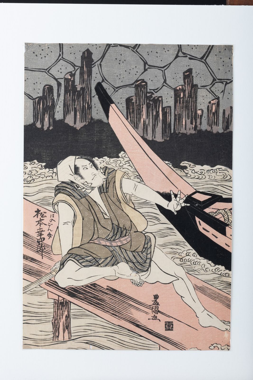 Triptych of prints, oban tate-e, portrait of the actors Matsumoto Koshiro, Bando Mitsugoro and Iwai Hanshiro on boats. Signed Toyokuni ga (Wormholes)