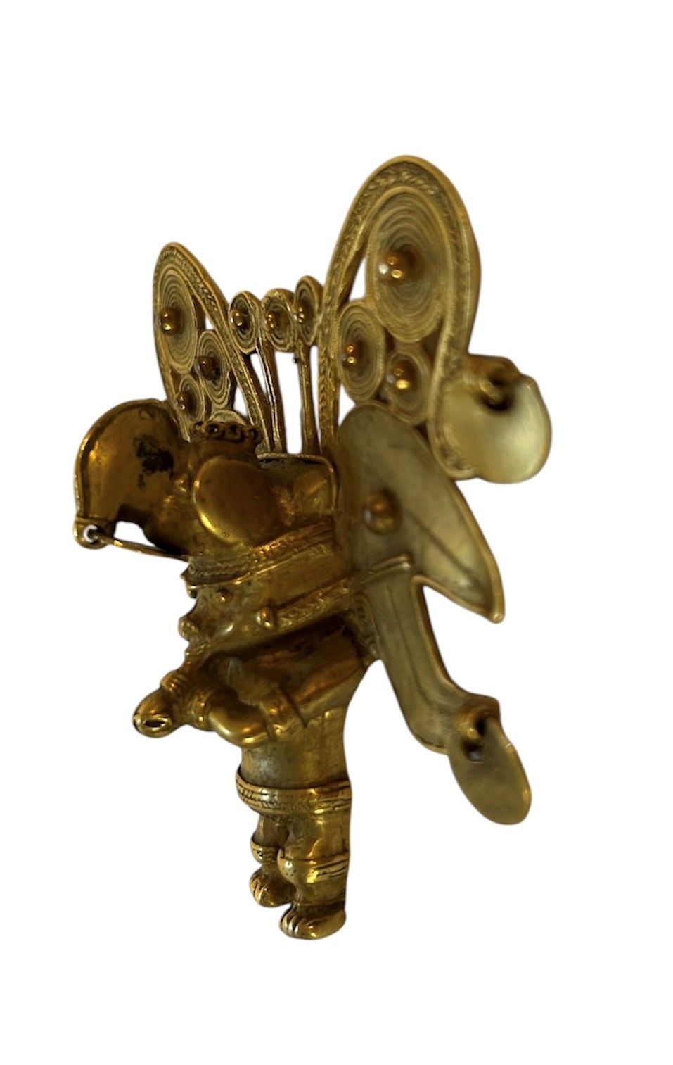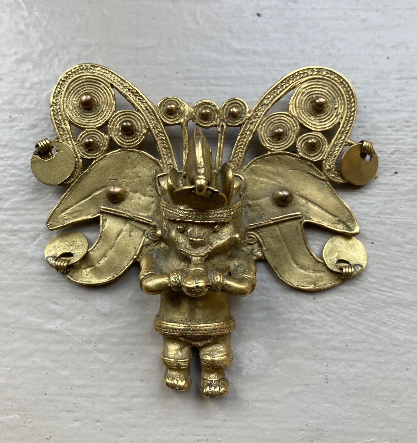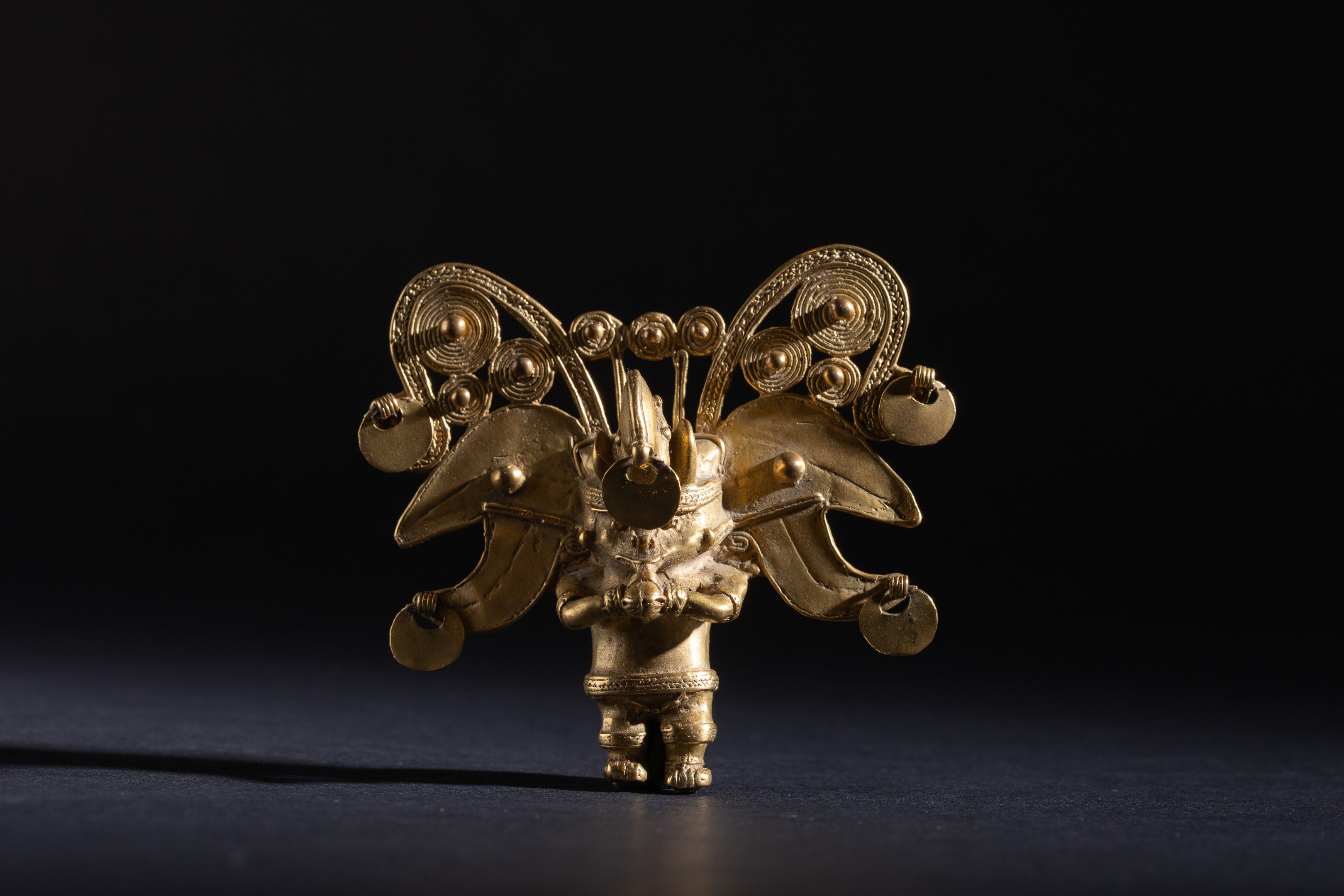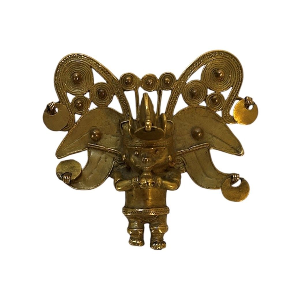Pectoral. The shaman is transformed into a bat-man. His face is transfigured by several attributes: earrings, labret and visor. He wears a large headdress decorated with scrolls and circular discs formed from tight spirals. He blows into a conch shell that he holds with both hands. Tumbaga (copper and gold alloy).