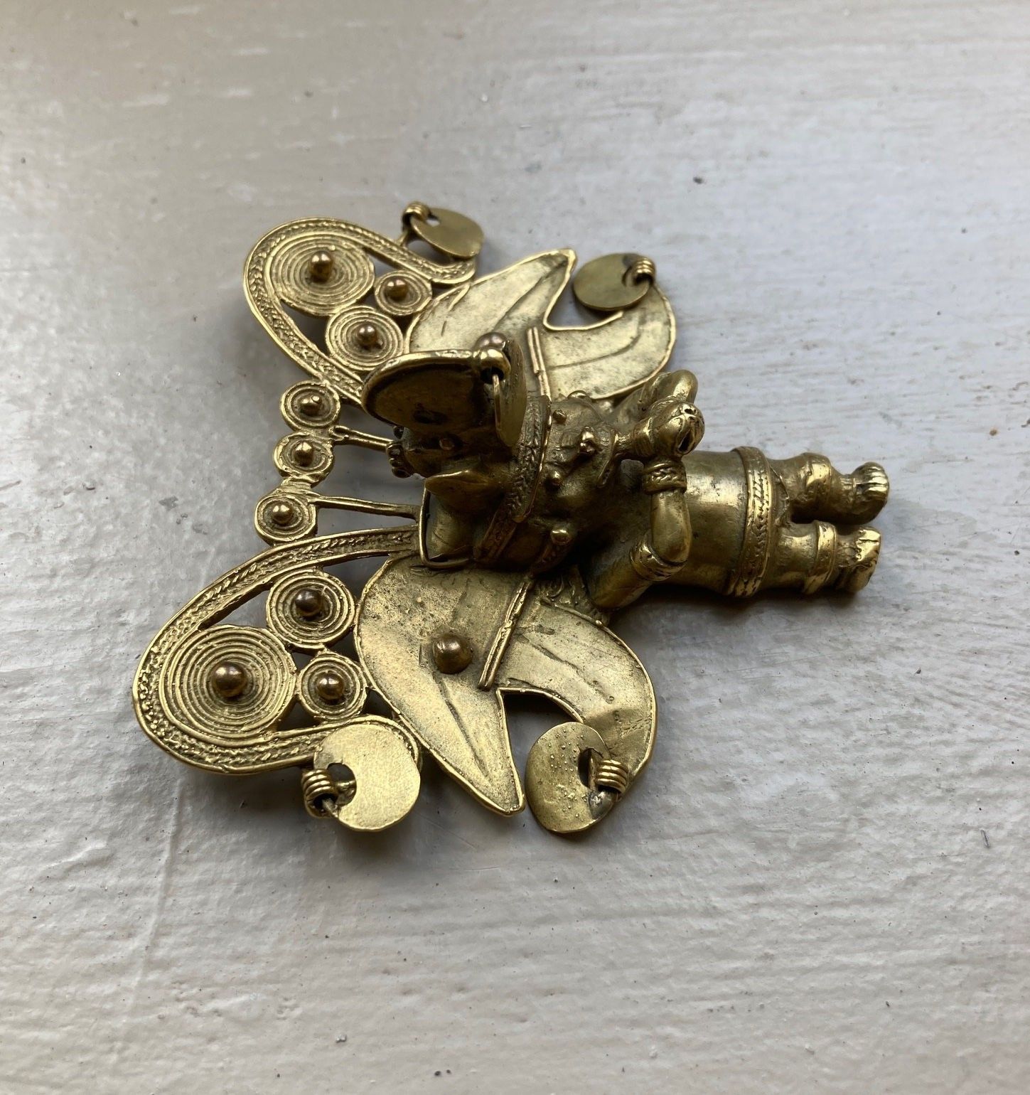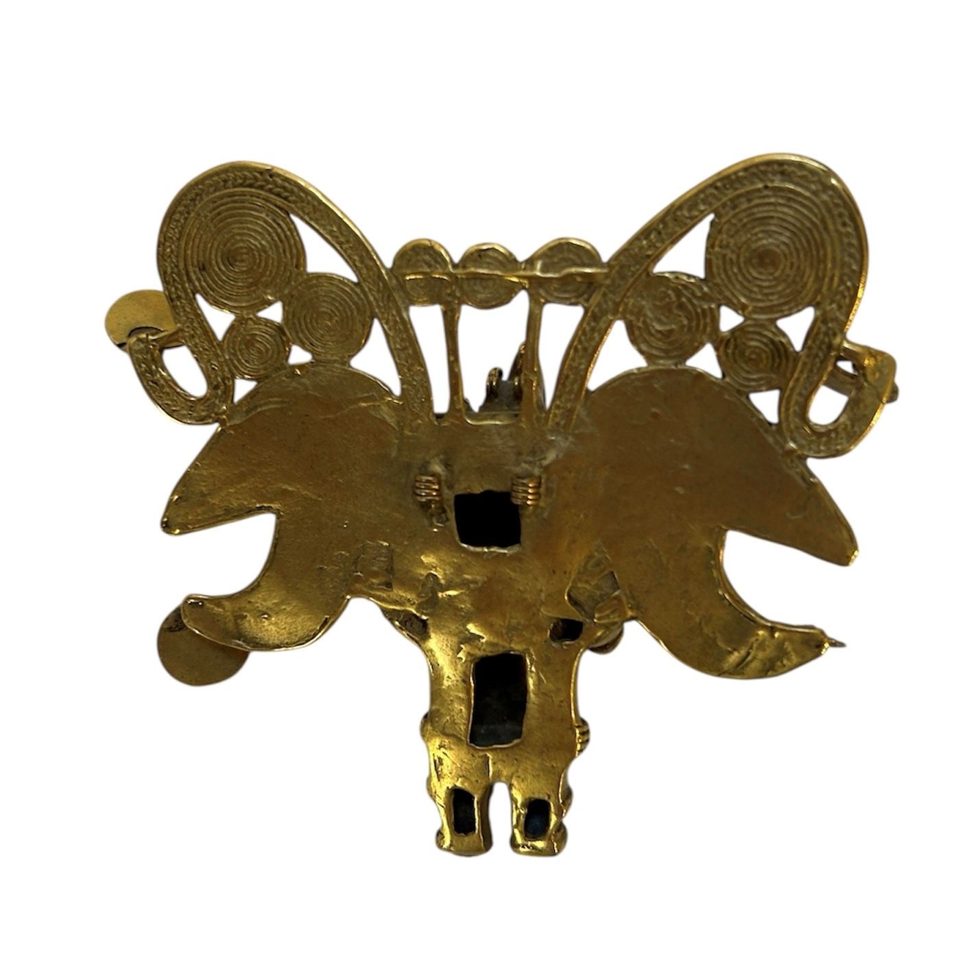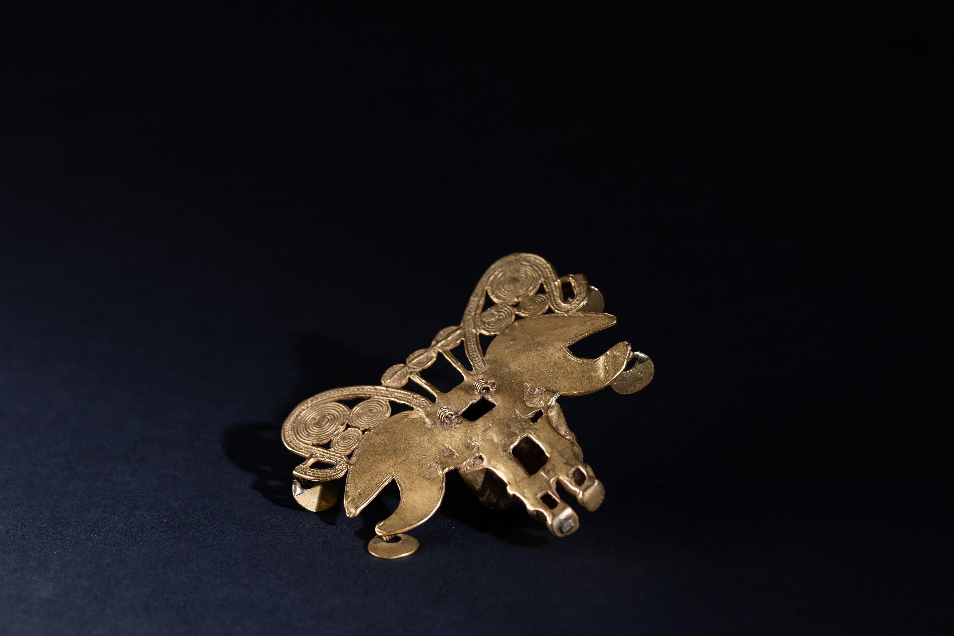 Pectoral. The shaman is transformed into a bat-man. His face is transfigured by several attributes: earrings, labret and visor. He wears a large headdress decorated with scrolls and circular discs formed from tight spirals. He blows into a conch shell that he holds with both hands. Tumbaga (copper and gold alloy).
