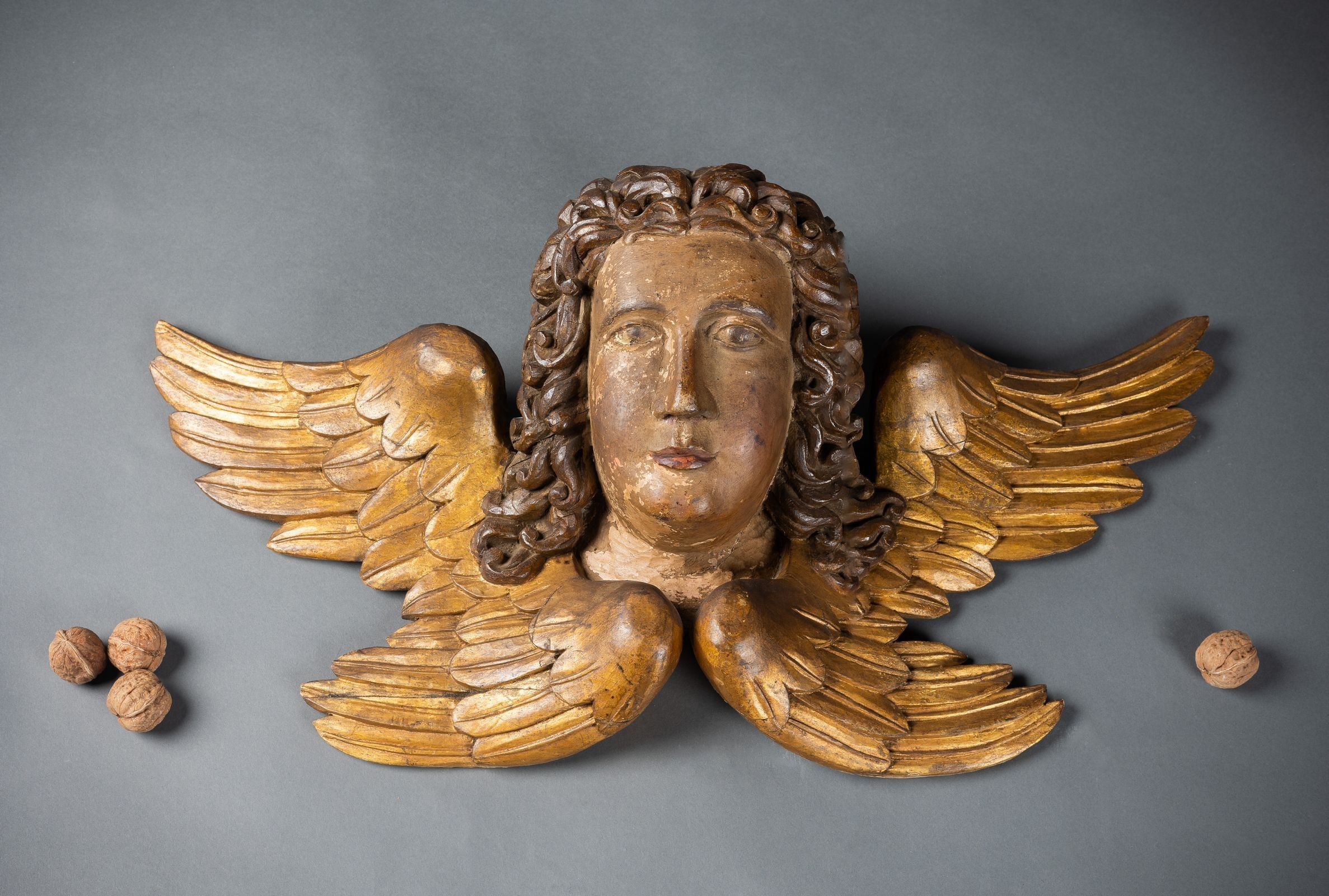 Head of an angel framed by wings in carved polychrome and gilded oak (wear, small cracks and restorations)