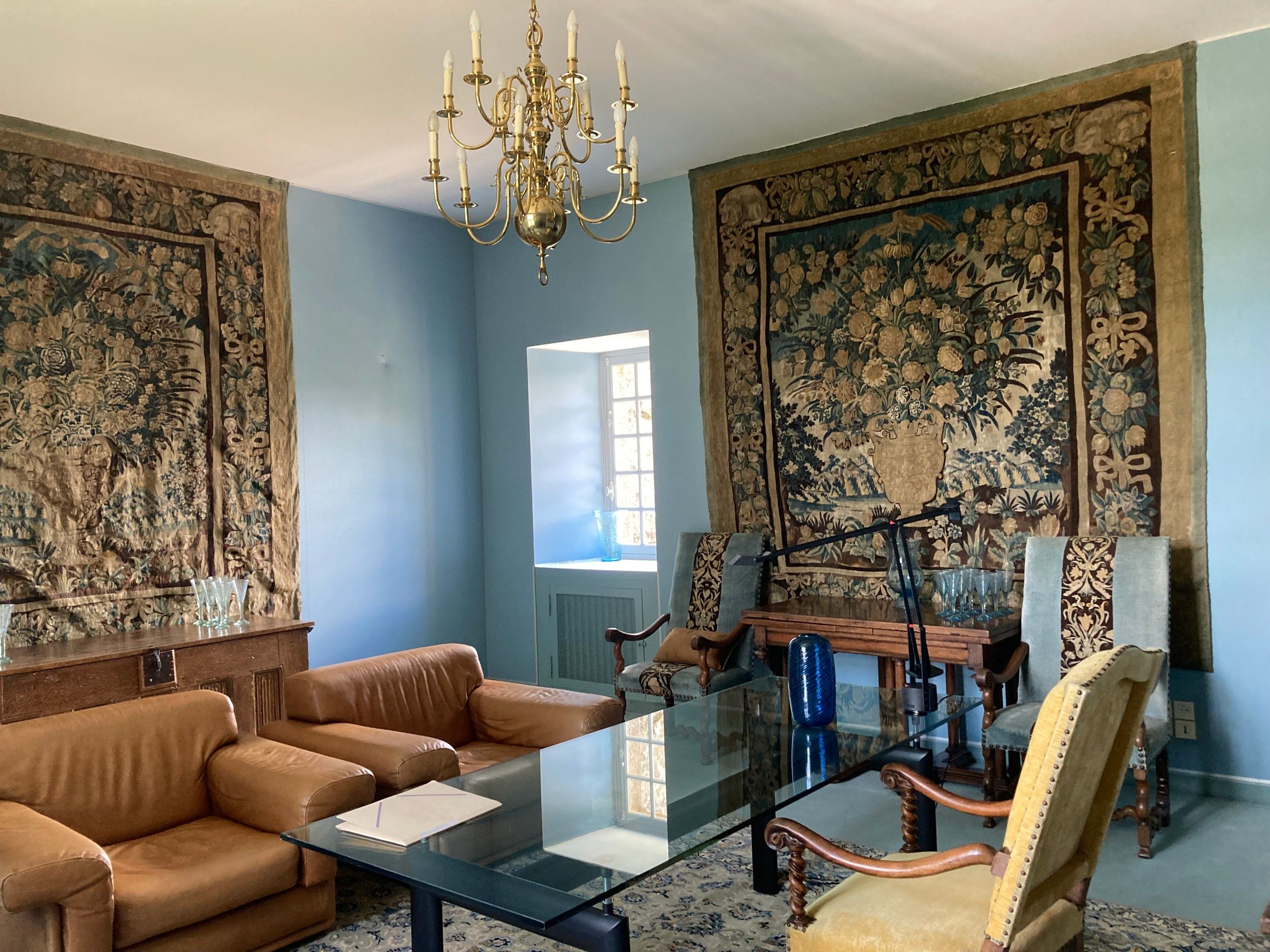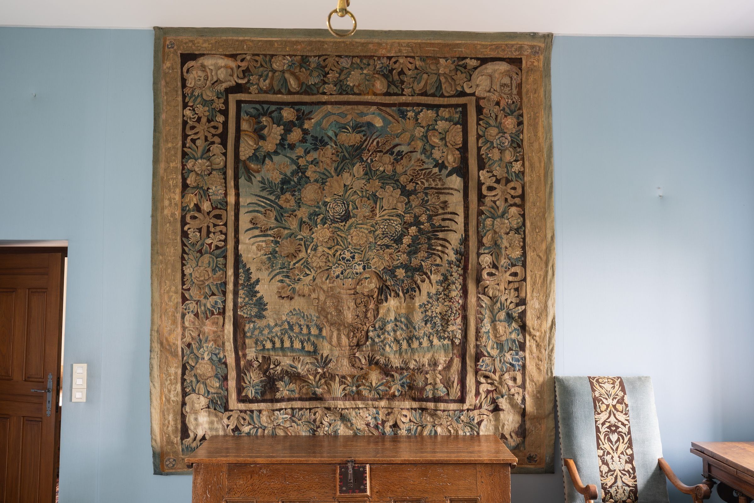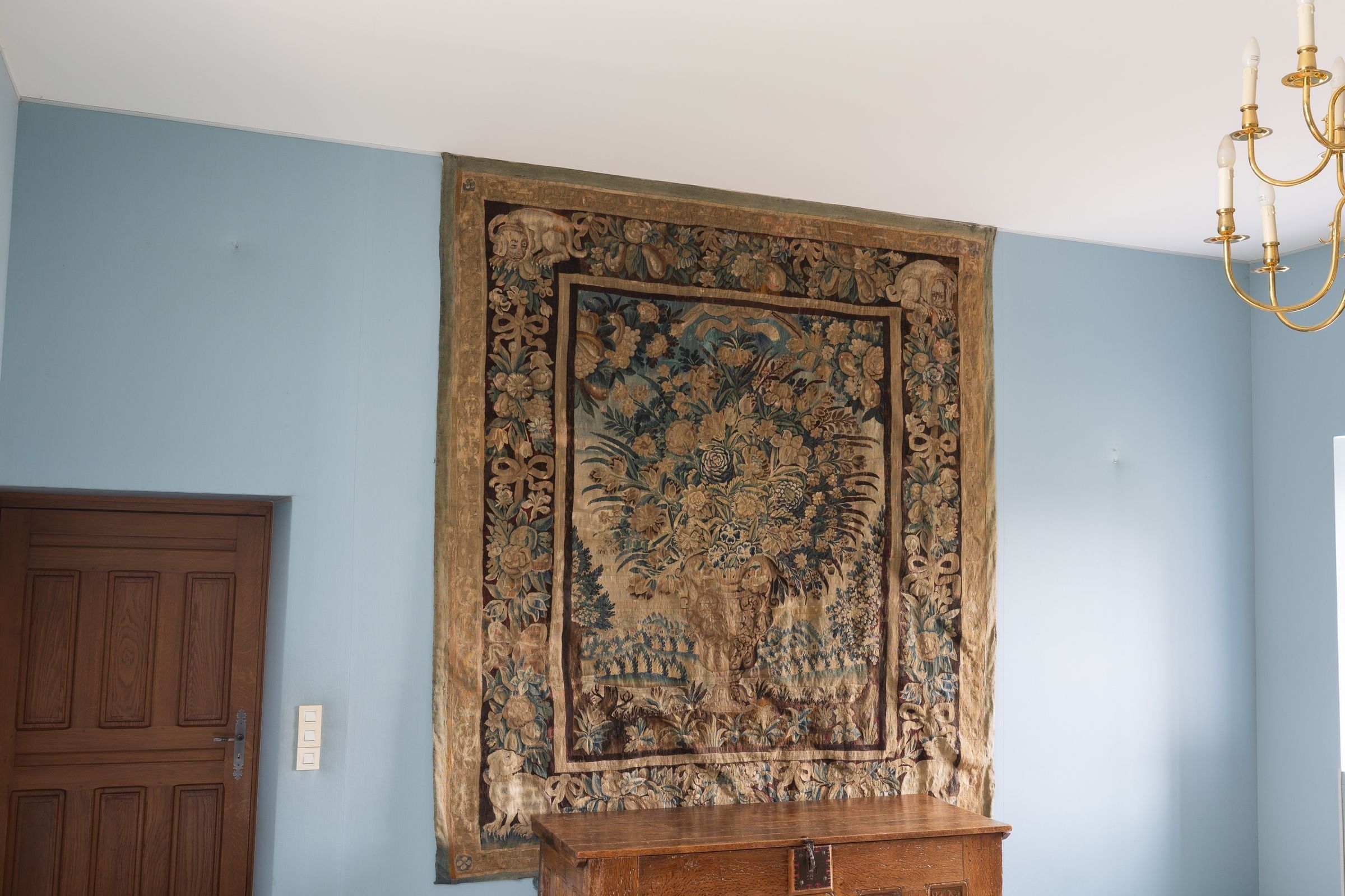 Materials and condition: Woven in wool and silk (warp in wool, weft in wool and silk), the tapestries appear to be in fairly good condition (cleaning would probably be necessary); some old restorations and repainting.