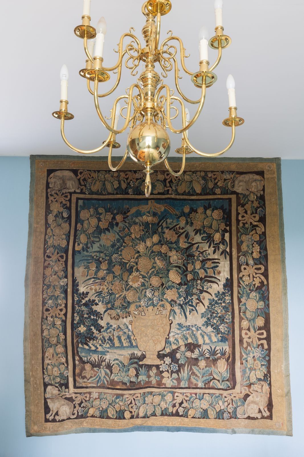 The highly decorative central composition is framed by a beautiful wide border decorated with garlands of flowers and fruit au naturel tied with ribbons. In the four corners of the border is a dog, a symbol of fidelity.