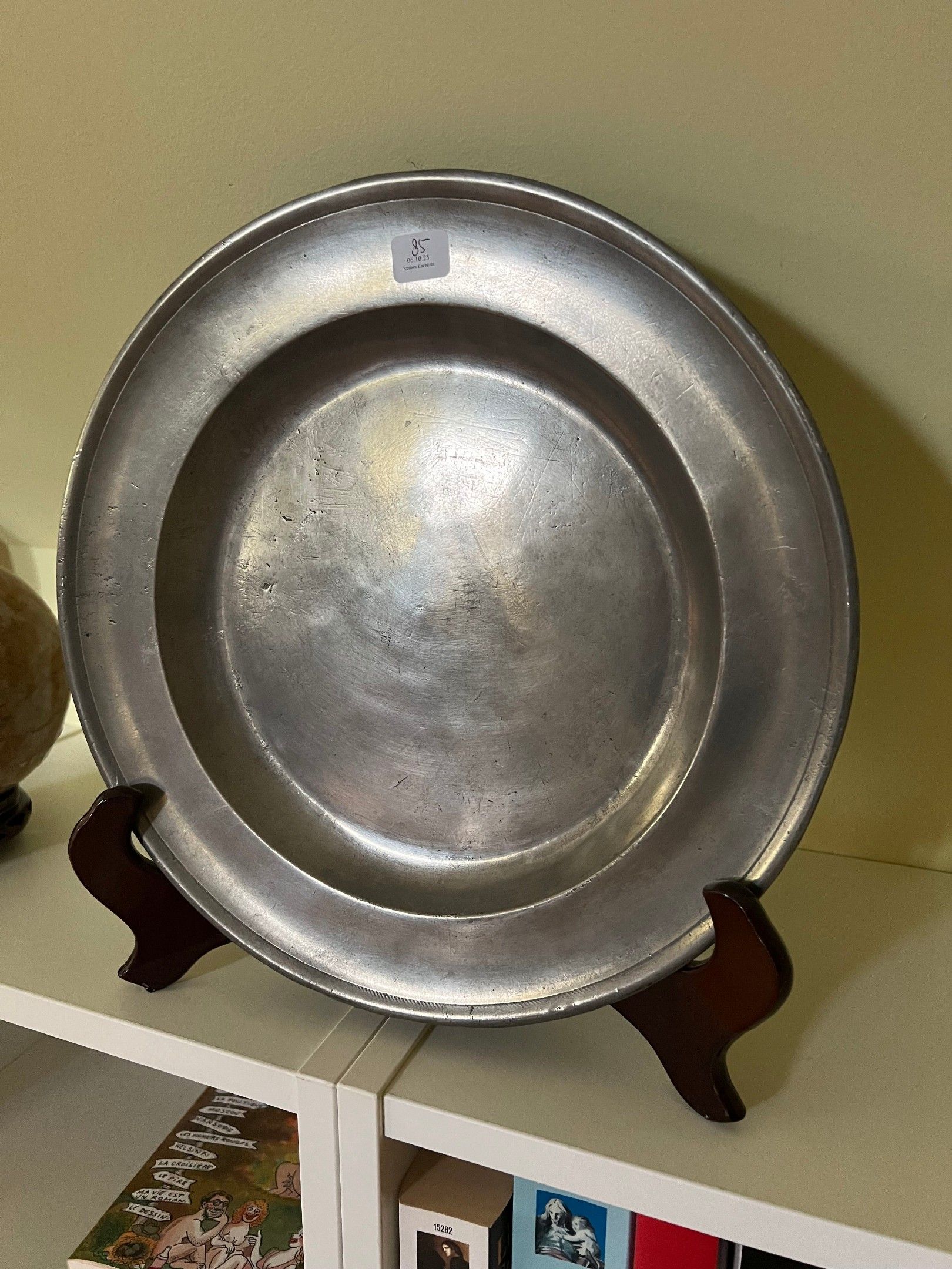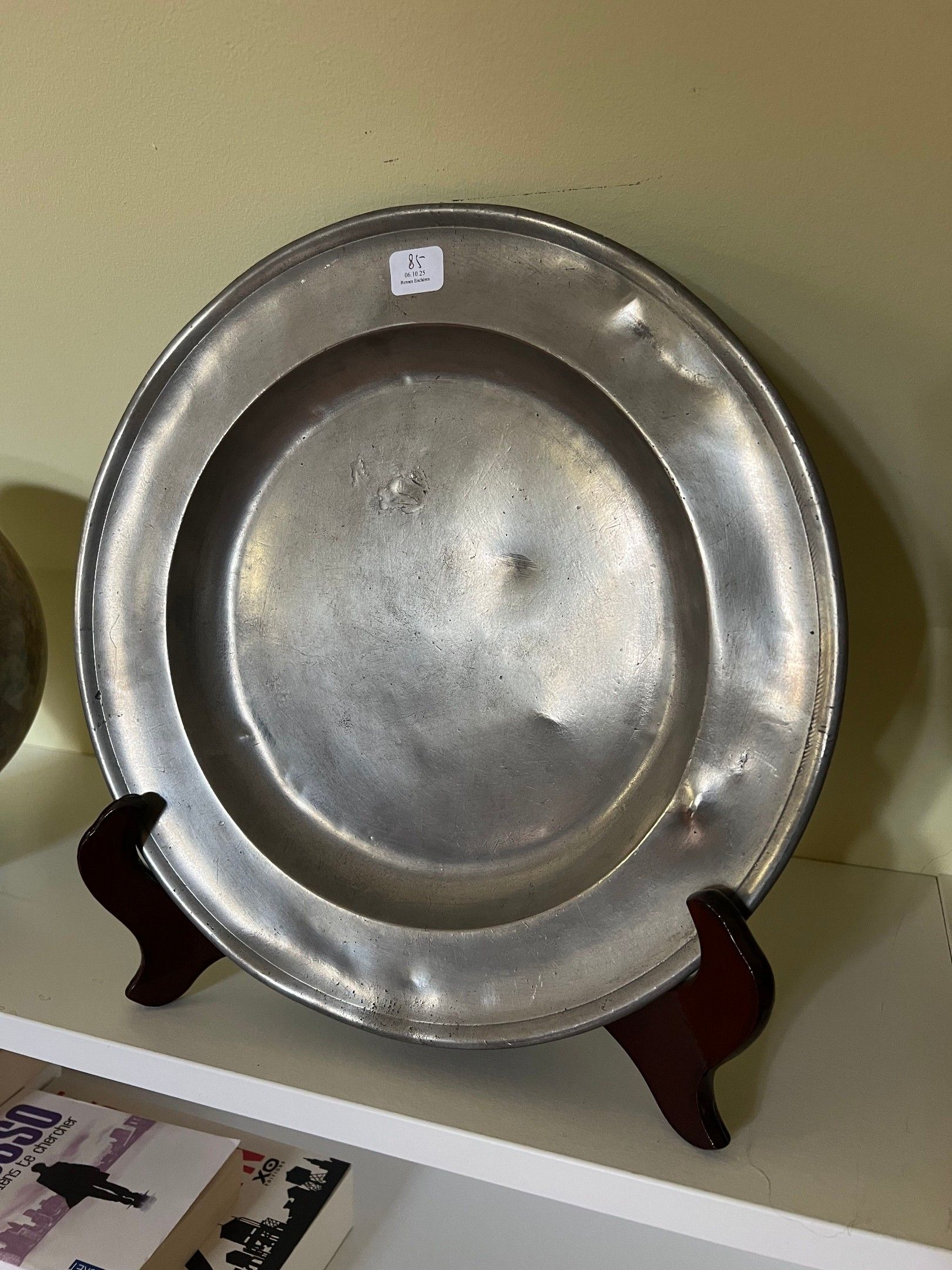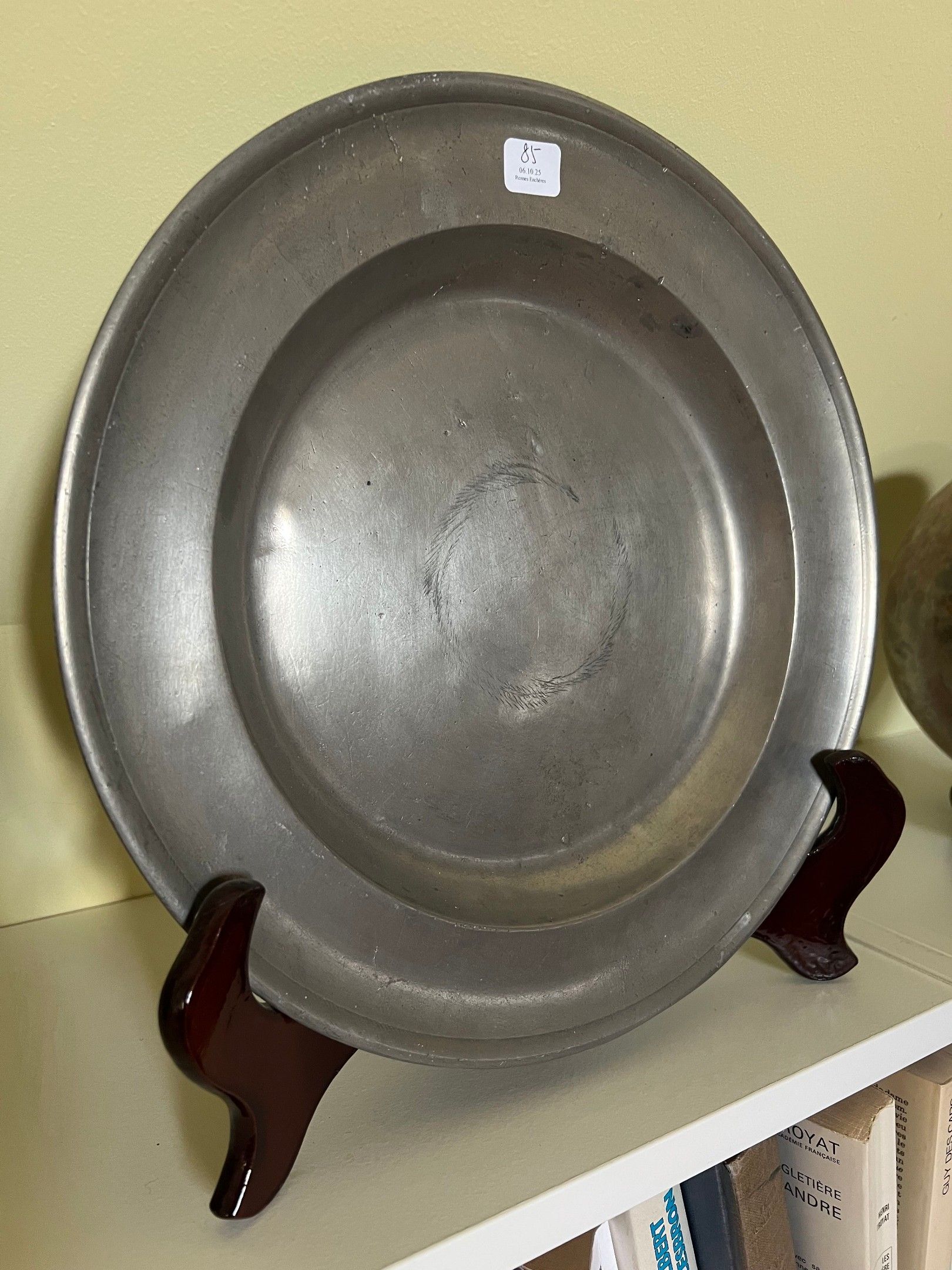 Set comprising four pewter dishes (dents and restorations) and three stone spheres