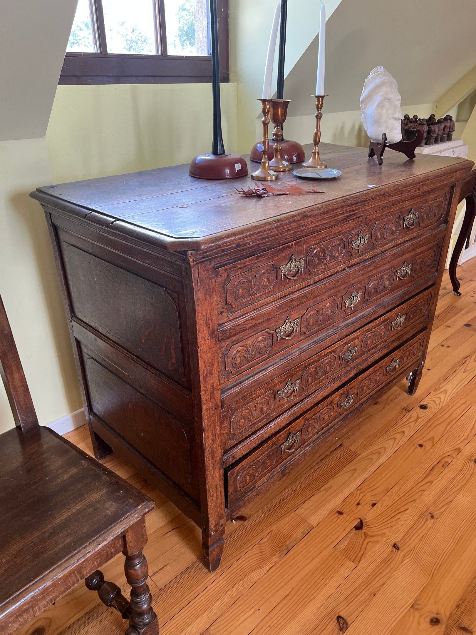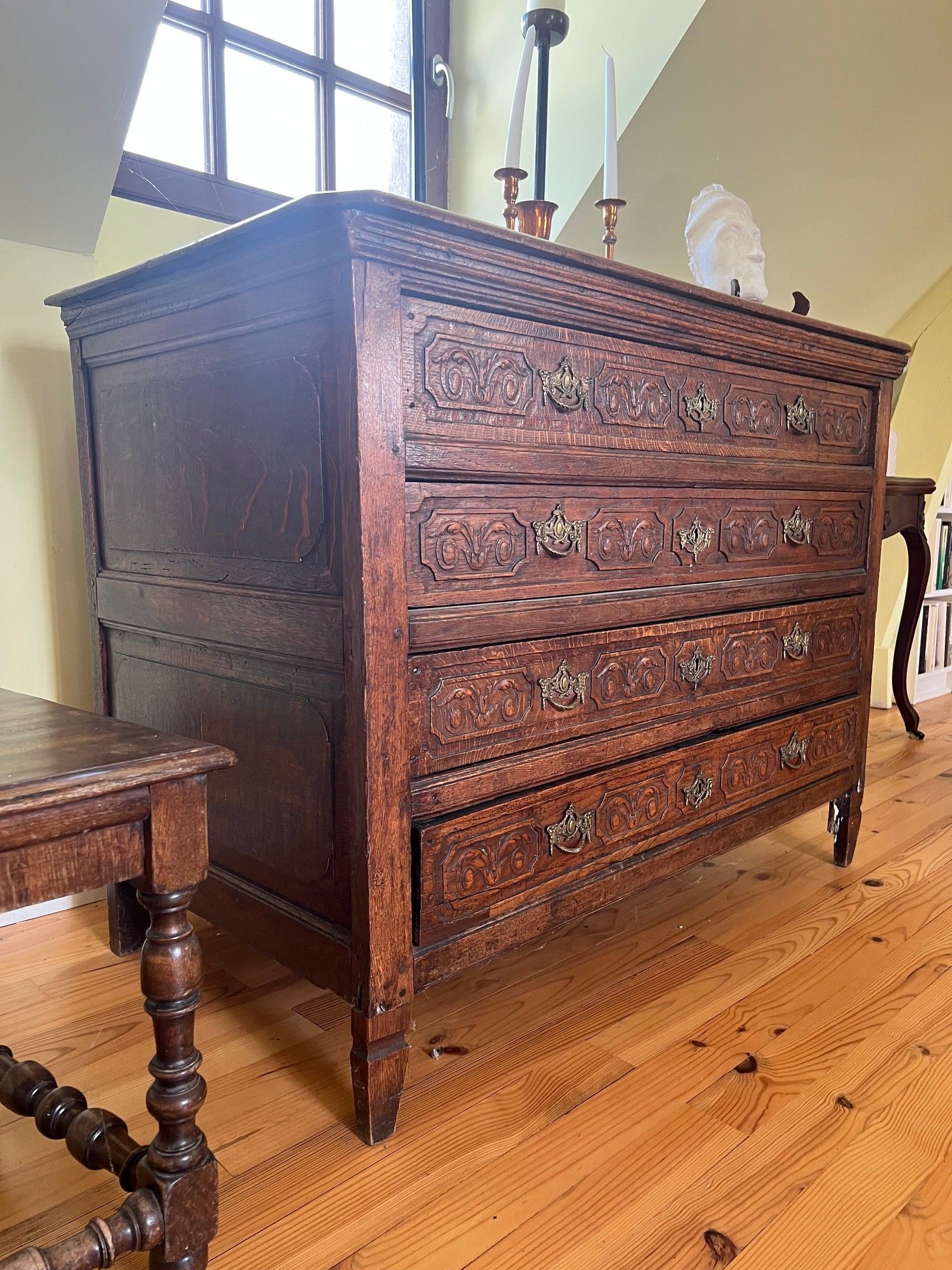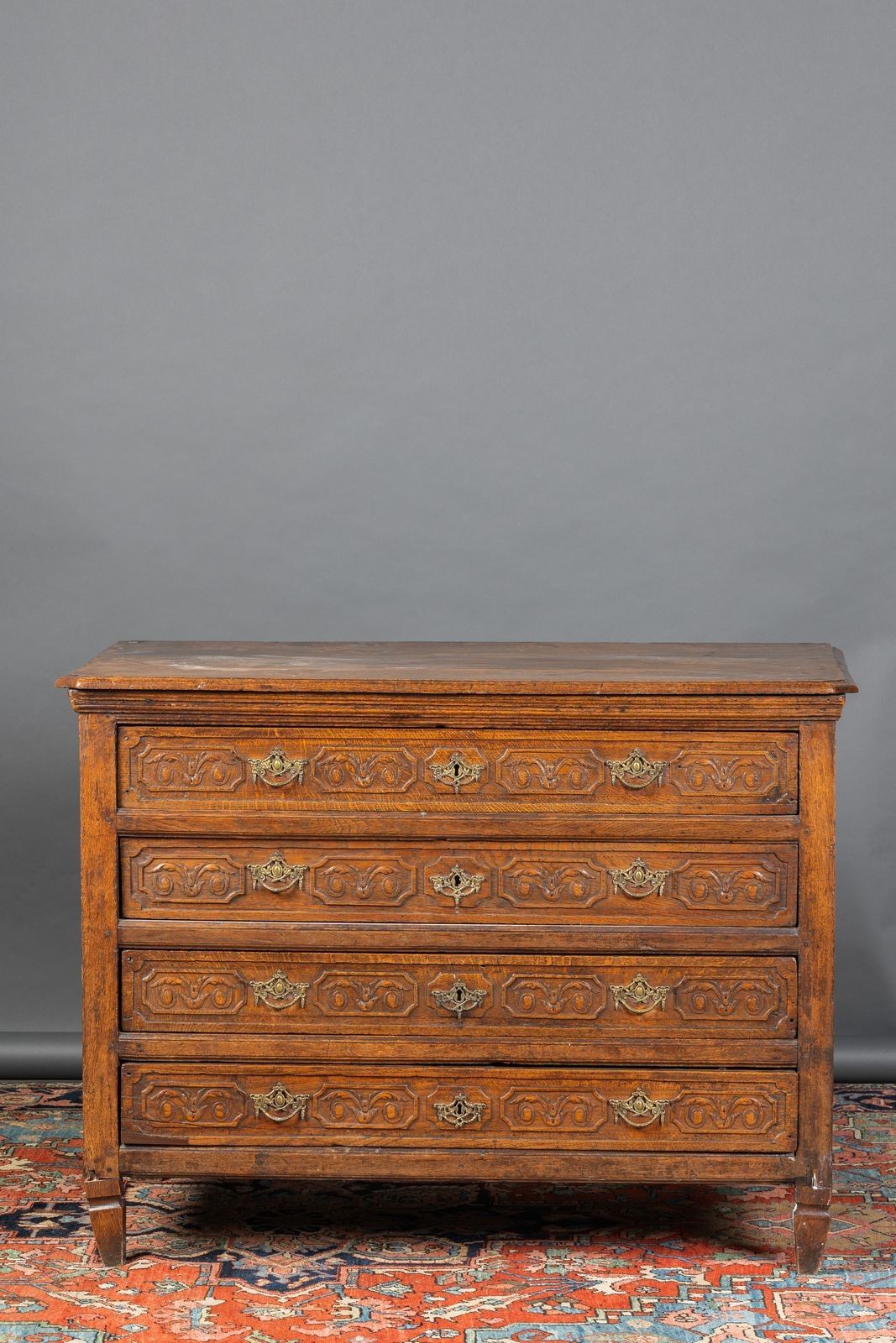 Carved oak chest of drawers decorated with foliage in cartouches. Opening to four drawers, it stands on four sheathed legs. Brass ornamentation: drawer handles - Late 18th-early 19th century (cracks, missing pieces, accidents and restorations, backs)